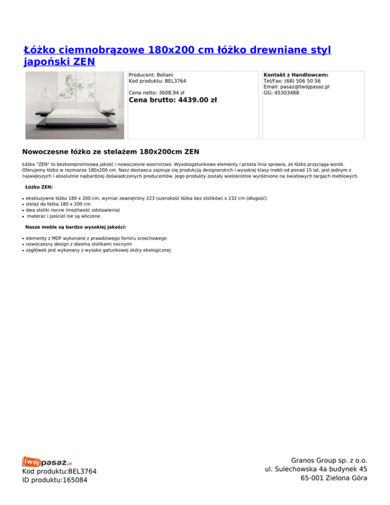 Łóżko ciemnobrązowe 180x200 cm łóżko drewniane styl japoński ZEN Producent: Beliani Kod produktu: BEL3764 Cena netto: 3608,94 zł Kontakt z Handlowcem: Tel/Fax: (68) 506 50 56 Email: [email protected] GG: 45303488 Cena brutto: 4439.00 zł Nowoczesne łóżko ze stelażem 180x200cm ZEN Łóżko "ZEN" to bezkompromisowa jakość i nowoczesne wzornictwo. Wysokogatunkowe elementy i prosta linia sprawia, że łóżko przyciąga wzrok. Oferujemy łóżko w rozmiarze 180x200 cm. Nasz dostawca zajmuje się produkcją designerskich i wysokiej klasy mebli od ponad 15 lat, jest jednym z największych i absolutnie najbardziej doświadczonych producentów. Jego produkty zostały wielokrotnie wyróżnione na światowych targach meblowych. Łóżko ZEN: ● ● ● ● ekskluzywne łóżko 180 x 200 cm, wymiar zewnętrzny 223 (szerokość łóżka bez stolików) x 232 cm (długość) stelaż do łóżka 180 x 200 cm dwa stoliki nocne (możliwość odstawienia) materac i pościel nie są wliczone Nasze meble są bardzo wysokiej jakości: ● ● ● elementy z MDF wykonane z prawdziwego forniru orzechowego nowoczesny design z dwoma stolikami nocnymi zagłówek jest wykonany z wysoko gatunkowej skóry ekologicznej Kod produktu:BEL3764 ID produktu:165084 Granos Group sp. z o.o. ul. Sulechowska 4a budynek 45 65-001 Zielona Góra