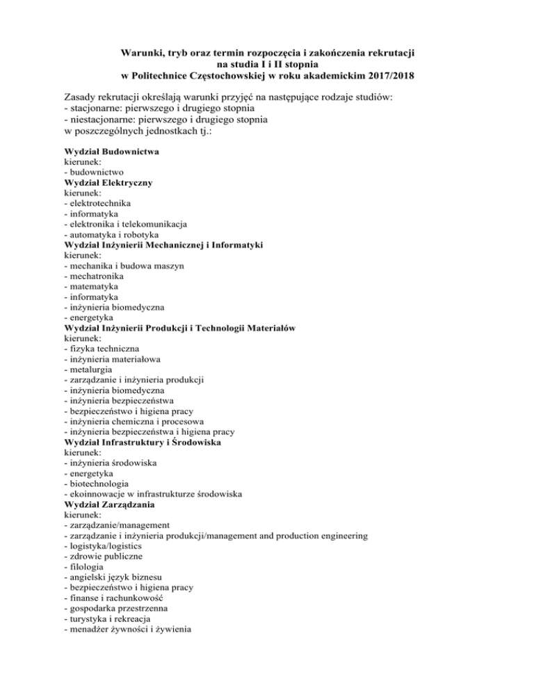 Warunki, tryb oraz termin rozpoczęcia i zakończenia rekrutacji na studia I i II stopnia w Politechnice Częstochowskiej w roku akademickim 2017/2018 Zasady rekrutacji określają warunki przyjęć na następujące rodzaje studiów: - stacjonarne: pierwszego i drugiego stopnia - niestacjonarne: pierwszego i drugiego stopnia w poszczególnych jednostkach tj.: Wydział Budownictwa kierunek: - budownictwo Wydział Elektryczny kierunek: - elektrotechnika - informatyka - elektronika i telekomunikacja - automatyka i robotyka Wydział Inżynierii Mechanicznej i Informatyki kierunek: - mechanika i budowa maszyn - mechatronika - matematyka - informatyka - inżynieria biomedyczna - energetyka Wydział Inżynierii Produkcji i Technologii Materiałów kierunek: - fizyka techniczna - inżynieria materiałowa - metalurgia - zarządzanie i inżynieria produkcji - inżynieria biomedyczna - inżynieria bezpieczeństwa - bezpieczeństwo i higiena pracy - inżynieria chemiczna i procesowa - inżynieria bezpieczeństwa i higiena pracy Wydział Infrastruktury i Środowiska kierunek: - inżynieria środowiska - energetyka - biotechnologia - ekoinnowacje w infrastrukturze środowiska Wydział Zarządzania kierunek: - zarządzanie/management - zarządzanie i inżynieria produkcji/management and production engineering - logistyka/logistics - zdrowie publiczne - filologia - angielski język biznesu - bezpieczeństwo i higiena pracy - finanse i rachunkowość - gospodarka przestrzenna - turystyka i rekreacja - menadżer żywności i żywienia 1. Warunki formalne 1.1 Kandydaci na studia stacjonarne i niestacjonarne zobowiązani są do złożenia w wyznaczonym terminie na poszczególne wydziały następujących dokumentów: - podanie o przyjęcie na studia (na specjalnym formularzu, wydrukowanym z systemu Internetowej Rejestracji Kandydatów IRK), - poświadczoną przez Politechnikę Częstochowską kopię: o świadectwa dojrzałości – w przypadku kandydatów na studia I stopnia, o dyplomu ukończenia studiów – w przypadku kandydatów na studia II stopnia, - potwierdzenie wniesienia opłaty za postępowanie kwalifikacyjne, - poświadczoną przez Politechnikę Częstochowską kopię dowodu osobistego, - aktualne 3 zdjęcia legitymacyjne kandydata, zgodne z wymaganiami stosowanymi przy wydawaniu dowodów osobistych. W związku z prowadzoną rekrutacją internetową, złożenie ww. dokumentów będzie poprzedzone rejestracją kandydatów w systemie IRK. 1.2 Złożenie przez kandydata ww. dokumentów jest równoznaczne z wyrażeniem zgody na umieszczenie jego nazwiska na listach przyjętych i listach rezerwowych oraz zgody na przetwarzanie danych w ramach procedur rekrutacyjnych. 1.3 Kandydaci na studia I stopnia – obywatele polscy oraz osoby nie będący obywatelami polskimi, którzy ubiegają się o przyjęcie na studia na zasadach obowiązujących obywateli polskich, jeżeli ukończyli szkołę średnią za granicą, składają zalegalizowane lub opatrzone apostille zagraniczne świadectwo lub inny dokument uzyskany za granicą, uprawniający do ubiegania się o przyjęcia na studia w uczelniach każdego typu w państwie, w którego systemie działa instytucja wydająca świadectwo. 1.4 Do zagranicznego świadectwa lub innego dokumentu uzyskanego za granicą, o którym mowa w punkcie 1.3, należy dołączyć tłumaczenie na język polski, sporządzone przez tłumacza przysięgłego oraz decyzję administracyjną dotyczącą uznania w Rzeczypospolitej Polskiej świadectwa lub innego dokumentu albo potwierdzenia wykształcenia lub uprawnień do ubiegania się o przyjęcie na studia wyższe uzyskanych za granicą chyba, że świadectwo lub inny dokument uzyskany za granicą zostanie uznany za równoważny odpowiedniemu polskiemu świadectwu dojrzałości lub uprawniający do podjęcia studiów w Rzeczypospolitej Polskiej na podstawie umowy międzynarodowej lub na podstawie przepisów ustawy z dnia 7 września 1991 r. o systemie oświaty (tekst jednolity Dz. U. z 2015 r. poz. 2156). 1.5 Kandydaci na studia II stopnia – obywatele polscy oraz osoby nie będący obywatelami polskimi, którzy ubiegają się o przyjęcie na studia na zasadach obywateli polskich, jeżeli ukończyli uczelnię za granicą, składają zalegalizowany lub opatrzony apostille zagraniczny dyplom ukończenia studiów lub inny dokument ukończenia uczelni za granicą, uprawniający do podjęcia studiów drugiego stopnia w państwie, w którym został wydany. 1.6 Do zagranicznego dyplomu ukończenia studiów lub innego dokumentu ukończenia uczelni za granicą, o którym mowa w punkcie 1.5, należy dołączyć tłumaczenie na język polski, sporządzone przez tłumacza przysięgłego oraz zaświadczenie o nostryfikacji chyba, że zostanie on uznany za równorzędny z odpowiednim polskim dyplomem ukończenia studiów lub za uprawniający do podjęcia studiów II stopnia w Rzeczypospolitej Polskiej na podstawie umowy międzynarodowej lub na podstawie przepisów ustawy z dnia 27 lipca 2005 roku Prawo o szkolnictwie wyższym (tekst jednolity Dz. U. z 2016 r. poz. 1842). 2 1.7 Jeżeli podczas rekrutacji nie zostanie złożona decyzja, o której mowa w pkt 1.4 lub zaświadczenie, o którym mowa w pkt 1.6, kandydat zobowiązany jest do ich dostarczenia w terminie nie dłuższym niż do końca pierwszego semestru studiów, a w uzasadnionych przypadkach niezależnych od cudzoziemca, również w terminie późniejszym ustalonym przez Rektora Politechniki Częstochowskiej. 1.8 Przyjęcie na studia osób niebędących obywatelami polskimi (cudzoziemców) następuje w trybie przewidzianym w art. 43 i 44 ustawy z dnia 27 lipca 2005 roku Prawo o szkolnictwie wyższym (tekst jednolity Dz. U. z 2016 r. poz. 1842) oraz w Rozporządzeniu Ministra Nauki i Szkolnictwa Wyższego z dnia 12 października 2006 r. w sprawie podejmowania i odbywania przez cudzoziemców studiów i szkoleń oraz ich uczestniczenia w badaniach naukowych i pracach rozwojowych (tekst jednol