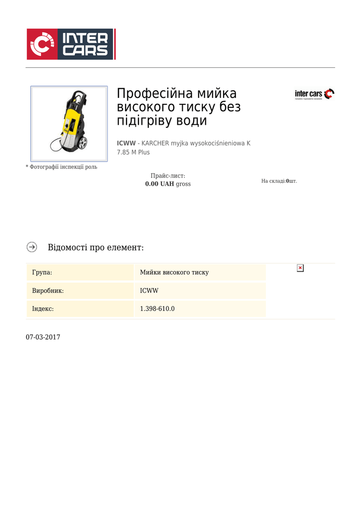 Професійна мийка високого тиску без підігріву води ICWW - KARCHER myjka wysokociśnieniowa K 7.85 M Plus * Фотографії інспекції роль Прайс-лист: 0.00 UAH gross Відомості про елемент: Група: Мийки високого тиску Виробник: ICWW Індекс: 1.398-610.0 07-03-2017 На складі:0шт.