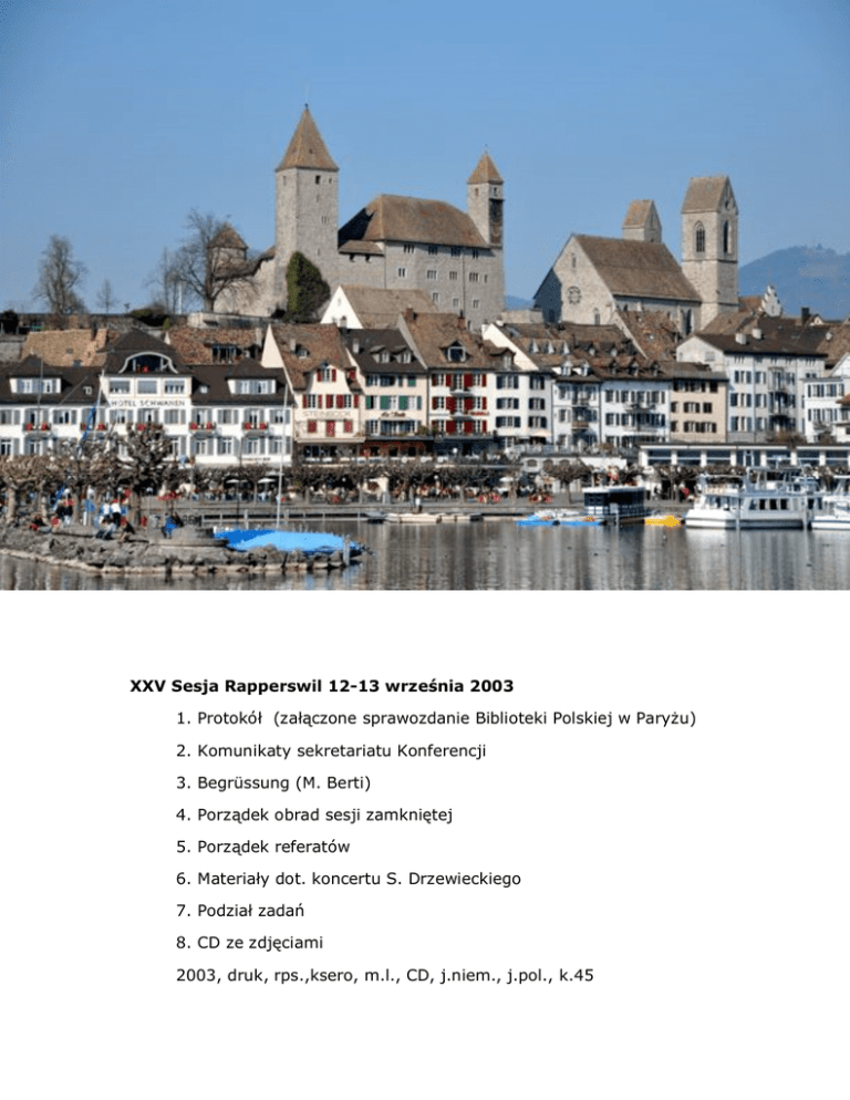 XXV Sesja Rapperswil 12-13 września 2003 1. Protokół (załączone sprawozdanie Biblioteki Polskiej w Paryżu) 2. Komunikaty sekretariatu Konferencji 3. Begrüssung (M. Berti) 4. Porządek obrad sesji zamkniętej 5. Porządek referatów 6. Materiały dot. koncertu S. Drzewieckiego 7. Podział zadań 8. CD ze zdjęciami 2003, druk, rps.,ksero, m.l., CD, j.niem., j.pol., k.45 80. XXV Sesja Rapperswil 12-13 września 2003 Sprawozdania z działalności 1. Instytut J. Piłsudskiego w Ameryce 2. Instytut J. Piłsudskiego w Londynie 2003, druk, poszyt., m.l., j.ang., j.pol., k.41 82. XXV Sesja Rapperswil 12-13 września 2003 Referaty: B 1. Bańkowska B., Rola bibliotek polonijnych z okresu II wojny światowej w kształtowaniu świadomości narodowej Polaków (2 egz.+dyskietka) 2. Bilikiewicz-Blanc D., Polskie eksteriorika w Bibliotece Narodowej, ich rola w utrwalaniu tożsamości narodowej oraz w badaniach recepcji polskiej nauki i kultury w świecie (2 egz.+ 2 dyskietki) 3 Bobrowska-Jakubowska E., O roli prywatnych kolekcji w utrzymaniu tożsamości i więzi narodowej Polaków na przykładzie kolekcji polskich czy polonijnych w Ameryce (2 egz.+ dyskietka) 4. Butkiewicz M., Biblioteka KUL jako warsztat kształtowania katolickich elit intelektualnych w dobie zniewolenia komunistycznego (dyskietka) 2003, druk, m.l., załączone 5 dyskietek, k. 95 82. XXV Sesja Rapperswil 12-13 września 2003 Referaty: K – M 1. Konopka J., Narodowa i międzynarodowa rola Muzeum Kościuszki w Solurze i Muzeum Paderewskiego w Morges 2. Korga I., Zbiory i archiwa Instytutu Piłsudskiego w Nowym Jorku wyrazem zaangażowania polskich elit politycznych w USA po 1945 w sprawę walki o Polskę niepodległą 3. Kowalski Z., Wspomnienie o marszałkowej A. Piłsudskiej w 100 rocznicę jej urodzin (…) 4. Lachowicz T., Rola archiwum i muzeum Stowarzyszenia Weteranów Armii Polskiej w Ameryce w pielęgnowaniu niepodległościowych tradycji wychodżctwa Polskiego w Stanach Zjednoczonych w Kanadzie 5. Lipniacka E., Biblioteka Polska w Londynie a emigracje, Kraj i Wielka Brytania (dyskietka) 6., Morkowski J., Kolumna Barska w Rapperswilu symbolem polskich aspiracji i nadziei 7. Mossakowska M., Rola sztuki ludowej w podtrzymywaniu tożsamości narodowej Polaków na emigracji 2003, druk, m.l., załączone dyskietki, k.59 83. XXV Sesja Rapperswil 12-13 września 2003 Referaty: R – Su 1. Romer T., Cztery pokolenia Dunin-Jundziłłów w Szwajcarii 18301960 2. Rottermund A., O roli muzeów polskich w kształtowaniu świadomości narodowej i politycznej Polaków (2 egz. + dyskietka) 3. Siomkajło A., Muzeum Katyńskie – świadectwo i pamięć (2 egz. + dyskietka) 4. Siomkajło A., O Bibliotece Polskiej w Londynie uwagi krytyczne 5. Stoliński K., Pomoc finansowa dla Armii Krajowej (dyskietka) 5. Stoliński K., Zasoby archiwalne Studium Polski Podziemnej 6. Sutarski K., Muzeum i Archiwum Węgierskiej Polonii 2003, druk, m.l., załączone dyskietki, materiały ulotne, k. 71 Referaty: Sz – Z 1. Szkuta A.J., $lady zbiorów rapperswilskich w bibliotece Instytutu Polskiego i Muzeum im. gen. Sikorskiego (2 egz. + dyskietka + CD) 2. Szkuta A.J., O zbiorach pism wojskowych i obozowych w bibliotece IPiMS 3. Zaleski C.P., [Ref. poświęcony L.Talko] 4. Zieliński J., Rafael ze zbiorów Krasińskich czy Krasickiego? Na tropach pewnego obrazu i pewnej kamei 2003, druk, m.l., załączone dyskietki i płyta CD, k. 61 1. Formularze zgłoszeń 2. Listy zgłoszonych uczestników sesji, listy hotelowe i adresowe 2003, mps., rps., druk, ksero, m.l., k.51 Korespondencja przychodząca Korespondencja wychodząca 2003, druk, rkp., fax., k. 25