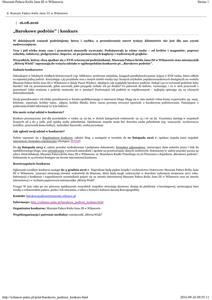 Muzeum Pałacu Króla Jana III w Wilanowie Strona 1 © Mu ze um P ałac u Kró l a Jan a II I w Wi la no wi e | 16.08.2016 „Barokowe podróże” | konkurs W dzisiejszych czasach podróżujemy łatwo i szybko, a przemierzanie nawet tysięcy kilometrów nie jest dla nas czymś nadzwyczajnym. Trzy i pół wieku temu czas i przestrzeń stanowiły wyzwanie. Podejmowały je różne osoby – od królów i magnatów, poprzez szlachtę, żołnierzy, pielgrzymów, kupców, aż po jarmarcznych kuglarzy i wędrownych grajków. Wszystkich, którzy chcą spotkać się z XVII-wiecznymi podróżnikami, Muzeum Pałacu Króla Jana III w Wilanowie oraz miesięcznik „Mówią Wieki” zapraszają do wzięcia udziału w ogólnopolskim konkursie pt. „Barokowe podróże”. Zadanie konkursowe Odszukajcie w lokalnych źródłach historycznych (np. bibliotece, archiwum miejskim, księgach parafialnych) postać żyjącą w XVII wieku, która odbyła co najmniej jedną podróż. Korzystając z jej przykładu oraz z innych źródeł wiedzy (np. licznych artykułów popularnonaukowych dostępnych na wortalu Muzeum Pałacu Króla Jana III w Wilanowie w dziale Pasaż Wiedzy), zbadajcie, jak wyglądały barokowe podróże. Dokąd i po co wyruszali podróżni doby baroku? Jak się przemieszczali, gdzie nocowali, jakie przygody czekały ich po drodze? Co pakowali do kufrów, wyruszając, i co w nich przywozili z powrotem? Jakie wrażenia z podróży zostawały im w pamięci? Porównajcie ich podróże ze współczesnymi – najlepiej opierając się na własnych doświadczeniach. Swoje poszukiwania i ich efekty przedstawcie w formie opublikowanego w internecie bloga. Mogą się w nim znaleźć różne formy wypowiedzi, np. eseje, felietony, reportaże, krótkie wpisy, zdjęcia, krótkie filmiki, które razem powinny stworzyć opowieść o barokowym podróżowaniu. Pamiętajcie o podawaniu źródeł informacji (w tym linków). Kto może wziąć udział w konkursie? Konkurs przeznaczony jest dla uczestników w wieku 13–19 lat, w dwóch kategoriach wiekowych: 13–15 i 16–19 lat. Uczestnicy startują w zespołach liczących od 2 do 5 osób, pod opieką osoby pełnoletniej. Opiekunem zespołu może być dowolna osoba pełnoletnia (np. nauczyciel, wychowawca świetlicy, pracownik domu kultury, instruktor harcerski, osoba prywatna). Jak zgłosić swój udział w konkursie? Należy zapoznać się z Regulaminem konkursu, założyć blog, a następnie w terminie do 10 listopada 2016 r. opiekun zespołu musi wypełnić internetowy formularz rejestracyjny (dostępny TUTAJ). Do 25 listopada 2015 r. należy przesłać wydrukowane i podpisane dokumenty: formularz zgłoszeniowy, zawierający dane autorów pracy i link do opublikowanego bloga, oraz oświadczenia o prawach autorskich i zgodzie na przetwarzanie danych osobowych. Dokumenty te należy przesłać pocztą na adres: Dział Edukacji, Muzeum Pałacu Króla Jana III w Wilanowie, ul. Stanisława Kostki Potockiego 10/16 Warszawa z dopiskiem „Barokowe podróże”. Dokumenty te są również dostępne na stronie internetowej konkursu. Rozstrzygnięcie konkursu Ogłoszenie wyników konkursu nastąpi do 5 grudnia 2016 r. Nagrodami będą piękne książki i wydawnictwa historyczne Muzeum Pałacu Króla Jana III w Wilanowie. Laureaci otrzymają również wejściówki do Muzeum, które będą mogli wykorzystać w dowolnie wybranym momencie 2017 roku. Informacja o konkursie i nagrodzonych uczestnikach pojawi się na stronie internetowej Muzeum Pałacu Króla Jana III w Wilanowie oraz na stronie internetowej i w wydaniu papierowym miesięcznika „Mówią Wieki”. Uwaga! W tym roku po raz pierwszy opiekunowie wszystkich zespołów otrzymają darmowy dostęp do platformy e-learningowej, zawierającej kurs wiedzy o wilanowskim pałacu, parku i ich otoczeniu, a także o historii i kulturze dawnej Rzeczpospolitej. Kontakt: [email protected] Informacje: http://wilanow-palac.pl/barokowe_podroze_konkurs.html Organizator konkursu: Muzeum Pałacu Króla Jana III w Wilanowie Współorganizacja i patronat medialny: miesięcznik „Mówią Wieki” http://wilanow-palac.pl/print/barokowe_podroze_konkurs.html 2016-09-26 09:55:11