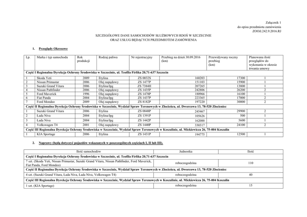 Załącznik 1 do opisu przedmiotu zamówienia ZOOiI.242.9.2016.RJ SZCZEGÓŁOWE DANE SAMOCHODÓW SŁUŻBOWYCH RDOŚ W SZCZECINIE ORAZ USŁUG BĘDĄCYCH PRZEDMIOTEM ZAMÓWIENIA 1. Lp. Przeglądy Okresowe Marka i typ samochodu Rok produkcji Rodzaj paliwa Nr rejestracyjny Przebieg na dzień 30.09.2016 (km) Przewidywany roczny przebieg (km) Planowana ilość przeglądów do wykonania w okresie trwania umowy Część I Regionalna Dyrekcja Ochrony Środowiska w Szczecinie, ul. Teofila Firlika 20,71-637 Szczecin 1 Skoda Yeti 2009 Etylina ZS 0032S 160203 2 Nissan Primastar 2006 Olej napędowy ZS 1477P 151103 3 Suzuki Grand Vitara 2006 Etylina/lpg ZS 7384H 207265 4 Nissan Pathfinder 2006 Olej napędowy ZS 1435P 242806 5 Ford Maverick 1996 Olej napędowy ZS 1478P 180966 6 Fiat Panda 2004 Etylina/lpg ZS 1437P 223365 7 Ford Mondeo 2009 Olej napędowy ZS 8182P 197220 Część II Regionalna Dyrekcja Ochrony Środowiska w Szczecinie, Wydział Spraw Terenowych w Złocieńcu, ul. Dworcowa 13, 78-520 Złocieniec 1 Suzuki Grand Vitara 2006 Etylina ZS 0848P 245467 2 Łada Niva 2004 Etylina/lpg ZS 1391P 105626 3 Łada Niva 2004 Etylina/lpg ZS 1442P 162088 4 Volkswagen T4 2001 Olej napędowy ZS 1440P 330317 Część III Regionalna Dyrekcja Ochrony Środowiska w Szczecinie, Wydział Spraw Terenowych w Koszalinie, ul. Mickiewicza 26, 75-004 Koszalin 1 KIA Sportage 2006 Etylina ZS 1431P 194775 2. 17300 15900 13800 26200 16100 17000 30000 1 1 1 2 1 2 2 29900 500 5600 24100 2 1 1 2 12500 1 Naprawy (będą dotyczyć pojazdów wskazanych w poszczególnych częściach I, II lub III). Ilość samochodów Jednostka Ilość Część I Regionalna Dyrekcja Ochrony Środowiska w Szczecinie, ul. Teofila Firlika 20,71-637 Szczecin 7 szt. (Skoda Yeti, Nissan Primastar, Suzuki Grand Vitara, Nissan Pathfinder, Ford Maverick, roboczogodzina Fiat Panda, Ford Mondeo) Część II Regionalna Dyrekcja Ochrony Środowiska w Szczecinie, Wydział Spraw Terenowych w Złocieńcu, ul. Dworcowa 13, 78-520 Złocieniec 110 4 szt. (Suzuki Grand Vitara, Łada Niva, Łada Niva, Volkswagen T4) 40 roboczogodzina Część III Regionalna Dyrekcja Ochrony Środowiska w Szczecinie, Wydział Spraw Terenowych w Koszalinie, ul. Mickiewicza 26, 75-004 Koszalin 1 szt. (KIA Sportage) roboczogodzina 15 3. Wymiana opon (zimowe/letnie) Lp. Marka i typ samochodu Felga Wymiana opon planowana w okresie trwania umowy - ilość Część I: Regionalna Dyrekcja Ochrony Środowiska w Szczecinie, ul. Teofila Firlika 20,71-637 Szczecin Skoda Yeti Aluminiowa 1 2 Nissan Primastar Stalowa 2 2 Suzuki Grand Vitara Stalowa 3 2 Nissan Pathfinder Aluminiowa 4 2 Ford Maverick Stalowa 5 2 Fiat Panda Stalowa 6 2 Ford Mondeo Stalowa 7 2 Część II: Regionalna Dyrekcja Ochrony Środowiska w Szczecinie, Wydział Spraw Terenowych w Złocieńcu, ul. Dworcowa 13, 78-520 Złocieniec Suzuki Grand Vitara Stalowa 1 2 Łada Niva Stalowa 2 2 Łada Niva Stalowa 3 2 Volkswagen T4 Stalowa 4 2 Część III: Regionalna Dyrekcja Ochrony Środowiska w Szczecinie, Wydział Spraw Terenowych w Koszalinie, ul. Mickiewicza 26, 75-004 Koszalin KIA Sportage Stalowa 1 2 4. Wulkanizacja i wymiana ogumienia Lp. Marka i typ samochodu Felga Wulkanizacja i wymiana ogumienia planowana w okresie trwania umowy - ilość Część I: Regionalna Dyrekcja Ochrony Środowiska w Szczecinie, ul. Teofila Firlika 20,71-637 Szczecin Skoda Yeti Aluminiowa 1 1 Nissan Primastar Stalowa 2 1 Suzuki Grand Vitara Stalowa 3 1 Nissan Pathfinder Aluminiowa 4 1 Ford Maverick Stalowa 5 1 Fiat Panda Stalowa 6 1 Ford Mondeo stalowa 7 1 Część II: Regionalna Dyrekcja Ochrony Środowiska w Szczecinie, Wydział Spraw Terenowych w Złocieńcu, ul. Dworcowa 13, 78-520 Złocieniec Suzuki Grand Vitara Aluminiowa 1 1 Łada Niva Stalowa 2 1 Łada Niva Stalowa 3 1 Volkswagen T4 Stalowa 4 1 Część III: Regionalna Dyrekcja Ochrony Środowiska w Szczecinie, Wydział Spraw Terenowych w Koszalinie, ul. Mickiewicza 26, 75-004 Koszalin KIA Sportage Stalowa 1 1 5. Klimatyzacja – pakiet serwisowy Lp. Marka i typ samochodu Klimatyzacja – pakiet serwisowy – ilość planowana w okresie trwania umowy Część I: Regionalna Dyrekcja Ochrony Środowiska w Szczecinie, ul. Teofila Firlika 20,71-637 Szczecin Skoda Yeti 1 1 Suzuki Grand Vitara 2 1 Nissan Pathfinder 3 1 Ford Mondeo 4 1 Część II: Regionalna Dyrekcja Ochrony Środowiska w Szczecinie, Wydział Spraw Terenowych w Złocieńcu, ul. Dworcowa 13, 78-520 Złocieniec Suzuki Grand Vitara 1 1 Część III: Regionalna Dyrekcja Ochrony Środowiska w Szczecinie, Wydział Spraw Terenowych w Koszalinie, ul. Mickiewicza 26, 75-004 Koszalin KIA Sportage 1 1