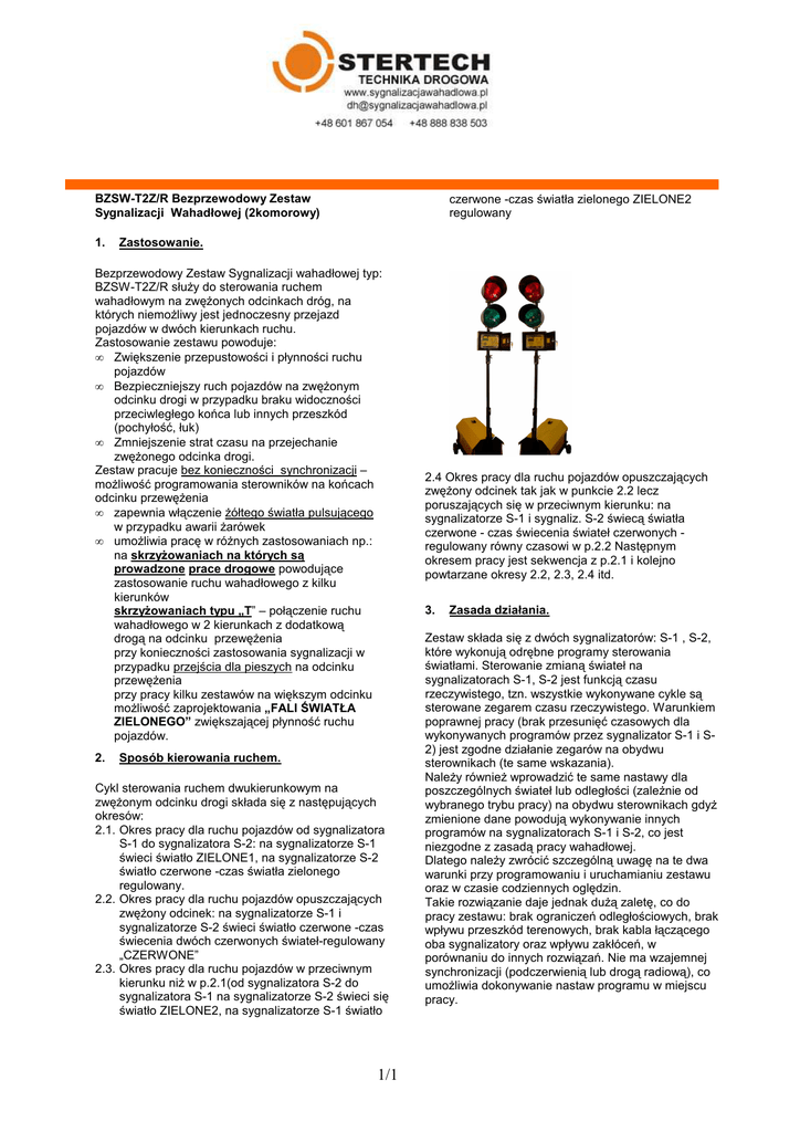 BZSW-T2Z/R Bezprzewodowy Zestaw Sygnalizacji Wahadłowej (2komorowy) 1. czerwone -czas światła zielonego ZIELONE2 regulowany Zastosowanie. Bezprzewodowy Zestaw Sygnalizacji wahadłowej typ: BZSW-T2Z/R służy do sterowania ruchem wahadłowym na zwężonych odcinkach dróg, na których niemożliwy jest jednoczesny przejazd pojazdów w dwóch kierunkach ruchu. Zastosowanie zestawu powoduje: • Zwiększenie przepustowości i płynności ruchu pojazdów • Bezpieczniejszy ruch pojazdów na zwężonym odcinku drogi w przypadku braku widoczności przeciwległego końca lub innych przeszkód (pochyłość, łuk) • Zmniejszenie strat czasu na przejechanie zwężonego odcinka drogi. Zestaw pracuje bez konieczności synchronizacji – możliwość programowania sterowników na końcach odcinku przewężenia • zapewnia włączenie żółtego światła pulsującego w przypadku awarii żarówek • umożliwia pracę w różnych zastosowaniach np.: na skrzyżowaniach na których są prowadzone prace drogowe powodujące zastosowanie ruchu wahadłowego z kilku kierunków skrzyżowaniach typu „T” – połączenie ruchu wahadłowego w 2 kierunkach z dodatkową drogą na odcinku przewężenia przy konieczności zastosowania sygnalizacji w przypadku przejścia dla pieszych na odcinku przewężenia przy pracy kilku zestawów na większym odcinku możliwość zaprojektowania „FALI ŚWIATŁA ZIELONEGO” zwiększającej płynność ruchu pojazdów. 2. Sposób kierowania ruchem. Cykl sterowania ruchem dwukierunkowym na zwężonym odcinku drogi składa się z następujących okresów: 2.1. Okres pracy dla ruchu pojazdów od sygnalizatora S-1 do sygnalizatora S-2: na sygnalizatorze S-1 świeci światło ZIELONE1, na sygnalizatorze S-2 światło czerwone -czas światła zielonego regulowany. 2.2. Okres pracy dla ruchu pojazdów opuszczających zwężony odcinek: na sygnalizatorze S-1 i sygnalizatorze S-2 świeci światło czerwone -czas świecenia dwóch czerwonych świateł-regulowany „CZERWONE” 2.3. Okres pracy dla ruchu pojazdów w przeciwnym kierunku niż w p.2.1(od sygnalizatora S-2 do sygnalizatora S-1 na sygnalizatorze S-2 świeci się światło ZIELONE2, na sygnalizatorze S-1 światło 1/1 2.4 Okres pracy dla ruchu pojazdów opuszczających zwężony odcinek tak jak w punkcie 2.2 lecz poruszających się w przeciwnym kierunku: na sygnalizatorze S-1 i sygnaliz. S-2 świecą światła czerwone - czas świecenia świateł czerwonych regulowany równy czasowi w p.2.2 Następnym okresem pracy jest sekwencja z p.2.1 i kolejno powtarzane okresy 2.2, 2.3, 2.4 itd. 3. Zasada działania. Zestaw składa się z dwóch sygnalizatorów: S-1 , S-2, które wykonują odrębne programy sterowania światłami. Sterowanie zmianą świateł na sygnalizatorach S-1, S-2 jest funkcją czasu rzeczywistego, tzn. wszystkie wykonywane cykle są sterowane zegarem czasu rzeczywistego. Warunkiem poprawnej pracy (brak przesunięć czasowych dla wykonywanych programów przez sygnalizator S-1 i S2) jest zgodne działanie zegarów na obydwu sterownikach (te same wskazania). Należy również wprowadzić te same nastawy dla poszczególnych świateł lub odległości (zależnie od wybranego trybu pracy) na obydwu sterownikach gdyż zmienione dane powodują wykonywanie innych programów na sygnalizatorach S-1 i S-2, co jest niezgodne z zasadą pracy wahadłowej. Dlatego należy zwrócić szczególną uwagę na te dwa warunki przy programowaniu i uruchamianiu zestawu oraz w czasie codziennych oględzin. Takie rozwiązanie daje jednak dużą zaletę, co do pracy zestawu: brak ograniczeń odległościowych, brak wpływu przeszkód terenowych, brak kabla łączącego oba sygnalizatory oraz wpływu zakłóceń, w porównaniu do innych rozwiązań. Nie ma wzajemnej synchronizacji (podczerwienią lub drogą radiową), co umożliwia dokonywanie nastaw programu w miejscu pracy. 4. • Dane techniczne. • Dwukomorowe sygnalizatory świetlne typu: WD200 lub MONDIAL Φ200 lub Φ300 oraz WD 200 DUO. • Zasilanie: prąd stały (np. akumulator 12V 165Ah). • Napięcie podtrzymania 12 V (2szt baterii 4R25) z wózka (zalecane opcjonalnie) • Napięcie podtrzymania 9V (bateria 6F22) w sterowniku • Żarówki halogenowe po 2szt. w każdej komorze: 10W, 12 V, typ trzonka G4 lub 1 szt. 20 W typ jw. • Dwa tryby pracy: odległościowy, zwykły, Użytkownik w zależności od potrzeb może dobrać dowolny tryb pracy sygnalizacji wahadłowej. • Zakresy nastaw dla wszystkich sekwencji cyklu pracy z przedziału 0÷99 godzin z dokładnością do 1 sek. • Sterowniki, wykonane w technice mikroprocesorowej, wyposażone w wyświetlacz informujący o stanie pracy zestawu komunikatami tekstowo-cyfrowymi. • Zestaw przystosowany do pracy bezprzewodowej - wyposażony w sterowniki S-1 i S-2 (dowolnie programowane współpracujące ze sobą. praca odbywa się w funkcji czasu odległość między sygnalizatorami dowolna • Max. pobór mocy: układu sterowania1 VA świateł 20VAlub 10 VA • Średni pobór prądu 1,6A • Funkcja regulacji poziomu świecenia świateł w zależności od oświetlenia zewnętrznego – oszczędzanie energii akumulatora. 5. Automatyka i zabezpieczenia. • Sekwencyjne wyświetlanie komunikatów o stanie pracy sygnalizacji • Kontrola stanu baterii 9V (typ 6F22) podtrzymującej zasilanie sterowników na czas wymiany akumulatora • Kontrola stanu dodatkowej baterii 12V (w pojemniku w wózku) podtrzymującej zasilanie sterowników na dłuższy okres (np. ładowanie akumulatora) • Informacja o braku akumulatora (brak połączenia): Wypięty akumulator Wyłączone zasilanie główne (wył.WG – wózek) – podtrzymanie bateryjne nastaw programu • Czujnik oświetlenia zewnętrznego, który steruje mocą żarówek w komorach Obniżony poziom mocy można ustawić dowolnie, standardowo jest to 70% • Bateryjne podtrzymanie pracy zegara oraz pamięć danych ostatnio nastawianego programu w trybie zwykłym lub odległościowym