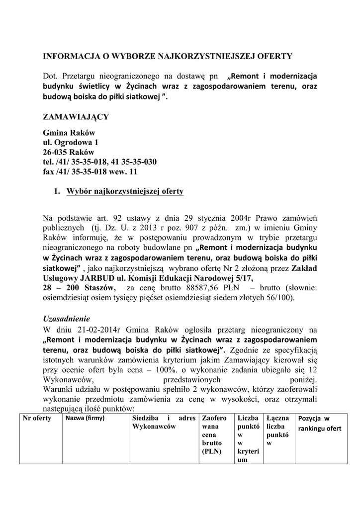INFORMACJA O WYBORZE NAJKORZYSTNIEJSZEJ OFERTY Dot. Przetargu nieograniczonego na dostawę pn „Remont i modernizacja budynku świetlicy w Życinach wraz z zagospodarowaniem terenu, oraz budową boiska do piłki siatkowej ”. ZAMAWIAJĄCY Gmina Raków ul. Ogrodowa 1 26-035 Raków tel. /41/ 35-35-018, 41 35-35-030 fax /41/ 35-35-018 wew. 11 1. Wybór najkorzystniejszej oferty Na podstawie art. 92 ustawy z dnia 29 stycznia 2004r Prawo zamówień publicznych (tj. Dz. U. z 2013 r poz. 907 z późn. zm.) w imieniu Gminy Raków informuję, że w postępowaniu prowadzonym w trybie przetargu nieograniczonego na roboty budowlane pn „Remont i modernizacja budynku w Życinach wraz z zagospodarowaniem terenu, oraz budową boiska do piłki siatkowej” , jako najkorzystniejszą wybrano ofertę Nr 2 złożoną przez Zakład Usługowy JARBUD ul. Komisji Edukacji Narodowej 5/17, 28 – 200 Staszów, za cenę brutto 88587,56 PLN – brutto (słownie: osiemdziesiąt osiem tysięcy pięćset osiemdziesiąt siedem złotych 56/100). Uzasadnienie W dniu 21-02-2014r Gmina Raków ogłosiła przetarg nieograniczony na „Remont i modernizacja budynku w Życinach wraz z zagospodarowaniem terenu, oraz budową boiska do piłki siatkowej”. Zgodnie ze specyfikacją istotnych warunków zamówienia kryterium jakim Zamawiający kierował się przy ocenie ofert była cena – 100%. o wykonanie zadania ubiegało się 12 Wykonawców, przedstawionych poniżej. Warunki udziału w postępowaniu spełniło 2 wykonawców, którzy zaoferowali wykonanie przedmiotu zamówienia za cenę w wysokości, oraz otrzymali następującą ilość punktów: Nr oferty Nazwa (firmy) Siedziba i adres Zaofero Wykonawców wana cena brutto (PLN) Liczba punktó w w kryteri um Łączna liczba punktó w Pozycja w rankingu ofert cena 1 P.H.U. „PEL – BUD” inż. Zbigniew Petelicki ul. Wesoła 23 112557,83 Oferta nie podlega ocenie Wykonawca wykluczony Oferta odrzucona 25 – 353 Kielce 2 Zakład Usługowy JARBUD ul. Komisji Edukacji Narodowej 5/17 28 – 200 Staszów 88587,56 100 3 „GENERICS” Maciej Baradziej Staszów ul. Złota 11 28 – 200 Staszów 123000,00 Oferta nie podlega ocenie Wykonawca wykluczony Oferta odrzucona 4 Zakład Remontowo – Budowlany Zdzisław Gaweł ul. Kopernika 11 28 – 100 Busko - Zdrój 115225,88 Oferta nie podlega ocenie Wykonawca wykluczony Oferta odrzucona 5 Przedsiębiorstwo Wielobranżowe „STOS” Szymon Stojanowski ul. Ściegiennego 124 A 26 – 026 Morawica 111410,07 Oferta nie podlega ocenie Wykonawca wykluczony Oferta odrzucona 6 Przedsiębiorstwo Budowlane PRAKTIW Paweł Ramiączek ul. Domki 3 25 – 204 Kielce 107846,29 Oferta nie podlega ocenie Wykonawca wykluczony Oferta odrzucona 7 Przedsiębiorstwo Handlowo – Usługowe „IKAR” Zbigniew Gregulski Widełki 38A 26 – 021 Daleszyce 120018,04 Oferta nie podlega ocenie Wykonawca wykluczony Oferta odrzucona 8 PBL „ELDAN” Marzena Bryła ul. Poziomkowa 22A 28 – 200 Staszów 91635,00 Oferta nie podlega ocenie Wykonawca wykluczony Oferta odrzucona 9 ELKAMEN s.c. mgr inż. ul. Kołłątaja 3/74 K. Bieszczad, 28 – 200 Staszów M. Burzawa 99455,28 Oferta nie podlega ocenie Wykonawca wykluczony Oferta odrzucona 10 Usługi Remontowo – Budowlane Zbigniew Dziuba ul. Szkolna 31 28 – 200 Koniemłoty 89973,44 Oferta nie podlega ocenie Wykonawca wykluczony Oferta odrzucona 11 HATTBUD Grabka Andrzej Niemścice 36 28 – 200 Staszów 89121,72 Oferta nie podlega ocenie Wykonawca wykluczony Oferta odrzucona 100 1 Przedsiębiorstwo Budowlane „IREX” Ireneusz Zieja 12 ul. Zagnańska 46 25 – 528 Kielce 95911,44 92,36 92,36 2 Wyboru oferty dokonano zgodnie z art. 91 ust. 1 ustawy Prawo Zamówień publicznych (tj. Dz. U. z 2013 r poz. 907ze zm.). W związku z tym, że oferta Nr 2 Zakład Usługowy JARBUD ul. Komisji Edukacji Narodowej 5/17, 28 – 200 Staszów, spełnia wszystkie warunki ustawy i specyfikacji, a w kryterium – cena otrzymała 100 pkt. i jest najkorzystniejsza, z Wykonawcą tym zostanie zawarta umowa na wykonanie w/w zadania. 2. Informacja o wykonawcach, których oferty zostały odrzucone wraz z uzasadnieniem faktycznym i prawnym oraz informacja o wykonawcach, którzy zostali wykluczeni z postępowania o udzielenie zamówienia publicznego wraz z uzasadnieniem faktycznymi prawnym. Zgodnie z art. 24 ust. 3 ustawy Prawo zamówień publicznych (Dz. U. z 2013r. Poz. 907 z późn. zm.) informuje się, że: na podstawie art. 24 ust. 2 pkt. 2 ustawy Prawo zamówień publicznych wyklucza się z postępowania o udzielenie zamówienia publicznego Wykonawców: Nr oferty Nazwa (firmy) Siedziba i Wykonawców 1 P.H.U. „PEL – BUD” inż. Zbigniew Petelicki ul. Wesoła 23 , 25 – 353 Kielce 2 „GENERICS” Maciej Baradziej Staszów ul. Złota 11 28 – 200 Staszów 3 Zakład Remontowo – Budowlany Zdzisław Gaweł ul. Kopernika 11 28 – 100 Busko - Zdrój 4 Przedsiębiorstwo Wielobranżowe „STOS” ul. Ściegiennego 124 A 26 – 026 Morawica adres Szymon Stojanowski 5 Przedsiębiorstwo Budowlane PRAKTIW Paweł Ramiączek ul. Domki 3 25 – 204 Kielce 6 Przedsiębiorstwo Handlowo – Usługowe „IKAR” Zbigniew Gregulski Widełki 38A 26 – 021 Daleszyce 7 PBL „ELDAN” Marzena Bryła ul. Poziomkowa 22A 28 – 200 Staszów 8 ELKAMEN s.c. mgr inż. K. Bieszczad, M. Burzawa ul. Kołłątaja 3/74 28 – 200 Staszów 9 Usługi Remontowo – Budowlane Zbigniew Dziuba ul. Szkolna 31 28 – 200 Koniemłoty 10 HATTBUD Grabka Andrzej Niemścice 36 28 – 200 Staszów Oferty wykonawców wykluczonych na podstawie art. 24 ust. 4 ustawy Prawo zamówień publicznych uznaje się za odrzucone. Stosownie zaś do art. 92 ust. 1 pkt. 2 ustawy Prawo zamówień publicznych informuje się, że na podstawie art. 89 ust. 1 pkt. 5 Prawo zamówień publicznych, zamawiający odrzuca w/w oferty, które zostały złożone przez wykonawców wykluczonych z udziału w postępowaniu o udzielenie zamówienia. Uzasadnienie: I. Na podstawie art. 85 ust. 2 ustawy z dnia 2