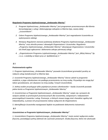 Regulamin Programu lojalnościowego „Ambasador Mariny” 1. Program lojalnościowy „Ambasador Mariny” jest programem przeznaczonym dla klienta korzystającego z usług i dokonującego zakupów w Marina Spa, zwany dalej „Uczestnikiem”. 2. Celem Programu lojalnościowego „Ambasador Mariny” jest nagradzanie Uczestnika za wykonywane zabiegi. 3. Niniejszy Regulamin stanowi podstawę działania Programu lojalnościowego „Ambasador Mariny” oraz określa prawa i obowiązki Organizatora i Uczestnika. Regulamin „Programu lojalnościowego „Ambasador Mariny” obowiązuje Organizatora i Uczestnika od chwili jego ogłoszenia i dokonania zakupu pierwszej usługi. 4. „Organizatorem Programu Lojalnościowego „Ambasador Mariny” jest „Bliżej Natury” Sp. z o.o. z siedzibą w Gdyni przy ul. Spółdzielczej 1.” §1 Postanowienia ogólne 1. Program lojalnościowy „Ambasador Mariny” pozwala Uczestnikowi gromadzić punkty za nabycie usług świadczonych w Marina Spa. 2. Uczestnik Programu lojalnościowego „Ambasador Mariny” bierze udział w programie osobiście, a jego członkostwo nie podlega przeniesieniu na inną osobę. Przywileje nie mogą być także sprzedawane, ani zbywane na inną osobę / innych Uczestników. 3. Jednej osobie przysługuje tylko pojedyncze prawo członkowskie – każdy Uczestnik posiada jedno konto w Programie lojalnościowym „Ambasador Mariny” 4. Uczestnictwo w Programie lojalnościowym „Ambasador Mariny” wiąże się z prawem do wzięcia udziału w promocjach przeznaczonych dla Uczestnika, związanych z nabywaniem poszczególnych towarów i usług. Promocje, o których mowa mogą mieć charakter ogólny lub indywidualny, a prawo ich przyznawania należy wyłącznie do Organizatora. 5. Identyfikacja Uczestnika następować będzie na podstawie dokumentu tożsamości. §2 Uczestnictwo w Programie lojalnościowym „Ambasador Mariny” 1. Uczestnikiem Programu lojalnościowego „Ambasador Mariny” może zostać wyłącznie osoba fizyczna, posiadająca pełną zdolność do czynności prawnych. Osoba fizyczna, która nie ukończyła 18 lat może przystąpić do Programu lojalnościowego „Ambasador Mariny” wyłącznie za pisemną zgodą rodzica lub opiekuna prawnego. 2. Warunkiem niezbędnym do przystąpienia do Programu lojalnościowego „Ambasador Mariny” jest proces rejestracji Uczestnika połączony z otwarciem dla niego indywidualnego konta w Marina Spa oraz dobrowolnym wyrażeniem zgody na przetwarzanie danych osobowych. 3. Warunkiem przyjęcia przystąpienia do Programu lojalnościowego „Ambasador Mariny” jest wypełnienie formularza w sposób kompletny, czytelny i zgodny z prawdą. 4. Pełny tekst Regulaminu dostępny na stronie internetowej www.marinagolfclub.pl 5. Tylko prawidłowo wypełniony formularz zawierający zgodę na przetwarzanie danych osobowych zostanie zaakceptowany przez Organizatora. 7. Dane osobowe Uczestnika są wprowadzane do bazy danych Programu lojalnościowego „Ambasador Mariny” §3 Przyznawanie punktów na konto Uczestnika 1. Organizator zobowiązany jest do przyznania punktów Uczestnikowi za nabycie każdej usługi w Marina Spa. 2. Za zakup Bonów okolicznościowych lub voucherów Uczestnikowi nie nalicza się punktów. 3. Punkty będą przyznawane na konto Uczestnika w zależności od wartości zakupu określonej w polskich złotych: za 1 (jedną) wydaną na zakupy złotówkę w Marina Spa przyznawany jest 1 (jeden) punkt. 4. Organizator zastrzega sobie prawo do zmiany zasady naliczania punktów, a także informacji dotyczących towarów i usług objętych Programem lojalnościowym „Ambasador Mariny”. 5. Punkty mogą być naliczane na konto Uczestnika wyłącznie po okazaniu dowodu tożsamości pracownikowi Marina Spa. Pracownik zobowiązany jest do potwierdzenia danych osobowych Uczestnika. 6. Szczegółowe informacje dotyczące stanu konta Uczestnika można uzyskać w Marina Spa. §4 Przyznawanie nagród lojalnościowych a) Przy wykupieniu usług łącznie powyżej 1000 zł (1000 punktów) - zmysłowy peeling całego ciała, czyli perfekcyjne oczyszczenie i nawilżenie skóry… Ceremonia Wellness oparta na naturalnych recepturach, kolorach i zapachach. b) Przy wykupieniu usług łącznie powyżej 2000 zł (2000 punktów) – ekskluzywny masaż relaksacyjny pleców z użyciem gorących olejków aromaterapeutycznych. W niezwykły sposób rozpieszcza zmysły i niesie ukojenie c) Przy wykupieniu usług łącznie powyżej 3000 zł (3000 punktów) do wyboru: – liftingujący masaż twarzy KOBIDO, unikalna technika masażu inspirowana masażem stworzonym dla japońskiego dworu cesarskiego. Wykazuje silne działanie ujędrniające, poprawiające strukturę skóry i jej napięcie. d) Przy wykupieniu usług łącznie powyżej 4000 zł (4000 punktów) do wyboru: – odżywczy zabieg na ciało „Miodowa Pokusa” kusząco pachnący, nawilżająco-odżywczy zabieg, rozpieszcza skórę nadając jej witalność i elastyczność. 2. Nagrody lojalnościowe nie podlegają wymianie na gotówkę. 3. Uczestnik zbiera punkty przez okres 1 roku, licząc od daty przystąpienia do Programu. Po upływie tego okresu punkty zerują się i nagrody lojalnościowe przyznawane są od początku. §5 Zamknięcie konta w Programie lojalnościowym „Ambasador Mariny” 1. Uczestnik może zrezygnować z uczestnictwa w Programie lojalnościowym „Ambasador Mariny” w każdym momencie, poprzez złożenie Organizatorowi stosownego oświadczenia na piśmie, zawierającego podpis Uczestnika. 2. Z chwilą rezygnacji konto Uczestnika zostanie zamknięte, a punkty na nim zebrane zostaną unieważnione. §6 Zakończenie „Programu lojalnościowego „Ambasador Mariny” 1. Organizator zastrzega sobie prawo do zawieszenia lub zakończenia Programu lojalnościowego „Ambasador Mariny” w każdym momencie jego trwania. 2. W przypadku zawieszenia lub zakończenia „Programu lojalnościowego „Ambasador Mariny” Organi