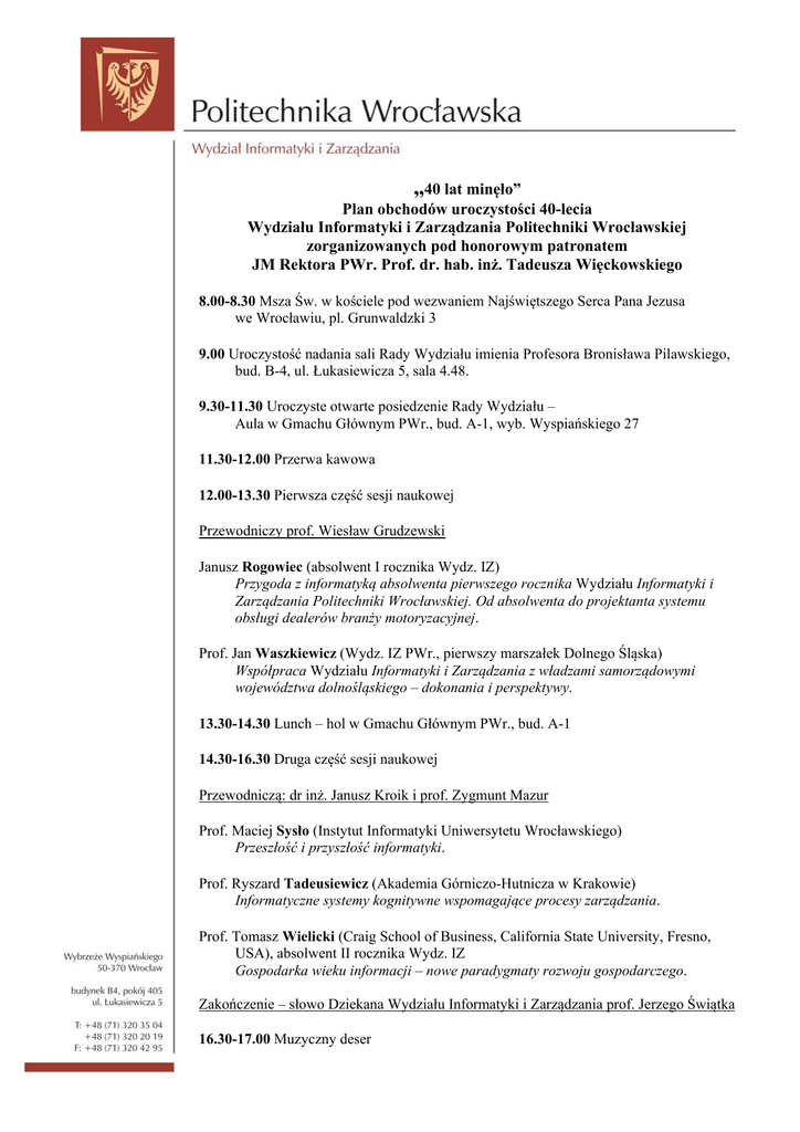 „40 lat minęło” Plan obchodów uroczystości 40-lecia Wydziału Informatyki i Zarządzania Politechniki Wrocławskiej zorganizowanych pod honorowym patronatem JM Rektora PWr. Prof. dr. hab. inż. Tadeusza Więckowskiego 8.00-8.30 Msza Św. w kościele pod wezwaniem Najświętszego Serca Pana Jezusa we Wrocławiu, pl. Grunwaldzki 3 9.00 Uroczystość nadania sali Rady Wydziału imienia Profesora Bronisława Pilawskiego, bud. B-4, ul. Łukasiewicza 5, sala 4.48. 9.30-11.30 Uroczyste otwarte posiedzenie Rady Wydziału – Aula w Gmachu Głównym PWr., bud. A-1, wyb. Wyspiańskiego 27 11.30-12.00 Przerwa kawowa 12.00-13.30 Pierwsza część sesji naukowej Przewodniczy prof. Wiesław Grudzewski Janusz Rogowiec (absolwent I rocznika Wydz. IZ) Przygoda z informatyką absolwenta pierwszego rocznika Wydziału Informatyki i Zarządzania Politechniki Wrocławskiej. Od absolwenta do projektanta systemu obsługi dealerów branży motoryzacyjnej. Prof. Jan Waszkiewicz (Wydz. IZ PWr., pierwszy marszałek Dolnego Śląska) Współpraca Wydziału Informatyki i Zarządzania z władzami samorządowymi województwa dolnośląskiego – dokonania i perspektywy. 13.30-14.30 Lunch – hol w Gmachu Głównym PWr., bud. A-1 14.30-16.30 Druga część sesji naukowej Przewodniczą: dr inż. Janusz Kroik i prof. Zygmunt Mazur Prof. Maciej Sysło (Instytut Informatyki Uniwersytetu Wrocławskiego) Przeszłość i przyszłość informatyki. Prof. Ryszard Tadeusiewicz (Akademia Górniczo-Hutnicza w Krakowie) Informatyczne systemy kognitywne wspomagające procesy zarządzania. Prof. Tomasz Wielicki (Craig School of Business, California State University, Fresno, USA), absolwent II rocznika Wydz. IZ Gospodarka wieku informacji – nowe paradygmaty rozwoju gospodarczego. Zakończenie – słowo Dziekana Wydziału Informatyki i Zarządzania prof. Jerzego Świątka 16.30-17.00 Muzyczny deser