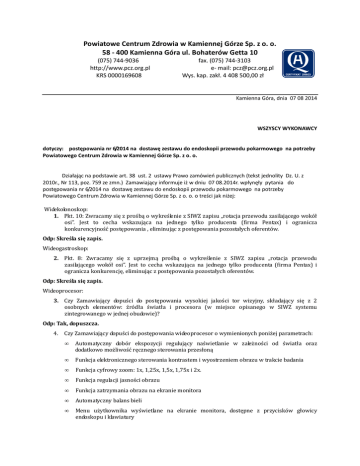 Powiatowe Centrum Zdrowia w Kamiennej Górze Sp. z o. o. 58 - 400 Kamienna Góra ul. Bohaterów Getta 10 (075) 744-9036 http://www.pcz.org.pl KRS 0000169608 fax. (075) 744-3103 e- mail: [email protected] Wys. kap. zakł. 4 408 500,00 zł Kamienna Góra, dnia 07 08 2014 WSZYSCY WYKONAWCY dotyczy: postępowania nr 6/2014 na dostawę zestawu do endoskopii przewodu pokarmowego na potrzeby Powiatowego Centrum Zdrowia w Kamiennej Górze Sp. z o. o. Działając na podstawie art. 38 ust. 2 ustawy Prawo zamówień publicznych (tekst jednolity Dz. U. z 2010r., Nr 113, poz. 759 ze zmn.) Zamawiający informuje iż w dniu 07 08.2014r. wpłynęły pytania do postępowania nr 6/2014 na dostawę zestawu do endoskopii przewodu pokarmowego na potrzeby Powiatowego Centrum Zdrowia w Kamiennej Górze Sp. z o. o. o treści jak niżej: Widekolonoskop: 1. Pkt. 10: Zwracamy się z prośbą o wykreślenie z SIWZ zapisu „rotacja przewodu zasilającego wokół osi”. Jest to cecha wskazująca na jednego tylko producenta (firma Pentax) i ogranicza konkurencyjność postępowania , eliminując z postępowania pozostałych oferentów. Odp: Skreśla się zapis. Wideogastroskop: 2. Pkt. 8: Zwracamy się z uprzejmą prośbą o wykreślenie z SIWZ zapisu „rotacja przewodu zasilającego wokół osi”. Jest to cecha wskazująca na jednego tylko producenta (firma Pentax) i ogranicza konkurencję, eliminując z postępowania pozostałych oferentów. Odp: Skreśla się zapis. Wideoprocesor: 3. Czy Zamawiający dopuści do postępowania wysokiej jakości tor wizyjny, składający się z 2 osobnych elementów: źródła światła i procesora (w miejsce opisanego w SIWZ systemu zintegrowanego w jednej obudowie)? Odp: Tak, dopuszcza. 4. Czy Zamawiający dopuści do postępowania wideoprocesor o wymienionych poniżej parametrach: • Automatyczny dobór ekspozycji regulujący naświetlanie w zależności od światła oraz dodatkowo możliwość ręcznego sterowania przesłoną • Funkcja elektronicznego sterowania kontrastem i wyostrzeniem obrazu w trakcie badania • Funkcja cyfrowy zoom: 1x, 1,25x, 1,5x, 1,75x i 2x. • Funkcja regulacji jasności obrazu • Funkcja zatrzymania obrazu na ekranie monitora • Automatyczny balans bieli • Menu użytkownika wyświetlane na ekranie monitora, dostępne z przycisków głowicy endoskopu i klawiatury • Możliwość podłączenia klawiatury, wpisywania danych pacjenta oraz wyświetlania ich na ekranie monitora • Możliwość sterowania urządzeniem do rejestracji obrazu bezpośrednio z głowicy endoskopu • Wyjścia sygnału: Composite Video, 2 x S-Video • Funkcja identyfikacji endoskopu przez procesor: typ/model i nr fabryczny endoskopu • Współpraca z głowicami laparoskopowymi i możliwość podłączenia np. sztywnego rektoskopu • Kompatybilny z oferowanymi wideoendoskopami najnowszej wysokiej klasy źródłem światła ? generacji i oferowanym Odp: Tak, dopuszcza. 5. Czy Zamawiający, w celu podniesienia jakości oferowanego sprzętu i uzyskania najkorzystniejszej dla siebie oferty, będzie wymagał by wideogastroskop i wideokolonskop posiadały parametr głębi ostrości na poziomie od 2 do 100 mm? Odp: Tak, dopuszcza również taka ostrość, odstępuję od min. ostrości na poziomie od min. 3 -100 mm. 6. Prosimy o wykreślenie określenia „analizator” ze wzoru umowy, gdyż nie wchodzi w skład przedmiotu zamówienia. Odp: Skreśla się zapis. Osobą do kontaktu w sprawie jest p. mgr Ewelina Wincza – kierownik działu zam. publicznych 075/74490-33. Powyższe informacje są wiążące dla stron postępowania z chwilą ich otrzymania. sporządziła: mgr Ewelina Wincza z poważaniem Prezes Zarządu mgr Wiktor Król
