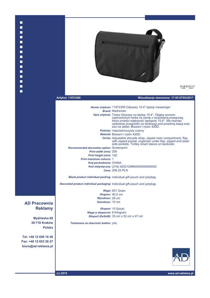 ............... Artykuł: 11972300 Wizualizacje utworzono: 17:05 07/03/2017 Numer artykulu: 11972300 Odyssey 15.4'' laptop messenger Brand: Marksman Opis artykulu: Torba Odyssey na laptop 15,4''. Objęta wzorem Kolor(y): Material: Cechy: Recommended decoration option: Print width (mm): Print height (mm): Print maximum colours: Kraj pochodzenia: Kod statystyczny: Cena: zastrzeżonym torba na ramię z wyściełaną przegrodą, która zmieści większość laptopów 15,4''. Ma również oddzielne przegródki na drobiazgi pod przednią klapą oraz etui na tablet. Brezent i nylon 420D. nieprzeźroczysty czarny Brezent i nylon 420D. Adjustable shoulde strap, zipped main compartment, flap with zipped pocket, organizer under flap. zipped and slash side pockets. Trolley smart sleeve on backside. Screenprint 200 100 1 CHINA (216) 4202129990000000000000 206.25 PLN Blank product individual packing: Individual gift pouch and polybag Decorated product individual packaging: Individual gift pouch and polybag Waga: Dlugosc: Wysokosc: Szerokosc: AD Pracownia Reklamy 651 Gram 40,5 cm 28 cm 10 cm Eksport: 10 Sztuki Waga w eksporcie: 8 Kilogram Eksport (DxSxW): 35 cm x 53 cm x 47 cm Myśliwska 68 30-718 Kraków Polska Testowane na obecność kadmu: yes Tel: +48 12 656 16 46 Fax: +48 12 653 26 27 [email protected] (c) 2015 www.ad-reklama.pl