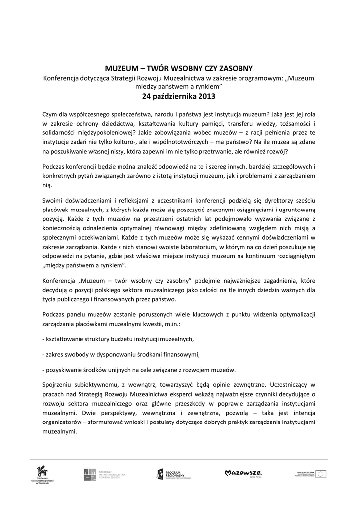MUZEUM – TWÓR WSOBNY CZY ZASOBNY Konferencja dotycząca Strategii Rozwoju Muzealnictwa w zakresie programowym: „Muzeum miedzy państwem a rynkiem” 24 października 2013 Czym dla współczesnego społeczeństwa, narodu i państwa jest instytucja muzeum? Jaka jest jej rola w zakresie ochrony dziedzictwa, kształtowania kultury pamięci, transferu wiedzy, tożsamości i solidarności międzypokoleniowej? Jakie zobowiązania wobec muzeów – z racji pełnienia przez te instytucje zadań nie tylko kulturo-, ale i wspólnototwórczych – ma państwo? Na ile muzea są zdane na poszukiwanie własnej niszy, która zapewni im nie tylko przetrwanie, ale również rozwój? Podczas konferencji będzie można znaleźć odpowiedź na te i szereg innych, bardziej szczegółowych i konkretnych pytań związanych zarówno z istotą instytucji muzeum, jak i problemami z zarządzaniem nią. Swoimi doświadczeniami i refleksjami z uczestnikami konferencji podzielą się dyrektorzy sześciu placówek muzealnych, z których każda może się poszczycić znacznymi osiągnięciami i ugruntowaną pozycją. Każde z tych muzeów na przestrzeni ostatnich lat podejmowało wyzwania związane z koniecznością odnalezienia optymalnej równowagi między zdefiniowaną względem nich misją a społecznymi oczekiwaniami. Każde z tych muzeów może się wykazać cennymi doświadczeniami w zakresie zarządzania. Każde z nich stanowi swoiste laboratorium, w którym na co dzień poszukuje się odpowiedzi na pytanie, gdzie jest właściwe miejsce instytucji muzeum na kontinuum rozciągniętym „między państwem a rynkiem”. Konferencja „Muzeum – twór wsobny czy zasobny” podejmie najważniejsze zagadnienia, które decydują o pozycji polskiego sektora muzealniczego jako całości na tle innych dziedzin ważnych dla życia publicznego i finansowanych przez państwo. Podczas panelu muzeów zostanie poruszonych wiele kluczowych z punktu widzenia optymalizacji zarządzania placówkami muzealnymi kwestii, m.in.: - kształtowanie struktury budżetu instytucji muzealnych, - zakres swobody w dysponowaniu środkami finansowymi, - pozyskiwanie środków unijnych na cele związane z rozwojem muzeów. Spojrzeniu subiektywnemu, z wewnątrz, towarzyszyć będą opinie zewnętrzne. Uczestniczący w pracach nad Strategią Rozwoju Muzealnictwa eksperci wskażą najważniejsze czynniki decydujące o rozwoju sektora muzealniczego oraz główne przeszkody w poprawie zarządzania instytucjami muzealnymi. Dwie perspektywy, wewnętrzna i zewnętrzna, pozwolą – taka jest intencja organizatorów – sformułować wnioski i postulaty dotyczące dobrych praktyk zarządzania instytucjami muzealnymi. W panelu muzeów wezmą udział dyrektorzy: - Muzeum Sztuki w Łodzi - Muzeum Historycznego Miasta Krakowa - Narodowego Muzeum Rolnictwa i Przemysłu Spożywczego w Szreniawie - Muzeum Zamek w Łańcucie - Państwowego Muzeum Etnograficznego w Warszawie - Muzeum Pałacu Króla Jana III w Wilanowie Muzeum Sztuki w Łodzi jest jednym z najstarszych muzeów sztuki nowoczesnej na świecie. Na przełomie lat 20. i 30. XX wieku grupa twórców z grupy „a.r.” rozpoczęła akcję gromadzenia dla Muzeum dzieł najważniejszych artystów owego czasu. Wielu znakomitych artystów europejskiej awangardy, m.in. Max Ernst, Hans Arp i Kurt Schwitters, przekazało muzeum w darze swoje dzieła. Międzynarodowa Kolekcja Sztuki Nowoczesnej grupy „a.r.”, reprezentująca głównie kierunki takie jak kubizm, futuryzm, konstruktywizm, puryzm, neoplastycyzm i surrealizm, została udostępniona 15 lutego 1931 roku. Kolekcja jest poszerzana o międzynarodową sztukę nowoczesną i współczesną od ponad 80 lat. Dzięki temu Muzeum Sztuki to obecnie jedyne w Polsce muzeum posiadające tak bogate zbiory światowej sztuki XX i XXI wieku. Muzeum Historyczne Miasta Krakowa. Muzeum historyczne o charakterze miejskim, założone w 1899 roku. Jego główna siedziba mieści się obecnie w Pałacu Krzysztofory przy Rynku Głównym, ale to tylko niewielka część tej potężnej instytucji, która ma już kilkanaście oddziałów. W Krzysztoforach znajduje się stała ekspozycja "Z Dziejów i Kultury Krakowa", prezentująca m.in. dawną broń, dzieła sztuki i pamiątki związane z Krakowem, z samorządem miejskim i z cechami. Rzesze turystów przyciągają takie nowootwarte oddziały jak Fabryka Schindlera, Kamienica Hippolitów (czyli „Dom Mieszczański”), Podziemia Rynku czy „Oddział Ulica Pomorska”, którego podstawowym zadaniem jest opieka nad historycznym miejscem kaźni z czasów II wojny światowej – celami byłego aresztu Gestapo w Krakowie, przejętym po zakończeniu wojny przez Urząd Bezpieczeństwa. Muzeum Narodowe Rolnictwa i Przemysłu Rolno-Spożywczego w Szreniawie powstało w 1964 roku. Status muzeum narodowego uzyskało w 1975 roku. Jest jedynym tej rangi muzeum rolnictwa w Polsce i jednym z największych w Europie. Muzeum w Szreniawie jest kontynuatorem i niejako spadkobiercą powstałego w 1875 roku w Warszawie Muzeum Przemysłu i Rolnictwa, zniszczonego w roku 1939. W latach 1964–1998 Muzeum podlegało Ministerstwu Rolnictwa. Od 1999 roku organizatorem Muzeum jest Samorząd Województwa Wielkopolskiego. Muzeum - Zamek w Łańcucie ma pod swoją opieką jedną z najpiękniejszych i najbardziej okazałych rezydencji arystokratycznych w Polsce. Słynie ze znakomitych wnętrz mieszkalnych oraz niezwykle interesującej kolekcji pojazdów konnych. Atutem muzeum jest też znakomicie zachowany, okazały park w stylu angielskim, w którym wznoszą się liczne pawilony i zabudowania gospodarcze. W nawiązaniu do tradycji zapoczątkowanych przez księżnę Izabelę Lubomirską zamek w Łańcucie jest miejscem imprez muzycznych. Od 1960 roku nieprzerwanie do dziś organizowana jest impreza, która nosiła pierwotnie nazwę Dni Muzyki Kameralnej, a w tej chwili – Festiwal Muzyki, jeden z najważniejszych festiwali muzyki poważnej w kraju. N