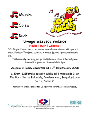 Muzyka Śpiew Ruch Uwaga wszyscy rodzice Nauka ! Ruch ! Zabawa ! “Jo Jingles” umożliwi dzieciom wprowadzenie do muzyki, śpiew i ruch. Pomoże Twojemu dziecku w nauce języka i porozumiewaniu się. Instrumenty perkusyjne, przedszkolne rytmy, interaktywne piosenki i popularne piosenki dziecięce. Zajęcia w każdy czwartek od 10th kwietnoiowy 2008 1130am -1215pmdla dzieci w wieku od 6 miesiąc do 3 lat The Bush Centre Balgaddy, Foxdene Ave., Balgaddy Lucan South, Dublin 22 Kontakt : Carmen Pardes tel. 01 4508748 informacje i rezerwacja. Transforming Ireland Supported under the South Eastern Region operational programme of the National Development Plan 2007-2013 Registered in Ireland: 246364