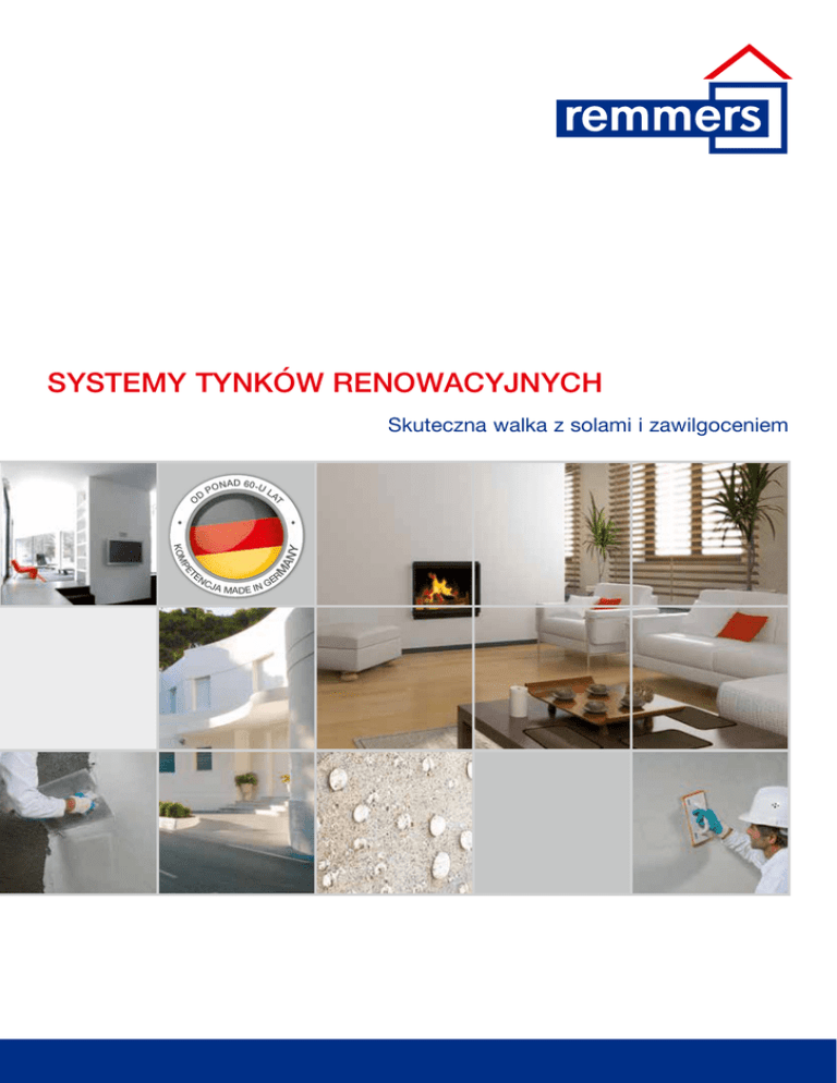 SYSTEMY TYNKÓW RENOWACYJNYCH nad 60-u la m t pe K om en po an y d t O Skuteczna walka z solami i zawilgoceniem cj er a m a de i n G SYSTEMY TYNKÓW RENOWACYJNYCH REMMERS Zadaniem systemów tynków renowacyjnych jest długotrwałe zapewnienie suchej, pozbawionej wykwitów powierzchni tynku oraz trwała ochrona muru poprzez odkładanie soli, usuwanych w ten sposób z muru. Aby to osiągnąć, systemy tynków renowacyjnych działają na dwa sposoby: Tynk renowacyjny jest hydrofobowy, ale jednocześnie bardzo otwarty na dyfuzję pary wodnej, co przyczynia się do przesunięcia strefy odparowania z powierzchni w stronę wnętrza tynku Tynk podkładowy przejmuje funkcję warstwy magazynującej. Wilgoć powinna mieć możliwość wnikania w postaci ciekłej wraz z zawartymi w niej solami i pozostawiania ich w tynku podkładowym podczas dyfundowania przez tynk renowacyjny. 2 Genialny pomysł i jego realizacja Aby wymagania te spełnić w najwyższym stopniu, niezbędne jest świadome, oparte na naukowych postawach ukształtowanie przestrzeni porów w każdym z tynków. Zagadnienie to zostało przebadane w ramach współpracy pomiędzy Laboratorium Materiałów Budowlanych FH Münster i firmą Remmers. Wyniki badań są po dziś dzień, konsekwentnie wykorzystywane w technologiach zapraw tynkarskich oferowanych przez firmę Remmers. Tynk renowacyjny działa hydrofobizująco, dzięki czemu żadne sole nie wydostają się na powierzchnię, gdy wilgoć przenika przez tynk. Tynk podkładowy pełni rolę warstwy magazynującej sole. To tutaj wilgoć wnikająca w tynk pozostawia rozpuszczone w niej sole, podczas gdy sama dyfunduje przez tynk renowacyjny. Tynki renowacyjne mają tak wysoką odporność na sole, że nawet w przypadku „średniego” stopnia zasolenia wystarczy nałożyć jedną warstwę tynku o grubości 20 mm. Tynki renowacyjne mogą być stosowane bez izolacji przeciwwilgociowej do stopnia zawilgocenia < 40%. A B Obrzutka Tynk podkładowy C D Tynk renowacyjny Tynk drobnoziarnisty SYSTEMY PORÓW ZRÓŻNICOWANE FUNKCJONALNIE Pora przyjrzeć się porom sole zawartość soli w % wagowych chlorki < 0,2 0,2 do 0,5 > 0,5 azotany < 0,1 0,1 do 0,3 > 0,3 siarczany < 0,5 0,5 do 1,5 > 1,5 ocena obciążenie obciążenieobciążenie niskie średniewysokie stopień zasolenia zabiegi grubość warstwy w mm niski do średniego System 1 1. obrzutka 2. tynk renowacyjny co najmniej 5 co najmniej 20 wysoki System 2 1. obrzutka 2. tynk podkładowy 3. tynk renowacyjny co najmniej 5 co najmniej 10 co najmniej 15 Oprócz porów kapilarnych znajdujących się w spoiwie, tynki renowacyjne lub podkładowe mogą wykazywać obecność bardzo różnych rodzajów porów. Konsekwentne stosowanie tej wiedzy, tak jak ma to miejsce wyłącznie w firmie Remmers, znacząco wydłuża trwałość systemu tynków renowacyjnych. Jako że sole mogą odkładać się niemalże wyłącznie w porach aktywnych kapilarnie, istotne jest, by w tynkach podkładowych stosowany był typ 2, podczas gdy do tynków renowacyjnych nadaje się również typ 1. Ponadto, w ten sposób można tak dobrać właściwości tynków, aby dla różnych obszarów stosowania powstały rozwiązania dokładnie dopasowane do potrzeb. Typ 1: Nieaktywne kapilarnie pory powietrzne powstające w wyniku działania dodatków napowietrzających zawierających środki powierzchniowo czynne. Typ 2: Pory aktywne kapilarnie, wprowadzone przez dodanie specjalnych kruszyw lekkich. 3 REMMERS SANIERPUTZ „STARA BIEL” Właściwości: Najwyższa zdolność magazynowania soli dzięki specjalnej geometrii porów Wysoki stopień bieli dzięki zastosowaniu najlepszego z dostępnych białych cementów Wzmocniony włóknami Nadaje się do aplikacji maszynowej Otwarty dyfuzyjnie, wspomaga schnięcie Nakładanie pojedynczych warstw o grubości ok. 30 mm Zużycie: ok. 8,5 kg/m²/cm grubości warstwy Objętość porów > 50 % 4 Nasz sprawdzony omnibus Obszary stosowania: Wszelkie powszechnie spotykane naprawy tynków, zastosowania wewnętrzne i zewnętrzne Certyfikowany system tynku renowacyjnego wg instrukcji WTA 2-904/D, Systemy tynków renowacyjnych i wg EN 998 – 1 Do stosowania w układzie jednolub dwuwarstwowym, jako tynk podkładowy i wierzchni, przy niskim i średnim zasoleniu Można stosować bez izolacji przeciwwilgociowej do stopnia zawilgocenia 40% Dane techniczne produktu Produkt Sanierputz stara biel Nr art. 0402 Wielkość opakowania 20 kg Kolor stara biel Proporcja mieszania z wodą ok.5,8 - 6,0 l na 20 kg proszku Gęstość nasypowa ok. 0,9 kg/dm3 Temperatura stosowania > +5°C do +30°C Czas przydatności do użycia po wymieszaniu ok 60 minut Zużycie ok. 8,5 kg/m² na cm grubości warstwy Wytrzymałość na ściskanie CS II Głębokość wnikania wody < 5 mm Nasiąkliwość kapilarna w24 > 0,3 kg/m2 Współczynnik oporu dyfuzji pary wodnej µ < 15 Przewodność cieplna ok. 0,27 W/(m*K) Reakcja na ogień Klasa A1 remmers Sanierputz schnell wd Właściwości: Działa termoizolacyjnie dzięki technologii lekkich kruszyw Szybko wiąże Szybko i pewnie osiąga hydrofobowość, nawet przy wysokiej wilgotności powietrza > 90% Wzmocniony włóknem Nadaje się do aplikacji maszynowej Otwarty dyfuzyjnie, wspomaga schnięcie Ekstremalnie niskie zużycie: ok. 6 kg/m²/cm grubości warstwy Nakładanie pojedynczych warstw o grubości do 30 mm Objętość porów > 50 % Ekstremalnie niski skurcz Nasz najlepszy Obszary stosowania: Niewielkie naprawy wykonywane w ciągu 1 dnia! Energetyczna renowacja pomieszczeń piwnicznych Certyfikowany system tynku renowacyjnego wg instrukcji WTA 2-9-04/D, Systemy tynków renowacyjnych i wg EN 998 – 1 Do stosowania w układzie jednolub dwuwarstwowym, jako tynk podkładowy i wierzchni, przy niskim i średnim zasoleniu Można stosować bez izolacji przeciwwilgociowej do stopnia zawilgocenia 40% Dane techniczne produktu Produkt Sanierputz Schnell WD Nr art. 0417 Wielkość opakowania 20 kg Kolor stara biel Proporcja mieszania z wodą ok. 6,5