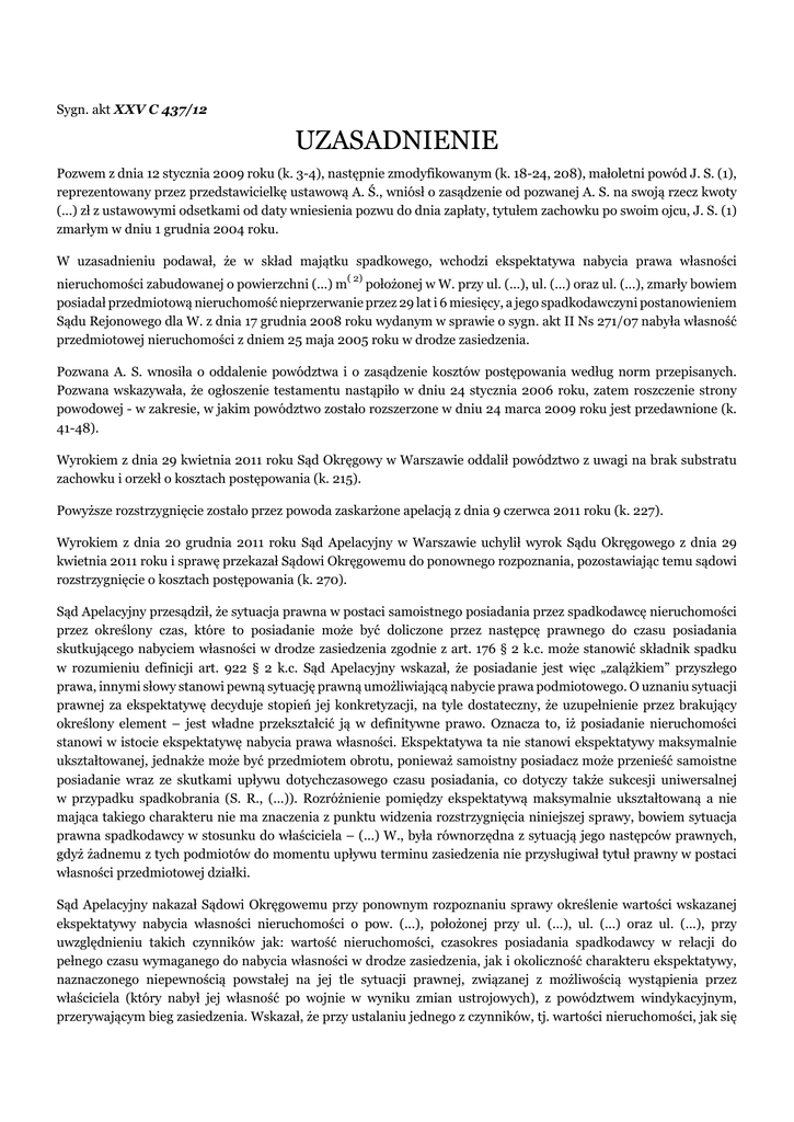 Sygn. akt XXV C 437/12 UZASADNIENIE Pozwem z dnia 12 stycznia 2009 roku (k. 3-4), następnie zmodyfikowanym (k. 18-24, 208), małoletni powód J. S. (1), reprezentowany przez przedstawicielkę ustawową A. Ś., wniósł o zasądzenie od pozwanej A. S. na swoją rzecz kwoty (...) zł z ustawowymi odsetkami od daty wniesienia pozwu do dnia zapłaty, tytułem zachowku po swoim ojcu, J. S. (1) zmarłym w dniu 1 grudnia 2004 roku. W uzasadnieniu podawał, że w skład majątku spadkowego, wchodzi ekspektatywa nabycia prawa własności nieruchomości zabudowanej o powierzchni (...) m( 2) położonej w W. przy ul. (...), ul. (...) oraz ul. (...), zmarły bowiem posiadał przedmiotową nieruchomość nieprzerwanie przez 29 lat i 6 miesięcy, a jego spadkodawczyni postanowieniem Sądu Rejonowego dla W. z dnia 17 grudnia 2008 roku wydanym w sprawie o sygn. akt II Ns 271/07 nabyła własność przedmiotowej nieruchomości z dniem 25 maja 2005 roku w drodze zasiedzenia. Pozwana A. S. wnosiła o oddalenie powództwa i o zasądzenie kosztów postępowania według norm przepisanych. Pozwana wskazywała, że ogłoszenie testamentu nastąpiło w dniu 24 stycznia 2006 roku, zatem roszczenie strony powodowej - w zakresie, w jakim powództwo zostało rozszerzone w dniu 24 marca 2009 roku jest przedawnione (k. 41-48). Wyrokiem z dnia 29 kwietnia 2011 roku Sąd Okręgowy w Warszawie oddalił powództwo z uwagi na brak substratu zachowku i orzekł o kosztach postępowania (k. 215). Powyższe rozstrzygnięcie zostało przez powoda zaskarżone apelacją z dnia 9 czerwca 2011 roku (k. 227). Wyrokiem z dnia 20 grudnia 2011 roku Sąd Apelacyjny w Warszawie uchylił wyrok Sądu Okręgowego z dnia 29 kwietnia 2011 roku i sprawę przekazał Sądowi Okręgowemu do ponownego rozpoznania, pozostawiając temu sądowi rozstrzygnięcie o kosztach postępowania (k. 270). Sąd Apelacyjny przesądził, że sytuacja prawna w postaci samoistnego posiadania przez spadkodawcę nieruchomości przez określony czas, które to posiadanie może być doliczone przez następcę prawnego do czasu posiadania skutkującego nabyciem własności w drodze zasiedzenia zgodnie z art. 176 § 2 k.c. może stanowić składnik spadku w rozumieniu definicji art. 922 § 2 k.c. Sąd Apelacyjny wskazał, że posiadanie jest więc „zalążkiem” przyszłego prawa, innymi słowy stanowi pewną sytuację prawną umożliwiającą nabycie prawa podmiotowego. O uznaniu sytuacji prawnej za ekspektatywę decyduje stopień jej konkretyzacji, na tyle dostateczny, że uzupełnienie przez brakujący określony element – jest władne przekształcić ją w definitywne prawo. Oznacza to, iż posiadanie nieruchomości stanowi w istocie ekspektatywę nabycia prawa własności. Ekspektatywa ta nie stanowi ekspektatywy maksymalnie ukształtowanej, jednakże może być przedmiotem obrotu, ponieważ samoistny posiadacz może przenieść samoistne posiadanie wraz ze skutkami upływu dotychczasowego czasu posiadania, co dotyczy także sukcesji uniwersalnej w przypadku spadkobrania (S. R., (...)). Rozróżnienie pomiędzy ekspektatywą maksymalnie ukształtowaną a nie mająca takiego charakteru nie ma znaczenia z punktu widzenia rozstrzygnięcia niniejszej sprawy, bowiem sytuacja prawna spadkodawcy w stosunku do właściciela – (...) W., była równorzędna z sytuacją jego następców prawnych, gdyż żadnemu z tych podmiotów do momentu upływu terminu zasiedzenia nie przysługiwał tytuł prawny w postaci własności przedmiotowej działki. Sąd Apelacyjny nakazał Sądowi Okręgowemu przy ponownym rozpoznaniu sprawy określenie wartości wskazanej ekspektatywy nabycia własności nieruchomości o pow. (...), położonej przy ul. (...), ul. (...) oraz ul. (...), przy uwzględnieniu takich czynników jak: wartość nieruchomości, czasokres posiadania spadkodawcy w relacji do pełnego czasu wymaganego do nabycia własności w drodze zasiedzenia, jak i okoliczność charakteru ekspektatywy, naznaczonego niepewnością powstałej na jej tle sytuacji prawnej, związanej z możliwością wystąpienia przez właściciela (który nabył jej własność po wojnie w wyniku zmian ustrojowych), z powództwem windykacyjnym, przerywającym bieg zasiedzenia. Wskazał, że przy ustalaniu jednego z czynników, tj. wartości nieruchomości, jak się wydaje przydatne będzie m.in. wyjaśnienie, jaką wartość przyjął Urząd Skarbowy przy ustalaniu wartości przedmiotu zasiedzenia do celów podatkowych, jak również cen transakcyjnych metra kwadratowego nieruchomości w obrębie ul. (...). Sąd Okręgowy ustalił następujący stan faktyczny: J. S. (1) był ojcem małoletniego powoda. Po narodzinach dziecka spadkodawca aż do śmierci utrzymywał zarówno powoda jak i jego matkę. Pozwana początkowo, nie wiedziała, że spadkodawca ma dziecko pozamałżeńskie ani, że utrzymuje je i jego matkę (odpis odpisu skróconego aktu urodzenia k. 29, wysłuchanie informacyjne pozwanej A. S. k. 65-68, przesłuchanie pozwanej A. S. k. 209-210, zeznania świadka K. B. k. 566-567). J. S. (1) zmarł w dniu 1 grudnia 2004 roku. W chwili śmierci spadkodawca był mężem pozwanej A. S., z którą od 2001 roku pozostawał w ustroju rozdzielności majątkowej. Jedynym dzieckiem spadkodawcy był powód ( odpis skrócony aktu zgonu J. S. (1) k. 5 akt sprawy o sygn. II Ns 184/06, odpis skrócony aktu małżeństwa k. 6 akt sprawy o sygn. II Ns 184/06, wysłuchanie informacyjne pozwanej A. S. k. 65-68, przesłuchanie pozwanej A. S. k. 209-210, zeznania świadka K. B. k. 566-567). Postanowieniem z dnia 16 maja 2005 roku, wydanym w sprawie o sygn. akt II Ns 184/06, Sąd Rejonowy dla W. w W. stwierdził, że spadek po J. S. (1) nabyła, na podstawie testamentu notarialnego z dnia 24 września 2001 roku (Repertorium (...)) otwartego i ogłoszonego w dniu 24 stycznia 2006 roku, żona spadkodawcy A. S., w całości, z dobrodziejstwem inwentarza. W postanowieniu tym Sąd zlecił komornikowi sporządzenie s