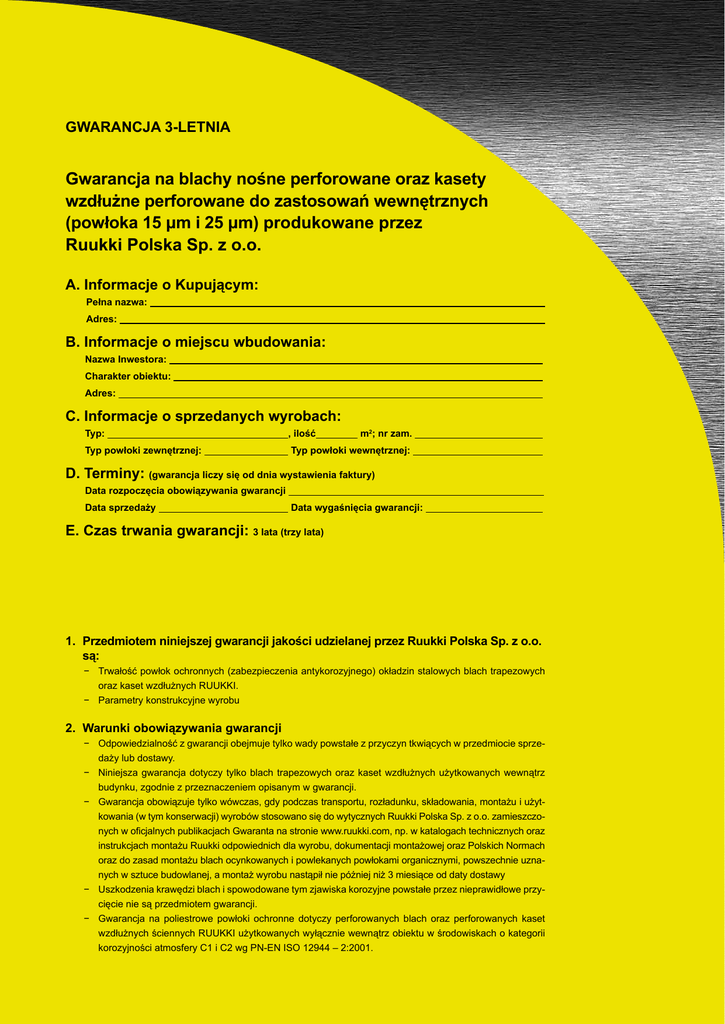 GWARANCJA 3-LETNIA Gwarancja na blachy nośne perforowane oraz kasety wzdłużne perforowane do zastosowań wewnętrznych (powłoka 15 μm i 25 μm) produkowane przez Ruukki Polska Sp. z o.o. A. Informacje o Kupującym: Pełna nazwa: Adres: B. Informacje o miejscu wbudowania: Nazwa Inwestora: Charakter obiektu: Adres: C. Informacje o sprzedanych wyrobach: Typ: , ilość m2; nr zam. Typ powłoki zewnętrznej: Typ powłoki wewnętrznej: D. Terminy: (gwarancja liczy się od dnia wystawienia faktury) Data rozpoczęcia obowiązywania gwarancji Data sprzedaży Data wygaśnięcia gwarancji: E. Czas trwania gwarancji: 3 lata (trzy lata) 1. Przedmiotem niniejszej gwarancji jakości udzielanej przez Ruukki Polska Sp. z o.o. są: − Trwałość powłok ochronnych (zabezpieczenia antykorozyjnego) okładzin stalowych blach trapezowych oraz kaset wzdłużnych RUUKKI. − Parametry konstrukcyjne wyrobu 2. Warunki obowiązywania gwarancji − Odpowiedzialność z gwarancji obejmuje tylko wady powstałe z przyczyn tkwiących w przedmiocie sprzedaży lub dostawy. − Niniejsza gwarancja dotyczy tylko blach trapezowych oraz kaset wzdłużnych użytkowanych wewnątrz budynku, zgodnie z przeznaczeniem opisanym w gwarancji. − Gwarancja obowiązuje tylko wówczas, gdy podczas transportu, rozładunku, składowania, montażu i użytkowania (w tym konserwacji) wyrobów stosowano się do wytycznych Ruukki Polska Sp. z o.o. zamieszczonych w oficjalnych publikacjach Gwaranta na stronie www.ruukki.com, np. w katalogach technicznych oraz instrukcjach montażu Ruukki odpowiednich dla wyrobu, dokumentacji montażowej oraz Polskich Normach oraz do zasad montażu blach ocynkowanych i powlekanych powłokami organicznymi, powszechnie uznanych w sztuce budowlanej, a montaż wyrobu nastąpił nie później niż 3 miesiące od daty dostawy − Uszkodzenia krawędzi blach i spowodowane tym zjawiska korozyjne powstałe przez nieprawidłowe przycięcie nie są przedmiotem gwarancji. − Gwarancja na poliestrowe powłoki ochronne dotyczy perforowanych blach oraz perforowanych kaset wzdłużnych ściennych RUUKKI użytkowanych wyłącznie wewnątrz obiektu w środowiskach o kategorii korozyjności atmosfery C1 i C2 wg PN-EN ISO 12944 – 2:2001. − Gwarancja nie obejmuje lakieru ochronnego strony niewidocznej blachy trapezowej lub kasety wzdłużnej (lub nieprzeznaczonej do kontaktu ze środowiskiem zewnętrznym), zarówno pod względem ewentualnych uszkodzeń, odbarwień koloru jak i przyczepności. − Warunek zabezpieczenia antykorozyjnego uważa się za spełniony, gdy ewentualne zjawiska korozyjne obejmują nie więcej niż 5% całkowitej powierzchni blach. Gwarancja nie obejmuje starzenia się powłok w postaci zmiany barwy (kredowanie) i połysku. − Gwarancja nie obejmuje uszkodzeń mechanicznych oraz szkód wywołanych długotrwałym, bezpośrednim kontaktem blach z zanieczyszczeniami organicznymi, długotrwałym pozostawaniem powłoki w stanie mokrym na skutek skraplania oparów spowodowanego niewłaściwą wentylacją wnętrza budynku, a także długotrwałym działaniem temperatury powyżej 60 ºC. − Gwarancja na poliestrowe powłoki ochronne blach nie obowiązuje w przypadku użytkowania blach niezgodnie z przeznaczeniem, a w szczególności zastosowania do czyszczenia ich powierzchni agresywnych, kwaśnych lub alkalicznych środków myjących i jeżeli wyrób został narażony nawet na krótkotrwały kontakt z agresywnymi środkami chemicznymi (np. opary siarki, amoniak, kwasy, tłuszcze itp.) − Do czyszczenia zabrudzonych powierzchni blach należy używać obojętnych lub lekko alkalicznych środków myjących, stosowanych w gospodarstwie domowym. Powierzchnia powinna zostać starannie oczyszczona oraz wytarta do sucha. Niedopuszczalne jest używanie wody pod ciśnieniem. Gwarancja nie obejmuje wad powstałych w wyniku stosowania rozpuszczalników organicznych i środków ściernych. − Gwarancja nie obowiązuje, jeżeli montaż materiału miał miejsce w bezpośredniej bliskości innego metalu powodującego różnicę w potencjale elektrycznym. − Gwarancja nie obejmuje wad powstałych w wyniku działania pozostawionych na powierzchni blach opiłków metalowych powstałych podczas cięcia, wiercenia lub przykręcania blach oraz wystawienia materiału na działanie wody morskiej lub mgły solnej. − Gwarancja nie obejmuje różnic odcieni blach powlekanych dotyczących wyrobów nowych i nie użytkowanych, a wynikających z dopuszczalnych tolerancji odcienia koloru RAL w odniesieniu do przedmiotowych wytycznych hut będących producentem blachy powlekanej lub wynikających z zastosowania innej technologii nanoszenia powłoki malarskiej. − Gwarancja nie obejmuje ewentualnych poprawek lakierniczych. − Gwarancją nie są objęte naprawy podjęte przez Kupującego we własnym zakresie i spowodowanych tym wad. − Gwarancja na powłoki ochronne obowiązuje tylko dla blach jednokrotnie montowanych do konstrukcji nośnej. Nie podlegają gwarancji blachy demontowane ani blachy narażone na korozję poprzez kontakt z produktami korozji innych elementów budowlanych jak łączniki, instalacje odgromowe itp. 3. Prawo do świadczeń gwarancyjnych − Gwarancja obejmuje wyłącznie wyroby wyprodukowane przez Gwaranta. − Na produkty (inne składniki systemu elewacyjnego lub dachowego) nie wyprodukowane przez Gwaranta obowiązują gwarancje ich producentów. − Za właściwy dobór i zastosowanie wyrobu zgodnie z Aprobatą Techniczną, Polskimi Normami lub innymi dokumentami odniesienia odpowiedzialność ponoszą osoby pełniące samodzielne funkcje techniczne w budownictwie, a nie Gwarant. − Odpowiedzialność Gwaranta jest zawsze ograniczona do wartości dostarczonego towaru i nie obejmuje wszelkich innych szkód wywołanych stwierdzonymi wadami. − Obowiązywanie postanowień niniejszej gwarancji, za wyjątkiem punktu 4, uzależnione jest od dokonania przez Kupującego pełnej płatności za dostarczony tow
