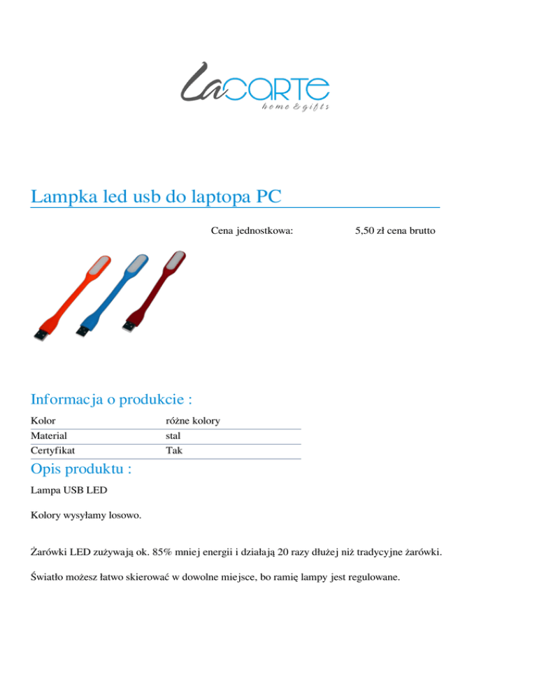 Lampka led usb do laptopa PC Cena jednostkowa: 5,50 zł cena brutto Informacja o produkcie : Kolor Material Certyfikat różne kolory stal Tak Opis produktu : Lampa USB LED Kolory wysyłamy losowo. Żarówki LED zużywają ok. 85% mniej energii i działają 20 razy dłużej niż tradycyjne żarówki. Światło możesz łatwo skierować w dowolne miejsce, bo ramię lampy jest regulowane. Wbudowana żarówka LED. Żywotność LED - do 25 tys. godzin. Jasny kolor; ciepła biel Powered by TCPDF (www.tcpdf.org)