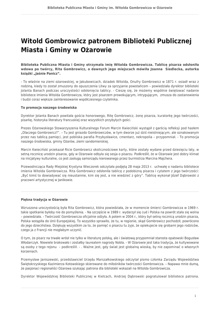 Biblioteka Publiczna Miasta i Gminy im. Witolda Gombrowicza w Ożarowie Witold Gombrowicz patronem Biblioteki Publicznej Miasta i Gminy w Ożarowie Biblioteka Publiczna Miasta i Gminy otrzymała imię Witolda Gombrowicza. Tablicę pisarza odsłoniła wdowa po twórcy, Rita Gombrowicz, o dawnych jego miejscach mówiła Joanna Siedlecka, autorka książki „Jaśnie Panicz”. - To właśnie na ziemi ożarowskiej, w Jakubowicach, dziadek Witolda, Onufry Gombrowicz w 1871 r. osiadł wraz z rodziną, kiedy to został zmuszony do opuszczenia Litwy za sprzyjanie powstańcom – powiedziała dyrektor biblioteki Jolanta Banach podczas uroczystości odsłonięcia tablicy. - Cieszę się, że możemy wspólnie świętować nadanie bibliotece imienia Witolda Gombrowicza, który jest pisarzem prowokującym, intrygującym, zmusza do zastanowienia i budzi coraz większe zainteresowanie współczesnego czytelnika. To promocja naszego środowiska Dyrektor Jolanta Banach powitała gościa honorowego, Ritę Gombrowicz, żonę pisarza, kuratorkę jego twórczości, pisarkę, historyka literatury francuskiej oraz wszystkich przybyłych gości. Prezes Ożarowskiego Stowarzyszenia Kulturalnego Forum Marcin Kwieciński wystąpił z garścią refleksji pod hasłem „Dlaczego Gombrowicz?”. – Tu jest gniazdo Gombrowiczów, w tym dworze już dziś nieistniejącym, ale oznakowanym przez nas tablicą pamięci, jest pobliska parafia Przybysławice, cmentarz, nekropolia – przypomniał. - To promocja naszego środowiska, gminy Ożarów, ziemi sandomierskiej. Marcin Kwieciński przekazał Ricie Gombrowicz okolicznościowe karty, które zostały wydane przed dziesięciu laty, w setną rocznicę urodzin pisarza, gdy w Ożarowie odbyła się sesja o pisarzu. Podkreślił, że w Ożarowie jest dobry klimat na inicjatywy kulturalne, co jest zasługą samorządu kierowanego przez burmistrza Marcina Majchera. Przewodnicząca Rady Miejskiej Krystyna Wieczorek odczytała podjętą 28 maja 2013 r. uchwałę o nadaniu bibliotece imienia Witolda Gombrowicza. Rita Gombrowicz odsłoniła tablicę z podobizną pisarza i cytatem z jego twórczości: „Być kimś to dowiadywać się nieustannie, kim się jest, a nie wiedzieć z góry”. Tablicę wykonał Józef Dąbrowski z pracowni artystycznej w Janikowie. Piękna tradycja w Ożarowie Wzruszona uroczystością była Rita Gombrowicz, która powiedziała, że w momencie śmierci Gombrowicza w 1969 r. takie spotkanie byłoby nie do pomyślenia. - Na szczęście w 1989 r. wydarzył się cud i Polska na powrót stała się wolna – powiedziała. - Twórczość Gombrowicza oficjalnie odżyła. A potem w 2004 r., który był setną rocznicą urodzin pisarza, Polska wstąpiła do Unii Europejskiej. To wszystko sprawiło, że tu, w regionie, skąd Gombrowicz pochodził, powrócono do jego dzieciństwa. Dziękuję wszystkim za to, że pamięć o pisarzu tu żyje, że opiekujecie się grobami jego rodziców, czego ja z Francji nie mogłabym uczynić. O tym, że pisarz na trwałe wrósł nie tylko w literaturę polską, ale i światową przypomniał starosta opatowski Bogusław Włodarczyk. Niewiele brakowało i zostałby laureatem nagrody Nobla. - W Ożarowie jest taka tradycja, że kultywowane są osoby z tego rejonu – podkreślił. - . Ważne jest, gdy świat jest globalną wioską, by nie zapominać o własnych korzeniach. Przemysław Janiszewski, przedstawiciel Urzędu Marszałkowskiego odczytał pismo członka Zarządu Województwa Świętokrzyskiego Kazimierza Kotowskiego skierowane do miłośników twórczości Gombrowicza. – Napawa mnie dumą, że pasjonaci regionaliści Ożarowa szukając patrona dla biblioteki wskazali na Witolda Gombrowicza. Dyrektor Wojewódzkiej Biblioteki Publicznej w Kielcach, Andrzej Dąbrowski pogratulował bibliotece patrona. 1 Biblioteka Publiczna Miasta i Gminy im. Witolda Gombrowicza w Ożarowie Gombrowicz wraca jakby symbolicznie do swego miejsca, do swych korzeni. Z gratulacjami wystąpił też Włodzimierz Marchewka, dyrektor Chmielnickiego Centrum Kultury i kierownik biblioteki Ewa Wawrzyk. – Czujemy się zaszczyceni, że możemy panią gościć w naszej gminie – zwrócił się burmistrz Marcin Majcher do Rity Gombrowicz. - Fakt, że korzenie Witolda Gombrowicza wywodzą się z naszego środowiska, jest dla nas bardzo budujący. A ponieważ to pisarz światowej sławy, więc tam gdzieś na marginesie zawsze znajdzie się ten zapis, że jego rodzina wywodzi się z ziemi ożarowskiej. Jesteśmy mu wdzięczni, że swoim wysiłkiem starał się doskonalić swoje pióro i prowokować. Wtedy stawał się czytelny, otwarty, zrozumiały dla odbiorców. Nie zamykał się w małym kręgu mieściny, swojego środowiska, szeroko patrzył w świat, prowokował do przemyśleń. Dziękujemy wszystkim, którzy wspierali nas w nadaniu bibliotece imienia Gombrowicza. Tu jest jego rodowód Już podczas spotkania w sali widowiskowej Miejsko-Gminnego Ośrodka Kultury imienia Aleksandra Patkowskiego dyrektor Andrzej Dąbrowski prowadził rozmowę z Ritą Gombrowicz. Pytał, jaką pozycję ma obecnie pisarz wśród wydawców, jakie jest zainteresowanie jego twórczością. – Dzisiaj jest przetłumaczony na 39 języków, o oznacza, że od 45 lat każdego roku przybywa tłumaczenie na inny język – podkreśliła z dumą Rita Gombrowicz. Dyrektor Andrzej Dąbrowski i burmistrz Marcin Majcher podziękowali Ricie Gombrowicz , wręczyli jej kwiaty, ostatnio wydane publikacje o historii i współczesności gminy. Joanna Siedlecka, autorka książki „Jasnie Panicz”, opowiadała, jak zbierała w połowie lat 70. - Jestem ofiarą legendy Gombrowicza, legendy wciąż żywej i wciąż pasjonującej coraz to nowe pokolenia Polaków – powiedziała. - Zainteresowałam się Gombrowiczem, bo go nie było. Tu jest jego rodowód. Stąd się wziął, z dworu polskiego, przyjął jego najlepsze tradycje, jasność, przenikliwość, wyższość, uznanie. Miał niesłycha