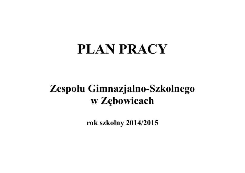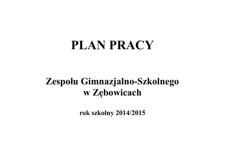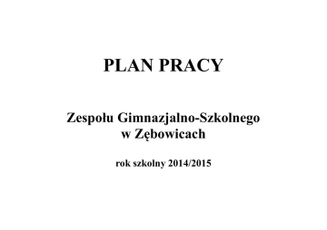 PLAN PRACY Zespołu Gimnazjalno-Szkolnego w Zębowicach rok szkolny 2014/2015 ZAGADNIENIA I. Część wstępna II. Podstawowe cele i kierunki pracy szkoły REALIZACJA OSOBA ODPOWIEDZIALNA OSOBA WSPÓŁODPOWIEDZIALNA TERMIN 1. Podstawy prawne i wytyczne do organizacji pracy szkoły w roku szkolnym 14\15 a\ zarządzenie MEN w sprawie organizacji roku szkolnego 14\15 b\ podstawowy ramowy plan nauczania w szkole podstawowej z kl. I-III, IV-VI oraz I-III GIM c\ ustalenia i zarządzenia Kuratorium Oświaty Dyrektor Wicedyrektor IX Dyrektor Wicedyrektor IX Dyrektor Wicedyrektor IX Dyrektor Wicedyrektor IX d\ wnioski z konferencji Rady Pedagogicznej z czerwca 2014r. Dyrektor Wicedyrektor IX e\ Karta Praw Dziecka Dyrektor Wicedyrektor IX f\ Deklaracja Praw Człowieka Dyrektor Wicedyrektor IX 1. Główne problemy i zadania w roku szkolnym 2014 /2015 Dyrektor Wicedyrektor IX b\ Indywidualizacja procesu nauczania Dyrektor Wicedyrektor cały rok UWAGI III. Praca Rady Pedagogicznej c\ realizacja programu wychowania i programu profilaktycznego d\ kształtowanie postaw proekologicznych, zdrowotnych w pracy szkoły 1. Konferencja Plenarna Wicedyrektor cały rok Wicedyrektor wychowawcy cały rok Dyrektor Wicedyrektor VIII a\ zatwierdzenie planu pracy szkoły Dyrektor Wicedyrektor IX b\ zatwierdzenie przydziału godzin, czynności dodatkowych i godzin ponadwymiarowych, programu profilaktycznego, zewnętrznego szkolenia nauczycieli c\ informacje i sprawy bieżące Dyrektor Wicedyrektor IX Dyrektor Wicedyrektor IX 2. Konferencje szkoleniowe Rady Pedagogicznej Dyrektor Wicedyrektor IX 2014 III/IV 2015 3. Konferencja klasyfikacyjna Dyrektor Wicedyrektor a\ klasyfikacja uczniów za I semestr b\ ocena pracy dydaktycznowychowawczej za I semestr c\ sprawozdanie z nadzoru pedagogicznego d\ spostrzeżenia pohospitacyjne 4. Konferencja Rady Pedagogicznej : a\ klasyfikacja końcowa w kl. I- Dyrektor Wicedyrektor I 2015 Dyrektor Wicedyrektor I 2015 Dyrektor Wicedyrektor I 2015 Dyrektor Dyrektor Wicedyrektor Wicedyrektor I 2015 VI 2015 Dyrektor Wicedyrektor VI 2015 I 2015 III GIM b\ klasyfikacja końcowa w kl. I-VI SP c\ ustalenie świadectw z wyróżnieniem, nagród, dyplomów d/ ocena pracy dydaktycznowychowawczej Wicedyrektor Wychowawcy Dyrektor VI 2015 VI 2015 e\ spostrzeżenia pohospitacyjne Dyrektor Wicedyrektor Kierownicy zespołów zadaniowych Wicedyrektor f\ wnioski do planu pracy na rok szkolny 2015\ 16 Dyrektor Wicedyrektor VI 2015 5. Doskonalenie organizacji pracy Rady Pedagogicznej w dziedzinie dydaktyki, wychowania i opiekidziałalność zespołów: a\ dydaktycznego Dyrektor Wicedyrektor VI 2015 Dyrektor Cały rok b/ przedmiotowych Kierownicy zespołów przedmiotowych Wicedyrektor Cały rok c/ wych. opiek. IV. Nadzór pedagogicznydoskonalenie zawodowe Dyrektor I, VI 2015 VI 2015 Cały rok 1. Kontrola rytmiczności i prawidłowości oceniania uczniów Dyrektor Wicedyrektor ostatni tydzień każdego miesiąca 2. Hospitowanie (obserwacja) zajęć dydaktycznowychowawczych i opiekuńczych 3. Opieka nad młodym Dyrektor Wicedyrektor Wg harmonogramu cały rok Dyrektor cały rok nauczycielem a\ przydział opiekunów dla młodych nauczycieli 4. Doskonalenie form pracy lekcyjnej a\ udział w lekcjach pokazowych i zespołach metodycznych b/ udział w pracach zespołów przedmiotowych i zespołach wychowawczych c/ wymiana doświadczeń metodycznych na konferencjach Rady Pedagogicznej d/ wykorzystanie wzorcowych konspektów przeprowadzonych lekcji i literatury metodycznej e/ korzystanie z dostępnej literatury metodycznej i psychologiczno- pedagogicznej 5. Udział nauczycieli w: a\ konferencjach szkoleniowych b/ spotkaniach metodycznych c/ kursach przedmiotowometodycznych e/ pracy zespołów przedmiotowych i zespołu dydaktycznego 6. Problematyka hospitacji: a/ prowadzenie dokumentacji Dyrektor Wicedyrektor przewodniczący zespołów przedmiotowych, wychowawcy Wicedyrektor Wicedyrektor Wicedyrektor IX wszyscy nauczyciele cały rok nauczyciele nauczyciele i wychowawcy IX, XI, I, IV, VI wg harmonogramu przewodniczący zespołów przedmiotowych cały rok przewodniczący zespołów przedmiotowych cały rok Lider WDN wg harmonogramu cały rok cały rok cały rok nauczyciele nauczyciele nauczyciele Dyrektor wg harmonogramu nauczyciele cały rok Wicedyrektor nauczyciele cały rok cały rok pracy nauczyciela i wychowawcy b/ diagnozowanie osiągnięć uczniów oraz realizacji programu nauczania c/ metodyka pracy lekcyjnej 7. Badania wyników nauczania V. Zadania dydaktyczne Dyrektor Wicedyrektor cały rok Dyrektor Wicedyrektor nauczyciele 1. Cele i zadania zespołu dydaktycznego i zespołów przedmiotowych: Dyrektor przewodniczący zespołów przedmiotowych cały rok wg harmonogramu IX, I, II, VI a/ ustalenie i zatwierdzenie planu pracy zespołów b/ organizacja konkursów szkolnych c/ przygotowanie uczniów do olimpiad przedmiotowych d/ przygotowanie uczniów do konkursów pozaszkolnych e/ współpraca z zespołem wychowawczym f/ praca z uczniem zdolnym i mającym trudności w nauce 2. Tematyka spotkań zespołu dydaktycznego: a/ plan pracy na rok bieżący b/ analiza wyników konkursów c/ podsumowanie pracy w I semestrze d/ podsumowanie pracy całorocznej 3. Praca z uczniem zdolnym: a/ zorganizowanie kół Dyrektor Dyrektor przewodniczący zespołów przedmiotowych nauczyciele IX cały rok Dyrektor nauczyciele Dyrektor nauczyciele wg harmonogramu cały rok Wicedyrektor nauczyciele cały rok Dyrektor nauczyciele cały rok Dyrektor IX Dyrektor Dyrektor Dyrektor IX XI I Dyrektor VI Dyrektor nauczyciele cały rok IX dla wszystkich przedmiotów dla wszystkich przedmiotów dla wszystkich przedmiotów dla wszystkich przedmiotów IX zainteresowań b/ przygotowanie uczniów do olimpiad c/ konkursy szkolne n- le przedmiotów Dyrektor d/ konkursy pozaszkolne 4. Praca z uczniem mającym trudności w nauce a/ zorganizowanie zespołów wyrównawczych b/ prowadzenie terapii pedagogicznej c/ zorganizowanie samopomocy koleżeńskiej d/ wspó