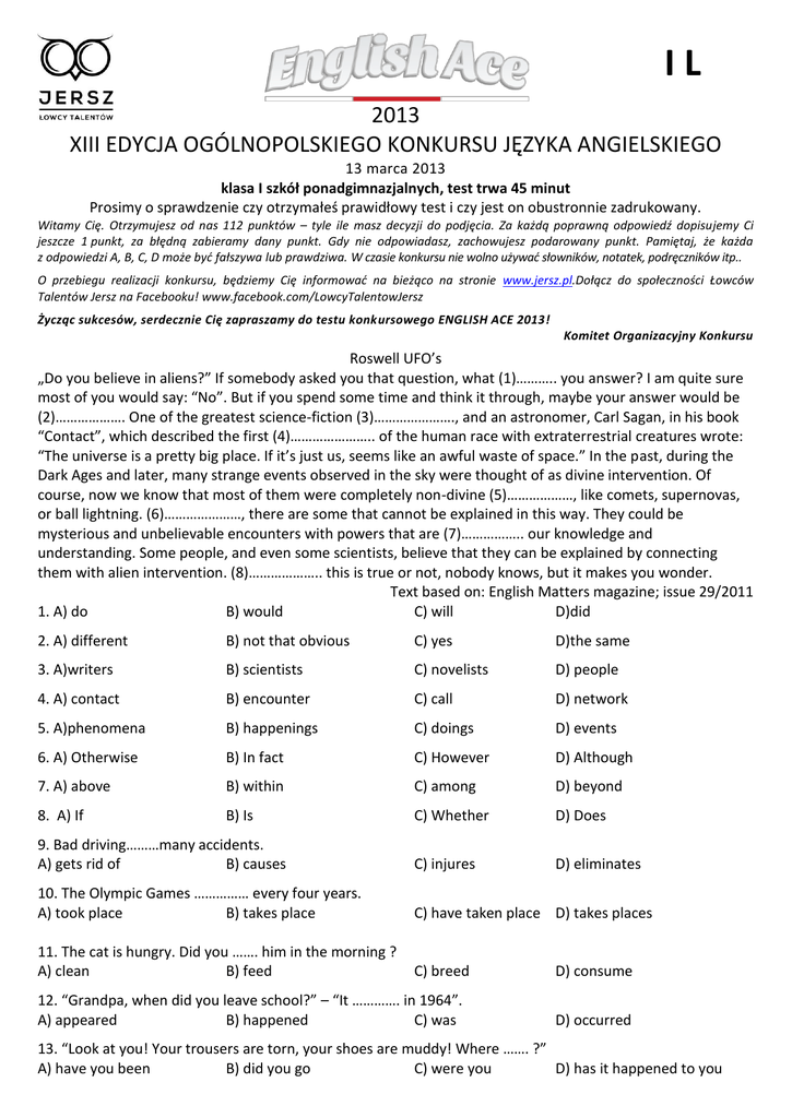 IL 2013 XIII EDYCJA OGÓLNOPOLSKIEGO KONKURSU JĘZYKA ANGIELSKIEGO 13 marca 2013 klasa I szkół ponadgimnazjalnych, test trwa 45 minut Prosimy o sprawdzenie czy otrzymałeś prawidłowy test i czy jest on obustronnie zadrukowany. Witamy Cię. Otrzymujesz od nas 112 punktów – tyle ile masz decyzji do podjęcia. Za każdą poprawną odpowiedź dopisujemy Ci jeszcze 1 punkt, za błędną zabieramy dany punkt. Gdy nie odpowiadasz, zachowujesz podarowany punkt. Pamiętaj, że każda z odpowiedzi A, B, C, D może być fałszywa lub prawdziwa. W czasie konkursu nie wolno używać słowników, notatek, podręczników itp.. O przebiegu realizacji konkursu, będziemy Cię informować na bieżąco na stronie www.jersz.pl.Dołącz do społeczności Łowców Talentów Jersz na Facebooku! www.facebook.com/LowcyTalentowJersz Życząc sukcesów, serdecznie Cię zapraszamy do testu konkursowego ENGLISH ACE 2013! Komitet Organizacyjny Konkursu Roswell UFO’s „Do you believe in aliens?” If somebody asked you that question, what (1)……….. you answer? I am quite sure most of you would say: “No”. But if you spend some time and think it through, maybe your answer would be (2)………………. One of the greatest science-fiction (3)…………………., and an astronomer, Carl Sagan, in his book “Contact”, which described the first (4)………………….. of the human race with extraterrestrial creatures wrote: “The universe is a pretty big place. If it’s just us, seems like an awful waste of space.” In the past, during the Dark Ages and later, many strange events observed in the sky were thought of as divine intervention. Of course, now we know that most of them were completely non-divine (5)………………, like comets, supernovas, or ball lightning. (6)…………………, there are some that cannot be explained in this way. They could be mysterious and unbelievable encounters with powers that are (7)…………….. our knowledge and understanding. Some people, and even some scientists, believe that they can be explained by connecting them with alien intervention. (8)……………….. this is true or not, nobody knows, but it makes you wonder. Text based on: English Matters magazine; issue 29/2011 1. A) do B) would C) will D)did 2. A) different B) not that obvious C) yes D)the same 3. A)writers B) scientists C) novelists D) people 4. A) contact B) encounter C) call D) network 5. A)phenomena B) happenings C) doings D) events 6. A) Otherwise B) In fact C) However D) Although 7. A) above B) within C) among D) beyond 8. A) If B) Is C) Whether D) Does 9. Bad driving………many accidents. A) gets rid of B) causes C) injures D) eliminates 10. The Olympic Games …………… every four years. A) took place B) takes place C) have taken place D) takes places 11. The cat is hungry. Did you ……. him in the morning ? A) clean B) feed C) breed 12. “Grandpa, when did you leave school?” – “It …………. in 1964”. A) appeared B) happened C) was D) consume D) occurred 13. “Look at you! Your trousers are torn, your shoes are muddy! Where ……. ?” A) have you been B) did you go C) were you D) has it happened to you 14. Which is the odd-one-out ? A) route B) journey C) trip D) cruise 15. ……soon…. taxi arrived, they set off for the airport. A) So/as B) No/as C) As/as D) As/so 16. Tom telephoned during lunch to invite us to go camping. = …. A) We were having lunch when Tom telephoned to invite us to go camping. B) We will go camping with pleasure. C) We were invited to go camping by Tom. D) We have never gone camping. 17. ………… of the two suspects admitted to the crime. A) Either B) Nor C) Nobody D) Neither 18. It was a silly argument – just …………….. A) a storm in a glass of water B) a blizzard on a plate C) a storm in a teacup D) a spoonful of thunder 19. The phrasal verb break up means: A) a man and woman are not together anymore C)offer hospitality B)decompose something D)stop for a period of time 20. - “What’s the weather like today?” - “It’s fine at the moment, but it …………. rain this afternoon” A) is able to rain B) should C) might D) can 21. If you look forward to something, you …. A) can see it coming soon B) can’t wait for it C) anticipate something very much D) hate it 22. You can have a slice of ….. A) beef B) apple pie C) milk D) bread 23. Tony is very …………….. He never remembers our anniversary. A) thoughtful B) forgetful C) absent-minded D) tactful 24. For a person who has …………………. Harvard, he has a rather low salary. A) graduated B) graduated on C) graduated at D) graduated from 25. If Tom had told me you’re here, I …………………. you. A) would visit B) would have visited D) will visit C) would visited 26. The first English settlers (Pilgrims) who came to America in 17th century travelled on a ship called …. A) Santa Maria B) Mayflower Compact C) Mayflower D) Britannic 27. Which anniversary of Oscar Academy Awards was organized in 2013 ? A) 85th B) 90th C) 92nd D) 100th 28. The nickname “the People’s Princess” refers to: A) Lady Diana Spencer B) Marilyn Monroe D) Camilla Parker Bowles PARTNERZY C) Kate Middleton PATRONI © Copyright by ŁOWCY TALENTÓW – JERSZ, Wilczyn 2013, www.jersz.pl