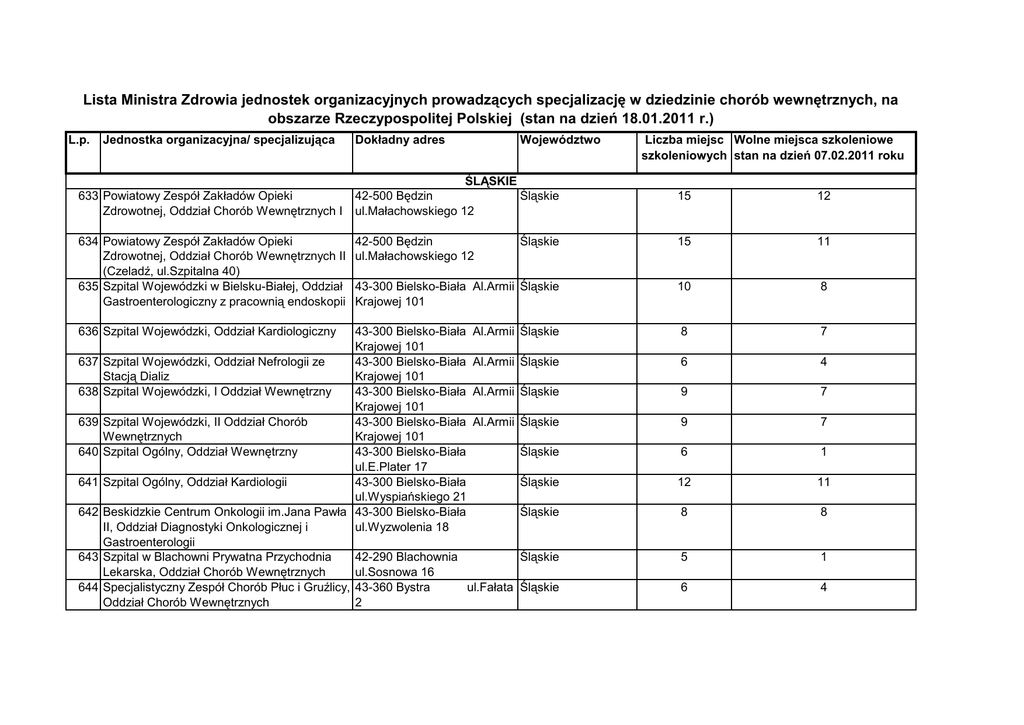 Lista Ministra Zdrowia jednostek organizacyjnych prowadzących specjalizację w dziedzinie chorób wewnętrznych, na obszarze Rzeczypospolitej Polskiej (stan na dzień 18.01.2011 r.) L.p. Jednostka organizacyjna/ specjalizująca 633 Powiatowy Zespół Zakładów Opieki Zdrowotnej, Oddział Chorób Wewnętrznych I 634 Powiatowy Zespół Zakładów Opieki Zdrowotnej, Oddział Chorób Wewnętrznych II (Czeladź, ul.Szpitalna 40) 635 Szpital Wojewódzki w Bielsku-Białej, Oddział Gastroenterologiczny z pracownią endoskopii Dokładny adres Województwo ŚLĄSKIE 42-500 Będzin Śląskie ul.Małachowskiego 12 Liczba miejsc Wolne miejsca szkoleniowe szkoleniowych stan na dzień 07.02.2011 roku 15 12 Śląskie 15 11 43-300 Bielsko-Biała Al.Armii Śląskie Krajowej 101 10 8 42-500 Będzin ul.Małachowskiego 12 636 Szpital Wojewódzki, Oddział Kardiologiczny Śląskie 8 7 637 Śląskie 6 4 Śląskie 9 7 Śląskie 9 7 Śląskie 6 1 Śląskie 12 11 Śląskie 8 8 Śląskie 5 1 Śląskie 6 4 638 639 640 641 642 643 644 43-300 Bielsko-Biała Al.Armii Krajowej 101 Szpital Wojewódzki, Oddział Nefrologii ze 43-300 Bielsko-Biała Al.Armii Stacją Dializ Krajowej 101 Szpital Wojewódzki, I Oddział Wewnętrzny 43-300 Bielsko-Biała Al.Armii Krajowej 101 Szpital Wojewódzki, II Oddział Chorób 43-300 Bielsko-Biała Al.Armii Wewnętrznych Krajowej 101 Szpital Ogólny, Oddział Wewnętrzny 43-300 Bielsko-Biała ul.E.Plater 17 Szpital Ogólny, Oddział Kardiologii 43-300 Bielsko-Biała ul.Wyspiańskiego 21 Beskidzkie Centrum Onkologii im.Jana Pawła 43-300 Bielsko-Biała II, Oddział Diagnostyki Onkologicznej i ul.Wyzwolenia 18 Gastroenterologii Szpital w Blachowni Prywatna Przychodnia 42-290 Blachownia Lekarska, Oddział Chorób Wewnętrznych ul.Sosnowa 16 Specjalistyczny Zespół Chorób Płuc i Gruźlicy, 43-360 Bystra ul.Fałata Oddział Chorób Wewnętrznych 2 645 SP ZOZ Wojewódzki Szpital Specjalistyczny, II Oddział Chorób Wewnętrznych 41-902 Bytom ul.Al. Legionów Śląskie 12 10 646 SP ZOZ Wojewódzki Szpital Specjalistyczny nr 4, III Oddział Chorób Wewnetrznych 41-902 Bytom Al.Legionów 10 Śląskie 6 3 647 Wojewódzki Szpital Specjalistyczny nr 4, Oddział Nefrologii 648 SP ZOZ Wojewódzki Szpital Spcjalistyczny nr 4, Oddział Kardiologii 649 Szpital Specjalistyczny nr 2, Katedra i Oddział Kliniczny Chorób Wewnętrznych, Angiologii i Medycyny Fizykalnej Śl.UM 650 Szpital Specjalistyczny nr 1, Oddział Kardiologii ze stanowiskami intensywnego nadzoru 651 Szpital Specjalistyczny nr 1, Katedra i Oddział Kliniczny Chorób Wewnętrznych Śl.AM 41-902 Bytom Al.Legionów 10 41-902 Bytom Al.Legionów 10 41-902 Bytom ul.Stefana Batorego 15 Śląskie 6 6 Śląskie 3 3 Śląskie 25 17 41-902 Bytom ul.Żeromskiego 7 Śląskie 4 4 41-902 Bytom ul.Żeromskiego 7 Śląskie 9 8 652 SP ZOZ Zespół Szpitali Miejskich, Oddział Wewnętrzny z Pododdziałem Geriatrii 653 SP ZOZ Zespół Szpitali Miejskich, Oddział Chorób Wewnętrznych 654 SPZOZ Zespół Szpitali Miejskich, Oddział Kardiologiczny 655 ZZOZ Szpital Śląski, Oddział Nefrologiczny z Pododdziałem Chorób Wewnętrznych 656 ZZOZ Szpital Śląski, Oddział Chorób Wewnętrznych III 657 ZZOZ Szpital Śląski, Oddział Chorób Wewnętrznych II 658 ZZOZ Szpital Śląski, Oddział Chorób Wewnętrznych I 659 SP ZOZ SzpitalChorób Wewnętrznych "HUTNICZY", Oddział Chorób Wewnętrznych z OIOK 41-500 Chorzów ul.Strzelców Bytomskich 11 41-500 Chorzów ul.Strzelców Bytomskich 11 41-500 Chorzów ul.Strzelców Bytomskich 11 43-400 Cieszyn ul.Bielska 4 43-400 Cieszyn ul.Bielska 4 43-400 Cieszyn ul.Bielska 4 43-400 Cieszyn ul.Bielska 4 42-200 Częstochowa Al.Pokoju 44 Śląskie 6 2 Śląskie 15 5 Śląskie 6 4 Śląskie 3 3 Śląskie 12 9 Śląskie 6 2 Śląskie 9 9 Śląskie 9 5 660 Wojewódzki Szpital Specjalistyczny im. NMP, Oddział Kardiologii 661 Wojewódzki Szpital Specjalistyczny im. NMP, Oddział Gastroenterologii i Chorób Wewnętrznych 662 Wojewódzki Szpital Specjalistyczny im. NMP, Oddział Nefrologii i Stacja Dializ 663 Wojewódzki Szpital Specjalistyczny im. NMP, Oddział Chorób Wewnętrznych (ul.PCK 1) 42-200 Częstochowa ul.Bialska 104/108 42-200 Częstochowa ul.Bialska 104/118 Śląskie 5 5 Śląskie 9 7 42-200 Częstochowa ul.Bialska 104/118 42-200 Częstochowa ul.Bialska 104/118 Śląskie 5 4 Śląskie 6 2 Wpis na listę do czasu zaopiniowania wniosku przez Zespół Ekspertów Śląskie 3 3 12 8 42-200 Częstochowa ul.Mirowska 15 Śląskie 20 20 41-300 Dąbrowa Górnicza ul.Szpitalna 13 Śląskie 6 6 41-300 Dąbrowa Górnicza ul.Szpitalna 13 Śląskie 15 10 669 Szpital Specjalistyczny im. Sz. Starkiewicza w 41-300 Dąbrowa Górnicza Dąbrowie Górniczej, Oddział Kardiologiczny ul.Szpitalna 13 ze Stanowiskami Intensywnego Nadzoru Śląskie 3 1 670 NZOZ Szpital Miejski Sp. z o.o., Oddział Wewnętrzno-Nefrologiczny 671 NZOZ Szpital Miejski Sp. z o.o., Oddział Kardiologiczny z Pododdziałem Intensywnego Nadzoru Kardiologicznego Śląskie 9 8 Śląskie 6 6 664 Wojewódzki Szpital Specjalistyczny im. NMP, 42-200 Częstochowa Oddział Nefrologii z ośrodkiem dializy ul.Bialska 104/118 pozaustrojowej (ul.PCK 1) 665 SP ZOZ Miejski Szpital Zespolony, Oddział 42-200 Częstochowa Chorób Wewnętrznych przy ul.Mickiewicza 12 ul.Mirowska 15 666 SP ZOZ Miejski Szpital Zespolony, Oddział Chorób Wewnętrznych z pododdziałem przy ul.Bony 1/3 667 Szpital Specjalistyczny im. Sz. Starkiewicza w Dąbrowie Górniczej, Oddział Chorób Wewnętrznych i Nefrologii 668 Szpital Specjalistyczny im. Sz. Starkiewicza w Dąbrowie Górniczej, Oddział Wewnętrzny 44-100 Gliwice ul.Kościuszki 29 44-100 Gliwice ul.Kościuszki 29 672 NZOZ VITO-MED sp. z o.o., Oddział Wewnętrzny 673 Centrum Onkologii - Instytut im.M.Skłodowskiej-Curie, Oddział w Gliwicach, Zakład Medycyny Nuklearnej i Endokrynologii Onkologicznej 674 SP ZOZ 106 Szpital Wojskowy, Oddział Chorób Wewnętrznych 675 Wojewódzki Szpital Specjalistyczny nr 2, Oddział Kardiologiczno- Wewn
