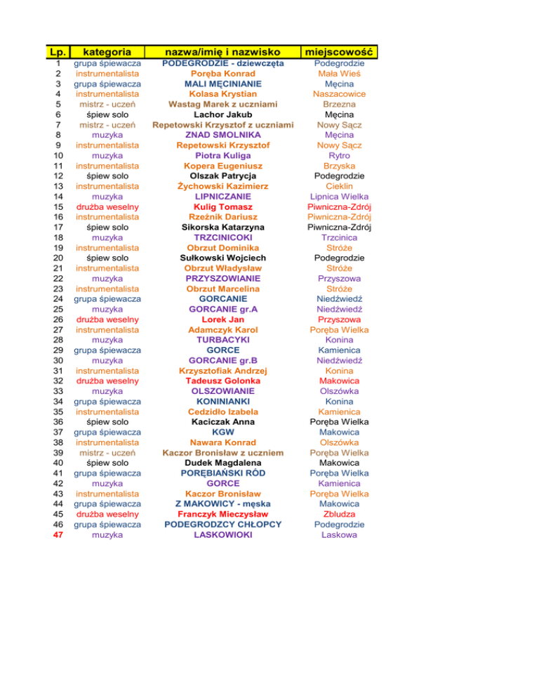 Lp. kategoria nazwa/imię i nazwisko miejscowość