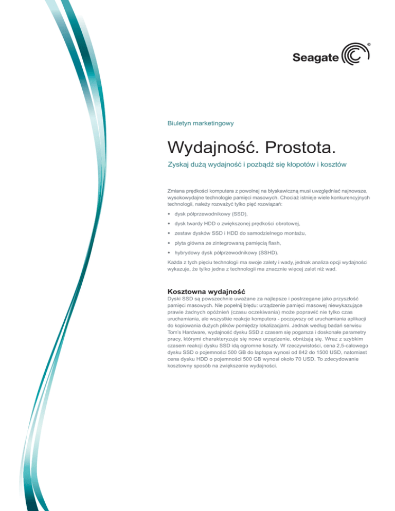 Biuletyn marketingowy Wydajność. Prostota. Zyskaj dużą wydajność i pozbądź się kłopotów i kosztów Zmiana prędkości komputera z powolnej na błyskawiczną musi uwzględniać najnowsze, wysokowydajne technologie pamięci masowych. Chociaż istnieje wiele konkurencyjnych technologii, należy rozważyć tylko pięć rozwiązań: • dysk półprzewodnikowy (SSD), • dysk twardy HDD o zwiększonej prędkości obrotowej, • zestaw dysków SSD i HDD do samodzielnego montażu, • płyta główna ze zintegrowaną pamięcią flash, • hybrydowy dysk półprzewodnikowy (SSHD). Każda z tych pięciu technologii ma swoje zalety i wady, jednak analiza opcji wydajności wykazuje, że tylko jedna z technologii ma znacznie więcej zalet niż wad. Kosztowna wydajność Dyski SSD są powszechnie uważane za najlepsze i postrzegane jako przyszłość pamięci masowych. Nie popełnij błędu: urządzenie pamięci masowej niewykazujące prawie żadnych opóźnień (czasu oczekiwania) może poprawić nie tylko czas uruchamiania, ale wszystkie reakcje komputera - począwszy od uruchamiania aplikacji do kopiowania dużych plików pomiędzy lokalizacjami. Jednak według badań serwisu Tom’s Hardware, wydajność dysku SSD z czasem się pogarsza i doskonałe parametry pracy, którymi charakteryzuje się nowe urządzenie, obniżają się. Wraz z szybkim czasem reakcji dysku SSD idą ogromne koszty. W rzeczywistości, cena 2,5-calowego dysku SSD o pojemności 500 GB do laptopa wynosi od 842 do 1500 USD, natomiast cena dysku HDD o pojemności 500 GB wynosi około 70 USD. To zdecydowanie kosztowny sposób na zwiększenie wydajności. Wydajność. Prostota. Zyskaj dużą wydajność i pozbądź się kłopotów i kosztów Producenci płyt głównych próbują pomóc Wydajność stabilnego poziomu Prędkość (MB/s) 300 Wydajność zapisu losowego 4 KB, Q = 32, wierzchołek 3 120 GB Stabilny poziom 250 200 150 100 50 0 Urządzenie fabrycznie nowe (FOB) 0 20 40 Czas 60 80 100 Rysunek 1. Stabilny poziom dysku SSD wg serwisu Tom’s Hardware1 Zwiększ obroty. Zwiększ prędkość. Zwiększ obciążenie. Jeśli przyjrzymy się tendencjom w sektorze dysków HDD z ostatnich 30 lat, okazuje się, że prędkość obrotowa dysku wzrosła z około 3600 obr./min aż do 15000 obr./min! Zwiększenie obrotów umożliwia głowicom w dyskach HDD szybciej odczytywać i zapisywać dane w interfejsie, dzięki czemu system reaguje szybciej. Jednak wraz ze zwiększeniem szybkości wzrasta obciążenie systemu, a komputer musi przekazać więcej energii do napędu, aby utrzymać prędkość obrotową. Dysk twardy HDD pracujący z prędkością 10 tys. obr./min będzie wibrować odrobinę mocniej z powodu większej prędkości i prawdopodobnie będzie emitować więcej ciepła i hałasu. Jednak nie stanowi to problemu dzięki przystosowaniu obudowy serwera do takich warunków mechanicznych. Niemniej jednak, w przypadku komputerów stacjonarnych lub środowiska biurowego / domowego, zwiększona emisja hałasu i ciepła oraz zwiększony pobór mocy nie będą mile widziane przez użytkownika. Zatem zwiększenie obrotów w urządzeniu pamięci masowej niekoniecznie jest rozwiązaniem oczeki wanym przez klientów. Kreatywne zestawy dla entuzjastów Wielu maniaków wydajności pokazało swój innowacyjny charakter łącząc mały dysk SSD z dużym dyskiem, aby uzyskać szybką reakcję i oszczędną pamięć masową. To faktycznie bardzo kreatywne podejście, jednak nie każdy dysponuje umiejętnościami lub sprzętem, aby to wszystko razem połączyć. Istotnie, wraz ze zmniejszaniem rozmiarów laptopów, bardzo rzadko można znaleźć taki, który oferuje przestrzeń dla dwóch urządzeń pamięci masowej. Jednak jeśli to się powiedzie, system operacyjny można zainstalować na dysku rozruchowym SSD i przenieść wszystkie pozostałe programy i pliki na dysk twardy HDD. Dzięki temu pamięć podręczna systemu operacyjnego reaguje bardzo szybko. Poza tym, można nabyć większy dysk SSD i instalować na nim jeszcze więcej, jednak koszty zwiększą się wraz ze wzrostem jego pojemności. To kwestia zrównoważenia budżetu przeznaczonego na pamięć masową i posiadania sprzętu, który na to pozwoli. Naprawdę! Jeden z producentów płyt głównych oferuje chipset płyty głównej, w którym moduł cache podręcznej pamięci flash zintegrowano bezpośrednio na płycie, co umożliwia połączenie jej z dowolnym dyskiem HDD i pozwala cieszyć się szybkim rozruchem. O ile niektórzy producenci OEM laptopów wprowadzają tę nową technologię, jest to obecnie opcja oferowana wyłącznie w komputerach stacjonarnych, natomiast modernizacja laptopa z wykorzystaniem dysku HDD z komputera stacjonarnego oznacza prawdopodobnie zbyt dużo wysiłku, aby przeciętny użytkownik chciał się tego podjąć. Należy również posiadać właściwy chipset, BIOS i sterowniki - nie zapominając o module podręcznej pamięci flash - oraz, oczywiście, dysk twardy. To zbyt wiele elementów tylko po to, aby komputer lub laptop był szybszy! Jeśli zwiększenie wydajności w obecnym systemie jest wszystkim, czego chcesz, moduł pamięci podręcznej flash będzie prawdopodobnie niewłaściwym rozwiązaniem. Po co wybierać pomiędzy dyskiem SSD, prędkością obrotową, zestawami i płytą główną? A co z innymi opcjami? A gdyby tak wyeliminować wysoką cenę dysku SSD, problemy wiążące się ze zwiększeniem prędkości obrotowej, problematyczne połączenie dwóch technologii oraz problemy z kompa tybilnością tysięcy płyt głównych, wersji systemów operacyjnych, chipsetów, biosem i aplikacjami? Co powiesz na to, że wystarczy wyjąć stary dysk i zainstalować nowe urządzenie, aby nawet 3-krotnie zwiększyć wydajność obecnego systemu? A gdyby tak urządzenie zapewniało do 750 GB pojemności, pracowało z prędkością zaledwie 7200 obr./min, dostarczało dane z prędkością 6 GB/s i uruchamiało system w około 20 sekund? Co s