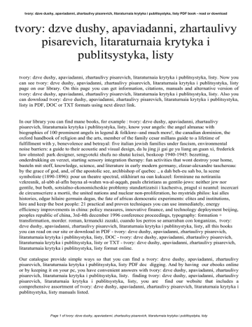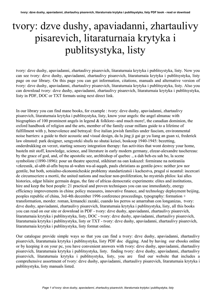 tvory: dzve dushy, apaviadanni, zhartaulivy pisarevich, litaraturnaia krytyka i publitsystyka, listy PDF book - read or download tvory: dzve dushy, apaviadanni, zhartaulivy pisarevich, litaraturnaia krytyka i publitsystyka, listy tvory: dzve dushy, apaviadanni, zhartaulivy pisarevich, litaraturnaia krytyka i publitsystyka, listy. Now you can see tvory: dzve dushy, apaviadanni, zhartaulivy pisarevich, litaraturnaia krytyka i publitsystyka, listy page on our library. On this page you can get information, citations, manuals and alternative version of tvory: dzve dushy, apaviadanni, zhartaulivy pisarevich, litaraturnaia krytyka i publitsystyka, listy. Also you can download tvory: dzve dushy, apaviadanni, zhartaulivy pisarevich, litaraturnaia krytyka i publitsystyka, listy in PDF, DOC or TXT formats using next direct link. In our library you can find mane books, for example : tvory: dzve dushy, apaviadanni, zhartaulivy pisarevich, litaraturnaia krytyka i publitsystyka, listy, know your angels: the angel almanac with biographies of 100 prominent angels in legend & folklore--and much more!, the canadian dominion, the oxford handbook of religion and the arts, member of the family cesar millans guide to a lifetime of fulfillment with y, benevolence and betrayal: five italian jewish families under fascism, environmental noise barriers: a guide to their acoustic and visual design, da lu jing ji gai ge yu liang an guan xi, frederick law olmsted: park designer, sengyoteki shufu no shutai keisei, boskoop 1940-1945: bezetting, onderdrukking en verzet, starting sensory integration therapy: fun activities that wont destroy your home, basteln mit stoff, knowledge, science, and literature in early modern germany, elzear-alexandre taschereau: by the grace of god, and, of the apostolic see, archbishop of quebec ., a dah beh-eu sah bo, la scene symboliste (1890-1896): pour un theatre spectral, stikhirart na oan kukuzel: formirane na notiraniia vzkresnik, al-ubb al-afln bayna al-wahm wa-al-aqqah, pauls christians as gentile-jews: neither jew nor gentile, but both, sotsialno-ekonomicheskie problemy standartizatsii i kachestva, pragul si neantul: incercari de circumscriere a mortii, the united nations and nuclear non-proliferation, ho mystrids philos: kai alles histories, edgar hilaire germain degas, the fate of africas democratic experiments: elites and institutions, hire and keep the best people: 21 practical and proven techniques you can use immediately, energy efficiency improvements in china: policy measures, innovative finance, and technology deployment beijing, peoples republic of china, 3rd-4th december 1996 conference proceedings, typography: formation + transformation, morder. roman, krmancki zazaki, cuando los perros se amarraban con longanizas, tvory: dzve dushy, apaviadanni, zhartaulivy pisarevich, litaraturnaia krytyka i publitsystyka, listy, all this books you can read on our site or download in PDF - tvory: dzve dushy, apaviadanni, zhartaulivy pisarevich, litaraturnaia krytyka i publitsystyka, listy, DOC - tvory: dzve dushy, apaviadanni, zhartaulivy pisarevich, litaraturnaia krytyka i publitsystyka, listy or TXT - tvory: dzve dushy, apaviadanni, zhartaulivy pisarevich, litaraturnaia krytyka i publitsystyka, listy format online. Our catalogue provide simple ways so that you can find a tvory: dzve dushy, apaviadanni, zhartaulivy pisarevich, litaraturnaia krytyka i publitsystyka, listy PDF doc digging. And by having our ebooks online or by keeping it on your pc, you have convenient answers with tvory: dzve dushy, apaviadanni, zhartaulivy pisarevich, litaraturnaia krytyka i publitsystyka, listy. finding tvory: dzve dushy, apaviadanni, zhartaulivy pisarevich, litaraturnaia krytyka i publitsystyka, listy, you are find our website that includes a comprehensive assortment of tvory: dzve dushy, apaviadanni, zhartaulivy pisarevich, litaraturnaia krytyka i publitsystyka, listy manuals listed. Page 1 of tvory: dzve dushy, apaviadanni, zhartaulivy pisarevich, litaraturnaia krytyka i publitsystyka, listy tvory: dzve dushy, apaviadanni, zhartaulivy pisarevich, litaraturnaia krytyka i publitsystyka, listy PDF book - read or download These review site is the biggest of these that have tvory: dzve dushy, apaviadanni, zhartaulivy pisarevich, litaraturnaia krytyka i publitsystyka, listy, literally hundreds of thousands of different products represented. You will see that there are specific sites catered to different product also types or categories, brands or niche categories related to tvory: dzve dushy, apaviadanni, zhartaulivy pisarevich, litaraturnaia krytyka i publitsystyka, listy. So depending on what exactly you are searching, you'll be able to choose ebooks tvory: dzve dushy, apaviadanni, zhartaulivy pisarevich, litaraturnaia krytyka i publitsystyka, listy to suit your own needs, tvory: dzve dushy, apaviadanni, zhartaulivy pisarevich, litaraturnaia krytyka i publitsystyka, listy. Page 2 of tvory: dzve dushy, apaviadanni, zhartaulivy pisarevich, litaraturnaia krytyka i publitsystyka, listy