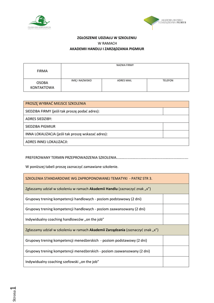 ZGŁOSZENIE UDZIAŁU W SZKOLENIU W RAMACH AKADEMII HANDLU I ZARZĄDZANIA PIGMIUR NAZWA FIRMY FIRMA OSOBA KONTAKTOWA IMIĘ I NAZWISKO ADRES MAIL TELEFON PROSZĘ WYBRAĆ MIEJSCE SZKOLENIA SIEDZIBA FIRMY (jeśli tak proszę podać adres): ADRES SIEDZIBY: SIEDZIBA PIGMIUR INNA LOKALIZACJA (jeśli tak proszę wskazać adres): ADRES INNEJ LOKALIZACJI: PREFEROWANY TERMIN PRZEPROWADZENIA SZKOLENIA……………………………………………………………………. W poniższej tabeli proszę zaznaczyć zamawiane szkolenie. SZKOLENIA STANDARDOWE WG ZAPROPONOWANEJ TEMATYKI - PATRZ STR 3. Zgłaszamy udział w szkoleniu w ramach Akademii Handlu (zaznaczyć znak „x”) Grupowy trening kompetencji handlowych - poziom podstawowy (2 dni) Grupowy trening kompetencji handlowych - poziom zaawansowany (2 dni) Indywidualny coaching handlowców „on the job” Zgłaszamy udział w szkoleniu w ramach Akademii Zarządzania (zaznaczyć znak „x”) Grupowy trening kompetencji menedżerskich - poziom podstawowy (2 dni) Grupowy trening kompetencji menedżerskich - poziom zaawansowany (2 dni) Strona 1 Indywidualny coaching szefowski „on the job” Jesteśmy zainteresowani zorganizowaniem szkolenia wg naszych indywidualnych potrzeb. Interesuje nas następująca tematyka: Grupowy trening kompetencji handlowych Proces i techniki skutecznej sprzedaży, Aktywne słuchanie Typologia klienta Profesjonalna obsługa klienta i telemarketing Zarządzanie czasem Różne modele negocjacji Taktyki, gry i style negocjacyjne Asertywność Reguły wywierania wpływu społecznego w negocjacjach BATNA Radzenie sobie ze stresem Indywidualny coaching handlowców „on the job” Inne tematy – proszę podać jakie: Grupowy trening kompetencji menedżerskich Expose szefa Aktywne słuchanie, udzielanie informacji zwrotnej – model FUO Motywowanie pracowników (nagradzanie, karanie, zwalnianie) Skuteczne rekrutowanie Zarządzanie przez cele – targety, czyli SMART w praktyce Diagnoza stylu kierowania Prezentacje i wystąpienia publiczne Zarządzanie jakością i innowacyjnością Proces grupowy i budowanie zespołu Delegowanie zadań, uprawnień i odpowiedzialność podwładnym Negocjacje i asertywność szefa Rozwój – coaching podwładnych Radzenie sobie ze stresem i wypaleniem zawodowym podwładnych Zarządzanie zmianą i konfliktem Strona 2 System ocen okresowych Indywidualny coaching szefowski „on the job” Inne tematy – proszę podać jakie: TEMATYKA SZKOLEŃ STANDARDOWYCH AKADEMIA HANDLU 1. Grupowy trening kompetencji handlowych - poziom podstawowy (2 dni): a) b) c) d) e) f) Proces i techniki skutecznej sprzedaży, Aktywne słuchanie, Typologia klienta, Profesjonalna obsługa klienta i telemarketing, Merchandising, Zarządzanie czasem. 2. Grupowy trening kompetencji handlowych - poziom zaawansowany (2 dni): a) b) c) d) e) f) Różne modele negocjacji, Taktyki, gry i style negocjacyjne, Asertywność, Reguły wywierania wpływu społecznego w negocjacjach, BATNA, Radzenie sobie ze stresem. AKADEMIA ZARZĄDZANIA 1. Grupowy trening kompetencji menedżerskich - poziom podstawowy (2 dni): a) b) c) d) e) f) g) h) Expose szefa, Aktywne słuchanie, udzielanie informacji zwrotnej – model FUO, Motywowanie pracowników (nagradzanie, karanie, zwalnianie), Skuteczne rekrutowanie, Zarządzanie przez cele – targety, czyli SMART w praktyce, Diagnoza stylu kierowania, Prezentacje i wystąpienia publiczne, Zarządzanie jakością i innowacyjnością. 2. Grupowy trening kompetencji menedżerskich - poziom zaawansowany (2 dni): Strona 3 a) b) c) d) e) f) g) h) Proces grupowy i budowanie zespołu, Delegowanie zadań, uprawnień i odpowiedzialność podwładnym, Negocjacje i asertywność szefa, Rozwój – coaching podwładnych, Radzenie sobie ze stresem i wypaleniem zawodowym podwładnych, Zarządzanie zmianą i konfliktem, System ocen okresowych, Analiza strategiczna i/lub finansowa firmy.
