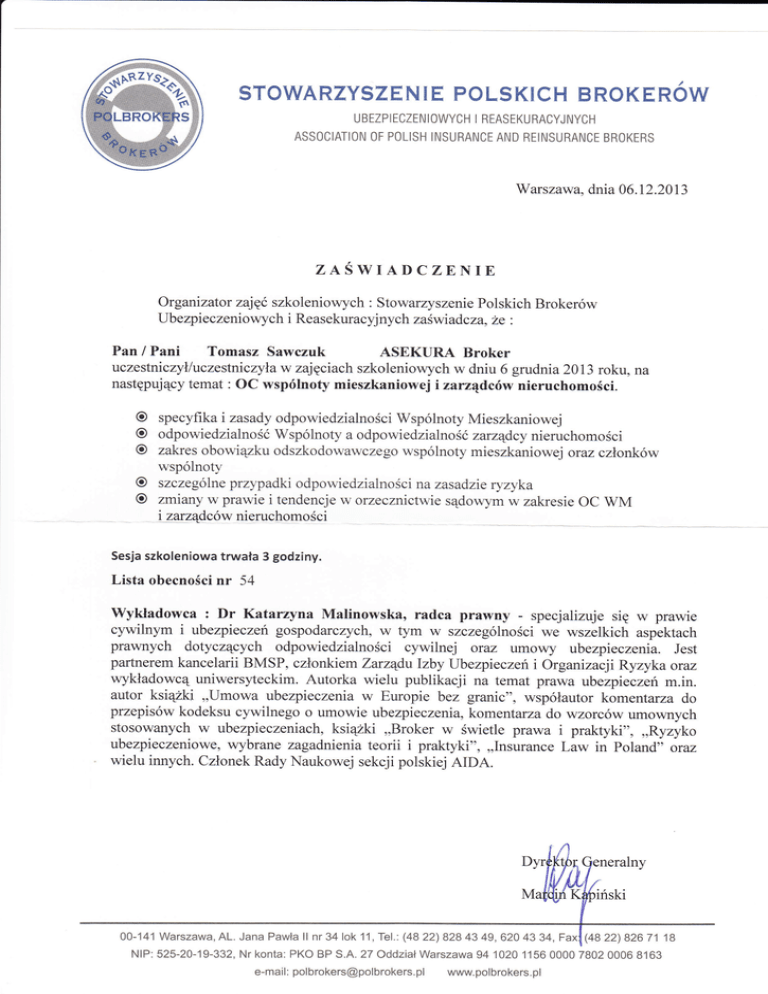 STOWARZYSZEN I E POLSKICH BROKEROW UBEZPlECZENlOWYCH l REASEKURACYJNYCH ASSOClATlON 0F POLlSH lNsURANCE AND RElNSURANCE BROKERS Warszawa, dnia 06.T2.20 13 ZAŚWIADCZENIE organtzator zajęć szkoleniowych : stowarzyszenie polskich Brokerów Ubezpieczeniowych i Reasekuracyjnych zaświadcza, że : pani pan / Tomasz sawczuk ASEKURA Broker uczestniczyłluczestniczyław zajęciachszkoleniowych w dniu 6 grudnia 2013 roku, na następujący temat : OC wspólnoty mieszkaniowej i zarządców nieruchomości. O O O O O specyfika i zasady odpowiedzialności Wspólnoty Mieszkaniowej odpowiedzialno śćWspólnoty a odpowi ed zialno sc zaruądcy nieruchomo ści zakres obowiązku odszkodowawczego wspólnoty mieszkaniowej oraz członków wspólnoĘ szcze golne pr zy p adkt odpowiedzialno ścina zasadzie ry zyka zmiany w prawie i tendencje w otzecznlctwie sądowym w zakresie OC WM i zątządców nieruchomości Sesja szkoleniowa trwała 3 godziny. Lista obecności nr 54 Wykładowca : Dr Katarzyna Malinowska, radca prawny - specjalizuje się w prawie cywilnym i ubezpieczeń gospodarczych, w tym w szczególności we wszelkich aspektach Prawnych dotyczących odpowiedzialności cywilnej oraz umowy ubezpieczenia. Jest partnerem kancelarii BMSP, członkiem Zarządulzby lJbezpięczeni OrganizacjtRyzyka oraz wykładowcą uniwersyteckim. Autorka wielu publikacji na temat prawa ubezpieczeń m.in. autor ksiązki ,,Umowa ubezpieczenia w Europie bez granic", współautor komentarza do przepisów kodeksu cywilnego o umowie ubezpieczenia, komentarza do wzorców umownych stosowanych w ubezpieczeniach, książki ,,Broker w świetleprawa i praktyki", ,,Ryzyko ubezpieczeniowe, wybrane zagadnienia teorii i praktyki", ,,Insurance Law in Poland" oraz wielu innych. Członek Rady Naukowej sekcji polskiej AIDA. 00-141 Warszawa, AL. Jana Pawła ll nr 34 lok 'l1, Tel,: (48 22) 828 43 49,620 43 34, Fax (4822)8267118 NlP: 525-20-19-332, Nr konta: PKO BP S.A, 27 Oddział Warszawa 94 10201156 0000 7802 0006 8163 e-mail: [email protected] www.polbrokers.pl