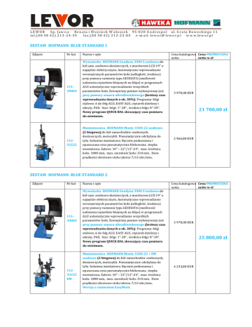 LEW OR S p . Ja w n a R e n a ta i W o jc ie ch W a ło s z e k 9 5 -0 2 0 A n d r e s p o l u l. G r o ta R o w e c k ie g o 1 1 te l.(0 0 4 8 4 2 ) 2 1 3 -2 4 -3 9 fa x .(0 0 4 8 4 2 ) 2 1 2 -2 3 -8 5 e -m a il: le w o r @ le w o r.p l w w w .le w o r.p l ZESTAW HOFMANN BLUE STANDARD 1 Zdjęcie Nr kat Nazwa i opis 11139003 Wyważarka HOFMANN Geodyna 3900 S osobowa do kół sam. osobowo-dostawczych, z monitorem LCD 19” o napędzie elektrycznym. Automatyczne wprowadzanie wewnętrznych parametrów koła (odległość, średnica) przy pomocy ramienia typu GEODATA (możliwość nałożenia ciężarków klejonych na klips) w programach ALU automatyczne wprowadzanie wszystkich parametrów koła. Zewnętrzny pomiar wykonywany jest przy pomocy sonaru ultradźwiękowego (krótszy czas wprowadzania danych o ok. 30%). Programy: felgi stalowe, 6 do felg ALU, EASY ALU, ciężarek dzielony i ukryty, PAX. Szer. felgi: 1”-20” , średnica felgi: 8”-30”. Nowy program QUICK BAL skracający czas pomiaru do minimum. 11233222 Montażownica HOFMANN Monty 3300-22 osobowa (2 biegowa) do kół samochodów osobowych, dostawczych, motocykli. Pneumatycznie odchylana do tyłu kolumna montażowa. Ręcznie podnoszona i opuszczana oraz pneumatycznie blokowana stopka montażowa. Zakres: 10” – 22”/12”-24”, max. średnica koła: 1000 mm, max. szerokość koła: 310 mm. Dwie prędkości obrotowe stołu talerza 7/13 obr/min. Cena katalogowa Cena PROMOCYJNA netto netto w zł 3 970,00 EUR 21 700,00 zł 2 966,00 EUR ZESTAW HOFMANN BLUE STANDARD 2 Zdjęcie Nr kat Nazwa i opis 11139003 Wyważarka HOFMANN Geodyna 3900 S osobowa do kół sam. osobowo-dostawczych, z monitorem LCD 19” o napędzie elektrycznym. Automatyczne wprowadzanie wewnętrznych parametrów koła (odległość, średnica) przy pomocy ramienia typu GEODATA (możliwość nałożenia ciężarków klejonych na klips) w programach ALU automatyczne wprowadzanie wszystkich parametrów koła. Zewnętrzny pomiar wykonywany jest przy pomocy sonaru ultradźwiękowego (krótszy czas wprowadzania danych o ok. 30%). Programy: felgi stalowe, 6 do felg ALU, EASY ALU, ciężarek dzielony i ukryty, PAX. Szer. felgi: 1”-20” , średnica felgi: 8”-30”. Nowy program QUICK BAL skracający czas pomiaru do minimum. 11233222 EM Montażownica HOFMANN Monty 3300-22 + EM osobowa (2 biegowa) do kół samochodów osobowych, dostawczych, motocykli. Pneumatycznie odchylana do tyłu kolumna montażowa. Ręcznie podnoszona i opuszczana oraz pneumatycznie blokowana stopka montażowa. Zakres: 10” – 22”/12”-24”, max. średnica koła: 1000 mm, max. szerokość koła: 310 mm. Dwie prędkości obrotowe stołu talerza 7/13 obr/min. Wersja z ramieniem EasyMont. Cena katalogowa Cena PROMOCYJNA netto netto w zł 3 970,00 EUR 25 800,00 zł 4 233,00 EUR