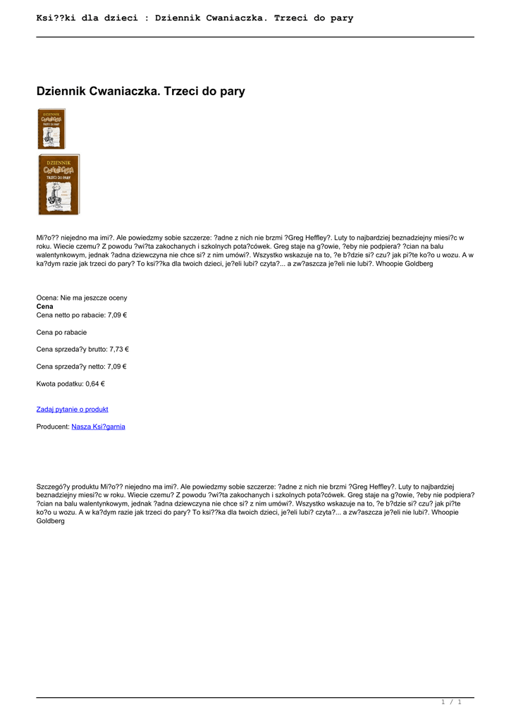 Ksi??ki dla dzieci : Dziennik Cwaniaczka. Trzeci do pary Dziennik Cwaniaczka. Trzeci do pary Mi?o?? niejedno ma imi?. Ale powiedzmy sobie szczerze: ?adne z nich nie brzmi ?Greg Heffley?. Luty to najbardziej beznadziejny miesi?c w roku. Wiecie czemu? Z powodu ?wi?ta zakochanych i szkolnych pota?cówek. Greg staje na g?owie, ?eby nie podpiera? ?cian na balu walentynkowym, jednak ?adna dziewczyna nie chce si? z nim umówi?. Wszystko wskazuje na to, ?e b?dzie si? czu? jak pi?te ko?o u wozu. A w ka?dym razie jak trzeci do pary? To ksi??ka dla twoich dzieci, je?eli lubi? czyta?... a zw?aszcza je?eli nie lubi?. Whoopie Goldberg Ocena: Nie ma jeszcze oceny Cena Cena netto po rabacie: 7,09 € Cena po rabacie Cena sprzeda?y brutto: 7,73 € Cena sprzeda?y netto: 7,09 € Kwota podatku: 0,64 € Zadaj pytanie o produkt Producent: Nasza Ksi?garnia Szczegó?y produktu Mi?o?? niejedno ma imi?. Ale powiedzmy sobie szczerze: ?adne z nich nie brzmi ?Greg Heffley?. Luty to najbardziej beznadziejny miesi?c w roku. Wiecie czemu? Z powodu ?wi?ta zakochanych i szkolnych pota?cówek. Greg staje na g?owie, ?eby nie podpiera? ?cian na balu walentynkowym, jednak ?adna dziewczyna nie chce si? z nim umówi?. Wszystko wskazuje na to, ?e b?dzie si? czu? jak pi?te ko?o u wozu. A w ka?dym razie jak trzeci do pary? To ksi??ka dla twoich dzieci, je?eli lubi? czyta?... a zw?aszcza je?eli nie lubi?. Whoopie Goldberg 1 / 1 Powered by TCPDF (www.tcpdf.org)