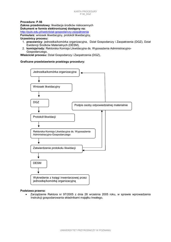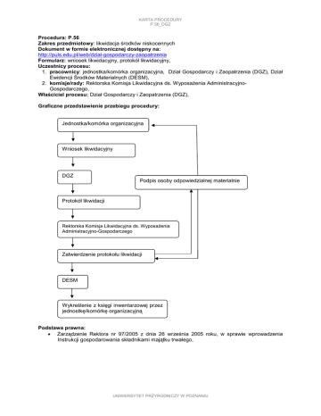 KARTA PROCEDURY P.56_DGZ Procedura: P.56 Zakres przedmiotowy: likwidacja środków niskocennych Dokument w formie elektronicznej dostępny na: http://puls.edu.pl/web/dzial-gospodarczy-zaopatrzenia Formularz: wniosek likwidacyjny, protokół likwidacyjny, Uczestnicy procesu: 1. pracownicy: jednostka/komórka organizacyjna, Dział Gospodarczy i Zaopatrzenia (DGZ), Dział Ewidencji Środków Materialnych (DESM), 2. komisje/rady: Rektorska Komisja Likwidacyjna ds. WyposaŜenia AdministracyjnoGospodarczego, Właściciel procesu: Dział Gospodarczy i Zaopatrzenia (DGZ), Graficzne przedstawienie przebiegu procedury: Jednostka/komórka organizacyjna Wniosek likwidacyjny DGZ Podpis osoby odpowiedzialnej materialnie Protokół likwidacji Rektorska Komisja Likwidacyjna ds. WyposaŜenia Administracyjno-Gospodarczego Zatwierdzenie protokołu likwidacji DESM Wykreślenie z księgi inwentarzowej przez jednostkę/komórkę organizacyjną Podstawa prawna: • Zarządzenie Rektora nr 97/2005 z dnia 26 września 2005 roku, w sprawie wprowadzenia Instrukcji gospodarowania składnikami majątku trwałego, UNIWERSYTET PRZYRODNICZY W POZNANIU