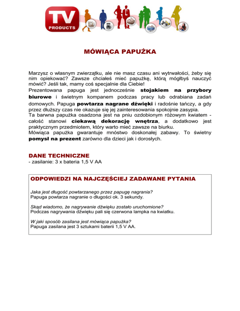MÓWIĄCA PAPUŻKA Marzysz o własnym zwierzątku, ale nie masz czasu ani wytrwałości, żeby się nim opiekować? Zawsze chciałeś mieć papużkę, którą mógłbyś nauczyć mówić? Jeśli tak, mamy coś specjalnie dla Ciebie! Prezentowana papuga jest jednocześnie stojakiem na przybory biurowe i świetnym kompanem podczas pracy lub odrabiana zadań domowych. Papuga powtarza nagrane dźwięki i radośnie tańczy, a gdy przez dłuższy czas nie okazuje się jej zainteresowania spokojnie zasypia. Ta barwna papużka osadzona jest na pniu ozdobionym różowym kwiatem całość stanowi ciekawą dekorację wnętrza, a dodatkowo jest praktycznym przedmiotem, który warto mieć zawsze na biurku. Mówiąca papużka gwarantuje mnóstwo doskonałej zabawy. To świetny pomysł na prezent zarówno dla dzieci jak i dorosłych. DANE TECHNICZNE - zasilanie: 3 x bateria 1,5 V AA ODPOWIEDZI NA NAJCZĘŚCIEJ ZADAWANE PYTANIA Jaka jest długość powtarzanego przez papugę nagrania? Papuga powtarza nagranie o długości ok. 3 sekundy. Skąd wiadomo, że nagrywanie dźwięku zostało uruchomione? Podczas nagrywania dźwięku pali się czerwona lampka na kwiatku. W jaki sposób zasilana jest mówiąca papużka? Papuga zasilana jest 3 sztukami baterii 1,5 V AA.