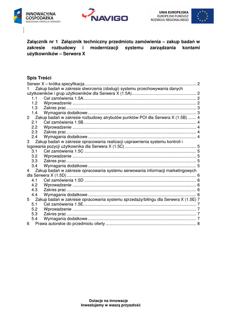 Załącznik nr 1 Załącznik techniczny przedmiotu zamówienia – zakup badań w zakresie rozbudowy i modernizacji systemu zarządzania kontami użytkowników – Serwera X Spis Treści Serwer X – krótka specyfikacja.............................................................................................. 2 1 Zakup badań w zakresie stworzenia (obsługi) systemu przechowywania danych użytkowników i grup użytkowników dla Serwera X (1.5A) ...................................................... 2 1.1 Cel zamówienia 1.5A............................................................................................... 2 1.2 Wprowadzenie ........................................................................................................ 2 1.3 Zakres prac ............................................................................................................. 3 1.4 Wymagania dodatkowe ........................................................................................... 3 2 Zakup badań w zakresie rozbudowy atrybutów punktów POI dla Serwera X (1.5B) ....... 4 2.1 Cel zamówienia 1.5B............................................................................................... 4 2.2 Wprowadzenie ........................................................................................................ 4 2.3 Zakres prac ............................................................................................................. 4 2.4 Wymagania dodatkowe ........................................................................................... 4 3 Zakup badań w zakresie opracowania realizacji usprawnienia systemu kontroli i logowania pozycji użytkownika dla Serwera X (1.5C) ............................................................ 5 3.1 Cel zamówienia 1.5C .............................................................................................. 5 3.2 Wprowadzenie ........................................................................................................ 5 3.3 Zakres prac ............................................................................................................. 5 3.4 Wymagania dodatkowe ........................................................................................... 5 4 Zakup badań w zakresie opracowania systemu serwowania informacji marketingowych dla Serwera X (1.5D) ............................................................................................................. 6 4.1 Cel zamówienia 1.5D .............................................................................................. 6 4.2 Wprowadzenie ........................................................................................................ 6 4.3 Zakres prac ............................................................................................................. 6 4.4 Wymagania dodatkowe ........................................................................................... 6 5 Zakup badań w zakresie opracowania systemu sprzedaży/bilingu dla Serwera X (1.5E) 7 5.1 Cel zamówienia 1.5E............................................................................................... 7 5.2 Wprowadzenie ........................................................................................................ 7 5.3 Zakres prac ............................................................................................................. 7 5.4 Wymagania dodatkowe ........................................................................................... 7 6 Prawa autorskie do przedmiotu oferty ............................................................................ 8 Dotacje na innowacje Inwestujemy w waszą przyszłość Serwer X – krótka specyfikacja Główne zadania: • komunikacja z urządzeniami mobilnymi za pomocą GPRS i SMS • API dla urządzeń mobilnych • obsługa użytkowników zarejestrowanych w Panelu Klienta na http://rejestracja.navigo.pl • udostępnianie dostępnych aktualizacji aplikacji dla użytkowników Architektura: Struktura Serwera X składa się z dwóch głównych części: • API dla urządzeń mobilnych • Panel Klienta Technologia: 1 1.1 • Część logiczna: PHP 5 • Bazy danych: PostgreSQL (obsługa urządzeń mobilnych) + MySQL (Panel Klienta) Zakup badań w zakresie stworzenia (obsługi) systemu przechowywania danych użytkowników i grup użytkowników dla Serwera X (1.5A) Cel zamówienia 1.5A Usługa ta jest niezbędne dla zapewnienia możliwości rejestracji i zarządzania nowymi zdarzeniami użytkowników (śledzenie) po wprowadzeniu do oferty nowego produktu Navigo Sp. z o.o. 1.2 Wprowadzenie Jednym z kluczowych zadań serwera X jest zarządzanie kontami użytkowników powiązanych z firmą Navigo Sp. z o.o. (jako klienci lub potencjalni klienci). W chwili obecnej serwer ten przechowuje podstawowe dane teleadresowe użytkowników, ewentualnie ich preferencje i aktywność w zakresie zakupów produktów Navigo. W miarę poszerzania zakresu usług dostarczanych przez Navigo, pojawiła się potrzeba stworzenia bardziej zaawansowanego systemu zarządzania kontami użytkowników. Dotacje na innowacje Inwestujemy w waszą przyszłość 1.3 Zakres prac Zakup badania, o którym mowa w punkcie 1 obejmuje: przeprowadzenie stosownych analiz oraz zaprojektowanie i realizację systemu przechowywania danych użytkowników i grup użytkowników dla Serwera X w formie zewnętrznego API. W ramach badania stworzone zostaną nowe funkcjonalności: • Przechowywanie danych użytkowników Konta użytkowników powinny pozwalać na przechowywanie podstawowych danych teleadresowych oraz preferencji w ramach zdefiniowanych kategorii. • Kontrola grup użytkowników Powinna zostać stworzona możliwość łączenia użytkowników w grupy, przy czym każdy użytkownik powinien mieć możliwość przynależności do dowolnej ilości grup. • Rejestracja aktywności użytkowników System musi umożliwiać rejestrację a