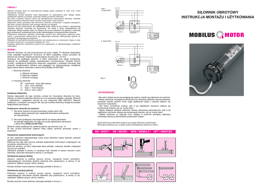 Si³ownik obrotowy s³u¿y do automatycznej obs³ugi zas³on zwijanych tj. rolet, krat i bram rolowanych, markiz itp. Niew³aœciwy monta¿ si³ownika mo¿e doprowadziæ do uszkodzenia cia³a, dlatego nale¿y postêpowaæ zgodnie z poni¿sz¹ instrukcj¹. Nale¿y j¹ równie¿ zachowaæ. Nie wolno pozwalaæ dzieciom bawiæ siê zainstalowanym sterowaniem si³ownika. Wszelkie zdalne sterowania si³ownika nale¿y równie¿ utrzymywaæ z dala od dzieci. Regularnie nale¿y sprawdzaæ stan techniczny si³ownika, przewodów i urz¹dzeñ steruj¹cych. Nie wolno u¿ywaæ si³ownika, jeœli wymaga naprawy lub regulacji. Si³ownik nie jest przeznaczony do u¿ytkowania przez osoby (w tym dzieci) o ograniczonej zdolnoœci fizycznej, czuciowej lub psychicznej, lub osoby o braku doœwiadczenia lub znajomoœci takiego sprzêtu chyba, ¿e odbywa siê to pod nadzorem lub zgodnie z instrukcj¹ jego u¿ytkowania, przekazanej przez osoby odpowiadaj¹ce za bezpieczeñstwo si³ownika. Pod³¹czenia elektryczne si³ownika obrotowego powinny byæ dokonywane wy³¹cznie przez osoby z uprawnieniami elektrycznymi wg za³¹czonego schematu elektrycznego zgodnie ze wszystkimi obowi¹zuj¹cymi przepisami. Wy³¹cznik do sterowania si³ownika powinien byæ umiejscowiony w widocznym miejscu z dala od czêœci ruchomych, na wysokoœci wiêkszej ni¿ 1,5m. Instalacja elektryczna si³owników powinna byæ wyposa¿ona w zabezpieczaj¹ce urz¹dzenia od³¹czaj¹ce. SI£OWNIK OBROTOWY INSTRUKCJA MONTA¯U I U¯YTKOWANIA - Nie wolno zbli¿aæ siê do poruszaj¹cej siê zas³ony, dopóki siê ca³kowicie nie zamknie; - Nale¿y zachowaæ szczególn¹ ostro¿noœæ przy awaryjnej obs³udze rêcznej si³ownika, poniewa¿ otwarta zas³ona mo¿e nagle gwa³townie opaœæ z powodu s³abych lub zerwanych wieszaków; - Nie wolno uruchamiaæ markizy, jeœli w jej najbli¿szym otoczeniu odbywa siê konserwacja budynku, jak np. mycie okien; - Nale¿y od³¹czyæ zasilanie si³ownika markizy sterowanej automatycznie, jeœli w jej najbli¿szym otoczeniu odbywa siê konserwacja budynku, jak np. mycie okien; - Nale¿y zachowaæ co najmniej 0,4m odstêpu w poziomie pomiêdzy ca³kowice rozwiniêt¹ markiz¹ a jakimkolwiek przedmiotem sta³ym; Dane techniczne si³ownika podane s¹ na jego tabliczce znamionowej. Minimalna œrednica rury, w jakiej mo¿na zainstalowaæ si³ownik to 40mm.