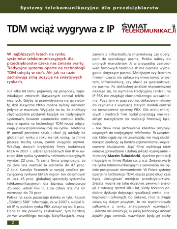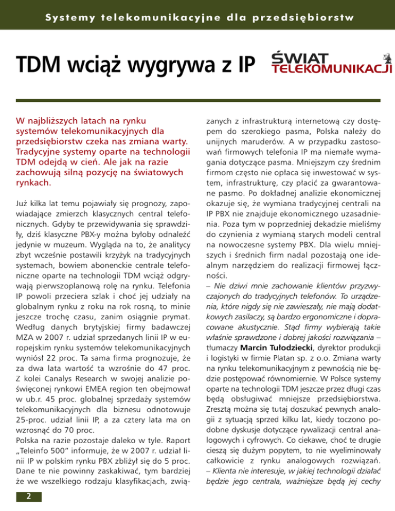 S y s t e m y t e l e ko m u n i k a c y j n e d l a p r z e d s i ´ b i o r s t w TDM wcià˝ wygrywa z IP W najbli˝szych latach na rynku systemów telekomunikacyjnych dla przedsi´biorstw czeka nas zmiana warty. Tradycyjne systemy oparte na technologii TDM odejdà w cieƒ. Ale jak na razie zachowujà silnà pozycj´ na Êwiatowych rynkach. Ju˝ kilka lat temu pojawia∏y si´ prognozy, zapowiadajàce zmierzch klasycznych central telefonicznych. Gdyby te przewidywania si´ sprawdzi∏y, dziÊ klasyczne PBX-y mo˝na by∏oby odnaleêç jedynie w muzeum. Wyglàda na to, ˝e analitycy zbyt wczeÊnie postawili krzy˝yk na tradycyjnych systemach, bowiem abonenckie centrale telefoniczne oparte na technologii TDM wcià˝ odgrywajà pierwszoplanowà rol´ na rynku. Telefonia IP powoli przeciera szlak i choç jej udzia∏y na globalnym rynku z roku na rok rosnà, to minie jeszcze troch´ czasu, zanim osiàgnie prymat. Wed∏ug danych brytyjskiej firmy badawczej MZA w 2007 r. udzia∏ sprzedanych linii IP w europejskim rynku systemów telekomunikacyjnych wyniós∏ 22 proc. Ta sama firma prognozuje, ˝e za dwa lata wartoÊç ta wzroÊnie do 47 proc. Z kolei Canalys Research w swojej analizie poÊwi´conej rynkowi EMEA region ten obejmowa∏ w ub.r. 45 proc. globalnej sprzeda˝y systemów telekomunikacyjnych dla biznesu odnotowuje 25-proc. udzia∏ linii IP, a za cztery lata ma on wzrosnàç do 70 proc. Polska na razie pozostaje daleko w tyle. Raport „Teleinfo 500” informuje, ˝e w 2007 r. udzia∏ linii IP w polskim rynku PBX zbli˝y∏ si´ do 5 proc. Dane te nie powinny zaskakiwaç, tym bardziej ˝e we wszelkiego rodzaju klasyfikacjach, zwià- 2 zanych z infrastrukturà internetowà czy dost´pem do szerokiego pasma, Polska nale˝y do unijnych maruderów. A w przypadku zastosowaƒ firmowych telefonia IP ma niema∏e wymagania dotyczàce pasma. Mniejszym czy Êrednim firmom cz´sto nie op∏aca si´ inwestowaç w system, infrastruktur´, czy p∏aciç za gwarantowane pasmo. Po dok∏adnej analizie ekonomicznej okazuje si´, ˝e wymiana tradycyjnej centrali na IP PBX nie znajduje ekonomicznego uzasadnienia. Poza tym w poprzedniej dekadzie mieliÊmy do czynienia z wymianà starych modeli central na nowoczesne systemy PBX. Dla wielu mniejszych i Êrednich firm nadal pozostajà one idealnym narz´dziem do realizacji firmowej ∏àcznoÊci. – Nie dziwi mnie zachowanie klientów przyzwyczajonych do tradycyjnych telefonów. To urzàdzenia, które nigdy si´ nie zawiesza∏y, nie majà dodatkowych zasilaczy, sà bardzo ergonomiczne i dopracowane akustycznie. Stàd firmy wybierajà takie w∏aÊnie sprawdzone i dobrej jakoÊci rozwiàzania – t∏umaczy Marcin Tu∏odziecki, dyrektor produkcji i logistyki w firmie Platan sp. z o.o. Zmiana warty na rynku telekomunikacyjnym z pewnoÊcià nie b´dzie post´powaç równomiernie. W Polsce systemy oparte na technologii TDM jeszcze przez d∏ugi czas b´dà obs∏ugiwaç mniejsze przedsi´biorstwa. Zresztà mo˝na si´ tutaj doszukaç pewnych analogii z sytuacjà sprzed kilku lat, kiedy toczono podobne dyskusje dotyczàce rywalizacji central analogowych i cyfrowych. Co ciekawe, choç te drugie cieszà si´ du˝ym popytem, to nie wyeliminowa∏y ca∏kowicie z rynku analogowych rozwiàzaƒ. – Klienta nie interesuje, w jakiej technologii dzia∏aç b´dzie jego centrala, wa˝niejsze b´dà jej cechy S y s t e m y t e l e ko m u n i k a c y j n e d l a p r z e d s i ´ b i o r s t w u˝ytkowe, niezawodnoÊç i koszt inwestycji – dodaje Marcin Tu∏odziecki. Walka o prymat Rywalizacja na rynku systemów telekomunikacyjnych staje si´ coraz ciekawsza. Ju˝ od pewnego czasu jesteÊmy Êwiadkami dynamicznych zmian, konsolidacji. W ub.r. Avaya zosta∏a przej´ta za 8,2 mld dolarów przez fundusze Silver Lake Partners oraz Texas Pacific Group. Inny powa˝ny gracz na Êwiatowym rynku, NEC, kupi∏ w sierpniu 2007 r. amerykaƒskà firm´ Sphere Communications, opracowujàcà aplikacje Unified Communications. Z kolei jednym z najciekawszych wydarzeƒ ostatnich miesi´cy by∏a decyzja Ericssona o sprzeda˝y portfolio rozwiàzaƒ PBX firmie Aastra Technologies. W ciàgu ostatnich lat wraz ze wzrostem popularnoÊci telefonii IP renomowani producenci zwiàza- ni z bran˝à telekomunikacyjnà – Alcatel-Lucent, Nortel, Siemens – musieli pogodziç si´ z pojawieniem si´ zupe∏nie nowych konkurentów, takich jak np. Cisco. Swoje aspiracje w tym segmencie rynku zg∏asza tak˝e Microsoft, który w magicznym kwadrancie Gartnera dla telefonii korporacyjnej znalaz∏ si´ w gronie wizjonerów. JeÊli dodaç do tego towarzystwa operatorów, szukajàcych swojej szansy w zarzàdzanych us∏ugach telefonii IP, a tak˝e coraz popularniejsze rozwiàzania open source, to mamy pe∏ny obraz rynku. Wed∏ug danych MZA prymat na Êwiecie, przyjmujàc za kryterium iloÊç sprzedanych linii, nale˝y do Panasonica, firmy, która mia∏a w 2007 r. 11-proc. udzia∏ w Êwiatowym rynku systemów PBX i IP PBX. Tu˝ za plecami lidera znalaz∏y si´ Avaya, NEC, Siemens, ca∏a trójka mia∏a 8-proc. udzia∏ w globalnym rynku. Panasonic ma jednak s∏abszà pozycj´ w Europie Za- Trendy na europejskim rynku PBX 17 22 30 38 47 èród∏o: MZA TDM IP 4 83 78 70 62 53 2006 2007 2008 2009 2010 S y s t e m y t e l e ko m u n i k a c y j n e d l a p r z e d s i ´ b i o r s t w Udzia∏ producentów w Êwiatowym rynku PBX, IP PBX pod wzgl´dem iloÊci sprzedanych linii w 2007 roku. 28 11 chodniej. W tej cz´Êci Starego Kontynentu, wed∏ug danych Gartnera, palma pierwszeƒstwa przypad∏a firmie Alcatel-Lucent (17 proc.), kolejni dostawcy to Siemens (16 proc.), Aastra (11 proc.), Avaya (10 proc.), Cisco (10 proc.) i Ericsson (6 proc.). Wprowadzone we wrzeÊniu do sprzeda˝y systemy KX – NCP 500 oraz KX – NCP 1000 majà poprawiç pozycj´ producenta z Japonii. – ˚eby skutecznie konkurowaç na europejskim rynku, Panasonic musi si´ skupiç na sprzeda˝y nowych konwergentnych rozwi