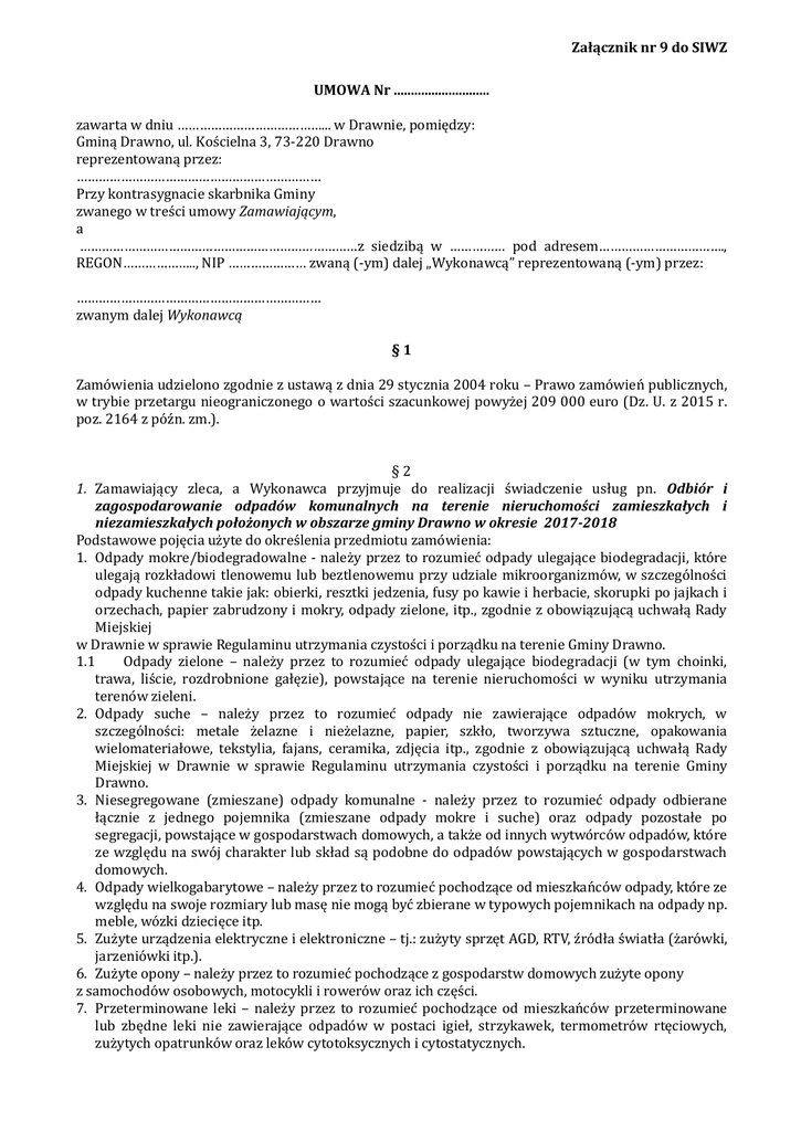 Załącznik nr 9 do SIWZ UMOWA Nr ............................ zawarta w dniu …………………………………... w Drawnie, pomiędzy: Gminą Drawno, ul. Kościelna 3, 73-220 Drawno reprezentowaną przez: ………………………………………………………… Przy kontrasygnacie skarbnika Gminy zwanego w treści umowy Zamawiającym, a …………………………………………………………………z siedzibą w …………… pod adresem……………………………., REGON……………….., NIP ………………… zwaną (-ym) dalej „Wykonawcą” reprezentowaną (-ym) przez: ………………………………………………………… zwanym dalej Wykonawcą §1 Zamówienia udzielono zgodnie z ustawą z dnia 29 stycznia 2004 roku – Prawo zamówień publicznych, w trybie przetargu nieograniczonego o wartości szacunkowej powyżej 209 000 euro (Dz. U. z 2015 r. poz. 2164 z późn. zm.). §2 1. Zamawiający zleca, a Wykonawca przyjmuje do realizacji świadczenie usług pn. Odbiór i zagospodarowanie odpadów komunalnych na terenie nieruchomości zamieszkałych i niezamieszkałych położonych w obszarze gminy Drawno w okresie 2017-2018 Podstawowe pojęcia uzyte do okreslenia przedmiotu zamowienia: 1. Odpady mokre/biodegradowalne - nalezy przez to rozumiec odpady ulegające biodegradacji, ktore ulegają rozkładowi tlenowemu lub beztlenowemu przy udziale mikroorganizmow, w szczegolnosci odpady kuchenne takie jak: obierki, resztki jedzenia, fusy po kawie i herbacie, skorupki po jajkach i orzechach, papier zabrudzony i mokry, odpady zielone, itp., zgodnie z obowiązującą uchwałą Rady Miejskiej w Drawnie w sprawie Regulaminu utrzymania czystosci i porządku na terenie Gminy Drawno. 1.1 Odpady zielone – nalezy przez to rozumiec odpady ulegające biodegradacji (w tym choinki, trawa, liscie, rozdrobnione gałęzie), powstające na terenie nieruchomosci w wyniku utrzymania terenow zieleni. 2. Odpady suche – nalezy przez to rozumiec odpady nie zawierające odpadow mokrych, w szczegolnosci: metale zelazne i niezelazne, papier, szkło, tworzywa sztuczne, opakowania wielomateriałowe, tekstylia, fajans, ceramika, zdjęcia itp., zgodnie z obowiązującą uchwałą Rady Miejskiej w Drawnie w sprawie Regulaminu utrzymania czystosci i porządku na terenie Gminy Drawno. 3. Niesegregowane (zmieszane) odpady komunalne - nalezy przez to rozumiec odpady odbierane łącznie z jednego pojemnika (zmieszane odpady mokre i suche) oraz odpady pozostałe po segregacji, powstające w gospodarstwach domowych, a takze od innych wytworcow odpadow, ktore ze względu na swoj charakter lub skład są podobne do odpadow powstających w gospodarstwach domowych. 4. Odpady wielkogabarytowe – nalezy przez to rozumiec pochodzące od mieszkancow odpady, ktore ze względu na swoje rozmiary lub masę nie mogą byc zbierane w typowych pojemnikach na odpady np. meble, wozki dziecięce itp. 5. Zuzyte urządzenia elektryczne i elektroniczne – tj.: zuzyty sprzęt AGD, RTV, zrodła swiatła (zarowki, jarzeniowki itp.). 6. Zuzyte opony – nalezy przez to rozumiec pochodzące z gospodarstw domowych zuzyte opony z samochodow osobowych, motocykli i rowerow oraz ich częsci. 7. Przeterminowane leki – nalezy przez to rozumiec pochodzące od mieszkancow przeterminowane lub zbędne leki nie zawierające odpadow w postaci igieł, strzykawek, termometrow rtęciowych, zuzytych opatrunkow oraz lekow cytotoksycznych i cytostatycznych. 8. Odpady budowlano – remontowe – tj.: pochodzące z remontow i robot budowlanych, na wykonanie ktorych nie jest wymagane uzyskanie pozwolenia na budowę, lub nie jest wymagane zgłoszenie do administracji budowlano-architektonicznej. 9. RIPOK – nalezy przez to rozumiec Regionalną Instalację do Przetwarzania Odpadow Komunalnych, wskazanej w Załączniku do Uchwały Nr XVI/218/12 Sejmiku Wojewodztwa Zachodniopomorskiego z dnia 29 czerwca 2012 r. w sprawie przyjęcia „Planu Gospodarki Odpadami dla Wojewodztwa Zachodniopomorskiego na lata 2012-2017 z uwzględnieniem perspektywy na lata 2018-2023”z poz.zm., jako instalacji w ktorej odbywac się będzie zagospodarowanie powstających w regionie odpadow komunalnych. 10. PSZOK – nalezy przez to rozumiec punkt selektywnego zbierania odpadow komunalnych zlokalizowanego przy ul. Kolejowej 7 73-220 Drawno. Jest to miejsce gromadzenia odpadow stałych z uwzględnieniem ich segregacji, w ktorych umieszczone zostały pojemniki na odpady w ktorym pozostawiane będą: - papier, tworzywa sztuczne, opakowania wielomateriałowe, metale, szkło, meble i inne odpady wielkogabarytowe, chemikalia pochodzące z gospodarstw domowych, sprzęt elektryczny i elektroniczny, zrodła swiatła (zarowki, jarzeniowki itp.), zuzyte opony. 11. PGO – nalezy przez to rozumiec zorganizowane punkty gromadzenia odpadow tj. wskazane przez włascicieli nieruchomosci miejsca gromadzenia odpadow stałych z uwzględnieniem ich segregacji, w ktorych umieszczone zostały pojemniki, worki do zbiorki selektywnej na odpady oraz przy ktorych pozostawiane będą odpady wielkogabarytowe, zuzyte opony, zielone (w tym choinki). 12. Dane o PGO - nalezy przez to rozumiec takie informacje: - adresy poszczegolnych PGO (posesji), - dane osobowe: imię i nazwisko składającego deklarację, - częstotliwosci odbioru odpadow, - ilosci, pojemnosci i przeznaczenie pojemnikow znajdujących się w PGO. 13. System Wykonawcy – nalezy przez to rozumiec system: - GPS, - wideo rejestrator pracy obsługi pojazdu obejmujący kątem widzenia miejsce odbierania pojemnika/worka z odpadami(w przypadku mozliwosci dojazdu pojazdu obsługi), oraz zasypu. 14. Moduł Kontroli – nalezy przez to rozumiec oprogramowanie Zamawiającego słuzące do zarządzania danymi z pokładowych systemow monitoringu w pojazdach Wykonawcow (rejestratory GPS, video-rejestrator). 15. Raport miesięczny - nalezy przez to rozumiec wszystkie informacje przekazane przez Wykonawcę o stwierd