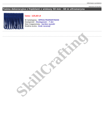 Informacje o produkcie Utworzono 07-03-2017 Taśma dekoracyjna z frędzlami z wiskozy 50 mm - 60 m ultramaryna Cena : 125,83 zł Sk ill C ra ft in g Nr katalogowy : WPKULTRAMARYNA50 Dostępność : Dostępność - 7 dni Stan magazynowy : bardzo wysoki Średnia ocena : brak recenzji