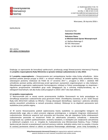ul. Siedmiogrodzka 5 lok. 51 01-204 Warszawa tel./fax. (+ 48) 22 621 51 65 e-mail: [email protected] www.interwencjaprawna.pl Warszawa, 18 stycznia 2016 r. 03/01/KS/16 Szanowny Pan Sebastian Chwałek Sekretarz Stanu w Ministerstwie Spraw Wewnętrznych ul. Stefana Batorego 5 02-591 Warszawa Nr fax.: 22 60 142 82 dot. pisma: DP-I-0231-57/2015/ECH Dziękując za zaproszenie do konsultacji społecznych, przekazuję uwagi Stowarzyszenia Interwencji Prawnej do projektu rozporządzenia Rady Ministrów w sprawie relokacji cudzoziemców w roku 2016: § 2 projektu rozporządzenia – Stowarzyszenie jest zaniepokojone bardzo niską liczbą uchodźców , które państwo polskie planuje przyjąć w 2016 r. w ramach relokacji. W świetle ogólnej liczby uchodźców, którą zobowiązani jesteśmy relokować do Polski do 17 września 2017 r., przyjęcie w 2016 r. zaledwie 400 uchodźców postawi polską administrację przed ogromnym wyzwaniem organizacyjnym w roku kolejnym. Zdecydowanie sugerujemy zaplanowanie harmonogramu relokacji w Polsce pozwalającego na stopniowe i regularne przyjmowanie niewielkich grup osób ubiegających się o ochronę międzynarodową, np. w odstępach kwartalnych, tak aby liczba osób przyjętych w 2016 i 2017 roku była zbliżona. § 3 projektu rozporządzenia 1/ Niezrozumiałe jest w naszej ocenie przeznaczenie środków finansowych na testy pozwalające na weryfikację tożsamości cudzoziemców poza granicami Polski. Chcielibyśmy zauważyć, że art. 5(10) Decyzji Rady (UE) 2015/1523 nakłada na Włochy i Grecję obowiązek identyfikacji, rejestracji i pobrania odcisków palców wszystkich uchodźców w ramach procedury relokacji. Wskazuje to na zbędność ponoszenia tych wydatków przez polskie organy. 2/ W ocenie Stowarzyszenia podział zaplanowanej kwoty wydatków na poszczególne kategorie nie odzwierciedla wagi, jaką w całym procesie odgrywa preintegracja, a następnie integracja relokowanych cudzoziemców. Skuteczne wsparcie tych procesów jest kluczowe, aby jak największa liczba relokowanych cudzoziemców pozostała na terytorium Polski po zakończeniu procedury uchodźczej i skutecznie zintegrowała się z polskim społeczeństwem. Jesteśmy świadomi, iż niezbędne jest zwiększenie zatrudnienia w niektórych urzędach, m.in. w Urzędzie ds. Cudzoziemców oraz Ministerstwie Rodziny, Pracy i Polityki Społecznej jak również w powiatowych centrach pomocy rodzinie. Jednakże należy mieć na uwadze, iż koszty te zostaną poniesione niemal w całości ze wsparcia finansowego udzielanego przez Unię Europejską w Misją Stowarzyszenia Interwencji Prawnej jest zapewnienie spójności społecznej poprzez działanie na rzecz równości wszystkich ludzi wobec prawa ul. Siedmiogrodzka 5 lok. 51 01-204 Warszawa tel./fax. (+ 48) 22 621 51 65 e-mail: [email protected] www.interwencjaprawna.pl oparciu o art. 10 Decyzji Rady (UE) 2015/1601, które przyznawane jest – jakkolwiek ryczałtem – jednak „na każdą relokowaną osobę”, co winno sugerować, iż ostatecznymi beneficjentami owych środków powinni być uchodźcy. Tymczasem zaledwie 18% tej kwoty zostanie w 2016 roku przekazanych bezpośrednio na integrację cudzoziemców. Dysproporcja taka byłaby do pewnego stopnia usprawiedliwiona, jeśli zamysłem projektodawcy było „zainwestowanie” niejako w kadrę urzędniczą w pierwszym okresie, gdy liczba osób relokowanych będzie jeszcze niewielka i można się spodziewać, że nie będzie dużej potrzeby sięgania po środki przeznaczone na integrację albowiem do końca roku toczyć się będą jeszcze procedury o nadanie ochrony międzynarodowej. Jednakże jeśli miałby być to w ocenie projektodawcy słuszny algorytm, który zostanie zastosowany również w 2017 roku w ten sposób, iż z każdych 6000 EUR przeznaczonych na jedną osobę relokowaną, przeważająca część środków będzie finansować funkcjonowanie organów administracji publicznej, w ocenie Stowarzyszenia takiego podziału nie da się usprawiedliwić. 3/ Uzasadnienie projektu rozporządzenia nie udziela odpowiedzi na pytanie, jakiego rodzaju stanowiska zostaną utworzone w ramach zwiększania zatrudnienia w organach administracji publicznej. Z ostrożności wskazujemy na konieczność zapewnienia fachowej (i pozbawionej barier językowych) pomocy psychologicznej zarówno osobom ubiegającym się o ochronę międzynarodową, jak i po jej otrzymaniu, oraz potrzebę zapewnienia osobom relokowanym wsparcia tłumaczy nie tylko w toku prowadzonych postępowań administracyjnych, ale i w codziennej komunikacji z administracją (np. w powiatowych centrach pomocy rodzinie, ośrodkach pomocy społecznej), służbą zdrowia i w innych sytuacjach życia codziennego. Przypominamy jednocześnie o roli, jaką w skutecznej integracji mogą odegrać finansowani ze środków państwowych mentorzy, jak i odpowiednio przeszkoleni doradcy zawodowi. 4/Nie znajdujemy w planowanym budżecie propozycji rozwiązania najpoważniejszego z punktu widzenia integracji problemu, z jakim borykają się przebywający w Polsce uchodźcy, czyli niemal całkowitego braku dostępu do mieszkalnictwa. Uchodźcy bardzo często są bezdomni, zagrożeni bezdomnością lub żyją w warunkach substandardowych, wynajmując najtańsze mieszkania/pokoje – przeludnione, niedoposażone, zimne, zagrzybione – które nie zaspokajają ich potrzeb mieszkaniowych, co bardzo negatywnie odbija się na ich codziennym funkcjonowaniu, w tym na możliwości zapewnienia właściwych warunków rozwoju dla dzieci1.. Takie warunki zdecydowanie zmniejszają szansę na integrację tych osób z polskim społeczeństwem. Zagwarantowanie w planie wydatków niewielkiej pozycji na pokrycie dodatków mieszkaniowych niestety nawet w najmniejszym stopniu nie rozwiązuje powyższego problemu. Prawo do dodatku mieszkaniowego przysługuje uchodźcom, o ile spełniają kryteria wynikające z ustawy o dodatkach mieszkaniowych i dotychczasowe doświadczeni