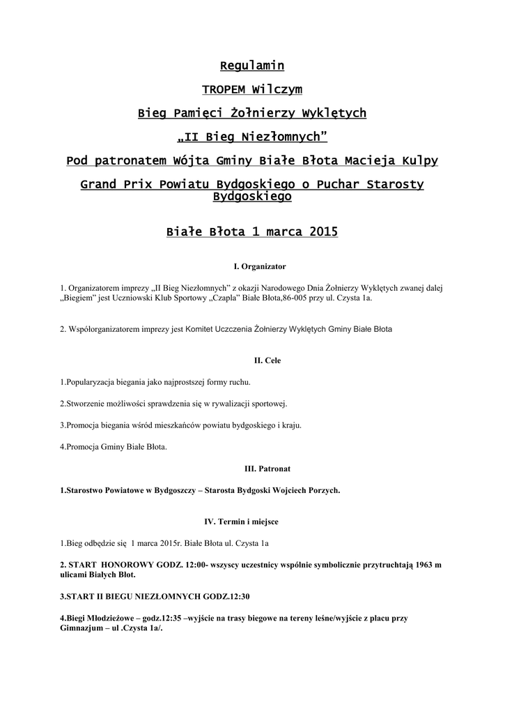 Regulamin TROPEM Wilczym Bieg Pamięci Żołnierzy Wyklętych „II Bieg Niezłomnych” Pod patronatem Wójta Gminy Białe Błota Macieja Kulpy Grand Prix Powiatu Bydgoskiego o Puchar Starosty Bydgoskiego Białe Błota 1 marca 2015 I. Organizator 1. Organizatorem imprezy „II Bieg Niezłomnych” z okazji Narodowego Dnia Żołnierzy Wyklętych zwanej dalej „Biegiem” jest Uczniowski Klub Sportowy „Czapla” Białe Błota,86-005 przy ul. Czysta 1a. 2. Współorganizatorem imprezy jest Komitet Uczczenia Żołnierzy Wyklętych Gminy Białe Błota II. Cele 1.Popularyzacja biegania jako najprostszej formy ruchu. 2.Stworzenie możliwości sprawdzenia się w rywalizacji sportowej. 3.Promocja biegania wśród mieszkańców powiatu bydgoskiego i kraju. 4.Promocja Gminy Białe Błota. III. Patronat 1.Starostwo Powiatowe w Bydgoszczy – Starosta Bydgoski Wojciech Porzych. IV. Termin i miejsce 1.Bieg odbędzie się 1 marca 2015r. Białe Błota ul. Czysta 1a 2. START HONOROWY GODZ. 12:00- wszyscy uczestnicy wspólnie symbolicznie przytruchtają 1963 m ulicami Białych Błot. 3.START II BIEGU NIEZŁOMNYCH GODZ.12:30 4.Biegi Młodzieżowe – godz.12:35 –wyjście na trasy biegowe na tereny leśne/wyjście z placu przy Gimnazjum – ul .Czysta 1a/. 5.Biuro zawodów czynne od godziny 9:00-11:00- Gimnazjum Publiczne w Białych Błotach ul. Czysta 1a/szatnie, natryski/ 6.Bieg Główny 10km – start i meta Gimnazjum Publiczne – trasa dukty leśne, asfalt. 7.Parkingi dla uczestników Biegu zgodnie z zamieszczoną na stronie www.pobiegnuj.pl mapką V. Warunki Zgłoszenia i Uczestnictwa („Warunki”) 1.Warunkiem uczestnictwa w Biegu Głównym jest prawidłowa rejestracja na stronie www.pobiegnij.pl oraz podpisanie oświadczenia przy odbiorze pakietu. Przekazanie Formularza Rejestracyjnego odbywa się w formie elektronicznej na stronie www.pobiegnij.pl i dokonanie Opłaty Rejestracyjnej, jest jednoznaczne z akceptacją niniejszego Regulaminu. Organizator zastrzega sobie prawo do odrzucenia każdego Formularza Rejestracyjnego, co do którego istnieje podejrzenie, że został wypełniony niezgodnie z prawdą, oraz do zdyskwalifikowania każdego Uczestnika, wobec którego istnieje uzasadnione przekonanie, że naruszył warunki niniejszego Regulaminu. W biegu głównym mogą wziąć udział osoby od 16 roku życia. (biegi młodzieżowe-osobne biegi)Rodzic lub Opiekun osoby niepełnoletniej wypełnia oświadczenie wraz z podpisem, wyrażające zgodę na udział w biegu osoby niepełnoletniej. Wzór oświadczenie do pobrania na stronie www.pobiegnij.pl 2.Warunkiem uczestnictwa w Biegach Młodzieżowych jest rejestracja na stronie www.pobiegnij.pl oraz podpisanie oświadczenia. 3. Zawodnicy będą mieli możliwość zapisania się także w dniu zawodów w godzinach od 09:00 do 11:00. 4. Uczestnik musi wyrazić zgodę na poddanie się wymaganiom zawartym w niniejszym Regulaminie, w tym wyrazić zgodę na przetwarzanie danych osobowych zgodnie z ustawą z dnia 29 sierpnia 1997r. o ochronie danych osobowych (tekst jednolity: Dz. U. 2002 r. Nr 101 poz. 926, ze zm.). 5. Opłata Rejestracyjna za udział w Biegu Głównym wynosi 30 PLN (słownie: trzydzieści złotych) za jednego uczestnika} od ukazania się regulaminu na stronie www.pobiegnij.pl do 31 stycznia 2015 roku. Od 1 lutego do 28lutego opłata rejestracyjna wynosić będzie 40 PLN (słownie: czterdzieści złotych) za jednego Uczestnika. W dniu startu opłata wynosi 50PLN (słownie: pięćdziesiąt złotych ) za jednego Uczestnika. Opłatę rejestracyjną należy dokonać na konto : 81 81421020 0006 1027 2000 0001 - UCZNIOWSKI KLUB SPORTOWY "CZAPLA",ul.Czysta 1a 86-005 BIAŁE BŁOTA. Opłata raz wniesiona nie podlega zwrotowi oraz nie ma możliwości przeniesienia wniesionej opłaty na rzecz innego Uczestnika. Uczestnik może dokonać wpłaty w imieniu innych Uczestników Biegu. Wszelkie reklamacje i skargi dotyczące płatności będą rozpatrywane w sposób indywidualny. W tym celu należy skontaktować się z Organizatorem. Odpowiednie dane kontaktowe udostępnione są w dziale kontakt na stronie internetowej www.pobiegnij.pl Organizator ma prawo do wprowadzenia limitu startujących. 6.UDZIAŁ W BIEGACH MŁODZIEŻOWYCH BEZPŁATNY . 7. Osoby, które dokonały wpłaty zostaną dopuszczone do biegu oraz umieszczone na stronie internetowej www.pobiegnij.pl . Osoby niepełnoletnie muszą dodatkowo posiadać wypełnione i podpisane przez rodzica lub prawnego opiekuna „Oświadczenie Rodzica o udziału w zajęciach rekreacyjno sportowych”. Jego treść znajduje się na stronie internetowej Biegu. 8.Ubezpieczenie. Bieg ubezpiecza Organizator. Organizator nie zapewnia jednak jakiegokolwiek ubezpieczenia na życie, zdrowotnego lub od odpowiedzialności cywilnej z tytułu choroby, wypadku, odniesienia obrażeń, poniesienia śmierci lub poniesienia jakichkolwiek strat bądź szkód, jakie mogą wystąpić w związku z obecnością i/lub uczestnictwem w Biegu. Uczestnikom doradza się, jeżeli uznają to za konieczne ,by zakupili stosowne ubezpieczenie. 9.Inne ograniczenia dotyczące udziału w Biegu. Ze względów bezpieczeństwa w Biegu zabroniony jest udział osób poruszających się na rowerach, wrotkach, rolkach, deskorolkach oraz biegnących ze zwierzętami. Zabrania się wnoszenia na trasę biegu przedmiotów, które mogą być niebezpieczne dla innych Uczestników. Ze względu na charakter Biegu zabrania się startu z kijami (trekingowymi i Nordic Walking). Na miejsce Biegu zabrania się wnoszenia środków odurzających, nielegalnych substancji raz napojów alkoholowych jakiegokolwiek rodzaju. Uczestnikom zabrania się zażywania i posiadania wspomnianych wyżej środków i substancji zarówno przed , jak i w trakcie Biegu. Organizator zastrzega sobie prawo do odmowy dopuszczenia do udziału w Biegu osób, u których zostanie stwierdzone spożycie lub posiadanie jakichkolwiek środków odurzających, nielegalnych substancji oraz napojów alkoholo