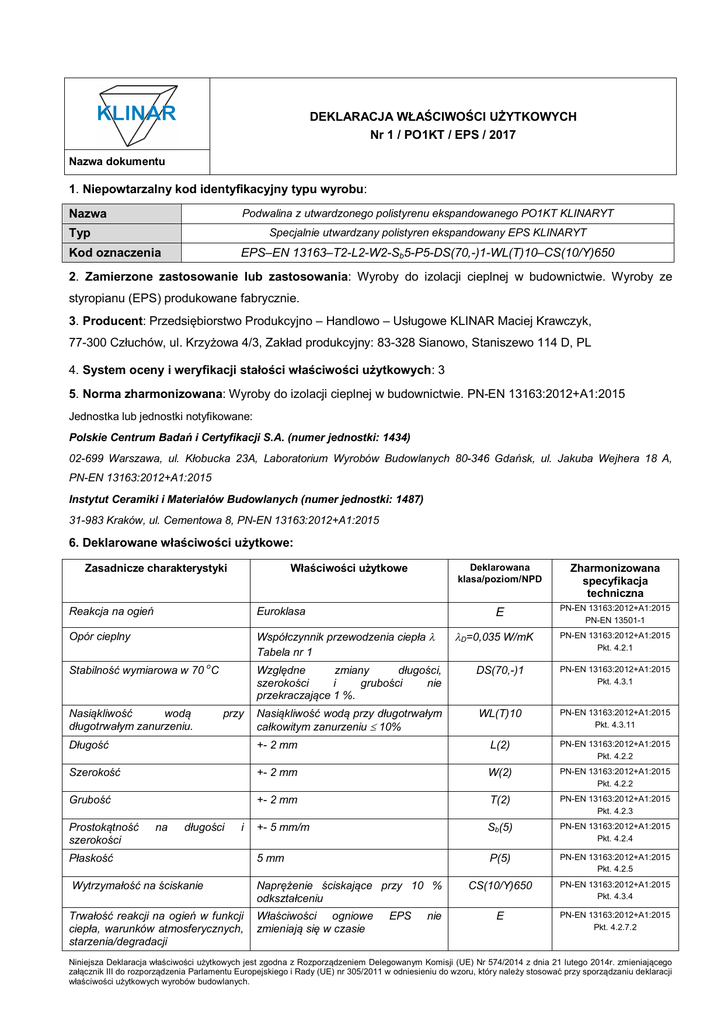 DEKLARACJA WŁAŚCIWOŚCI UŻYTKOWYCH Nr 1 / PO1KT / EPS / 2017 Nazwa dokumentu 1. Niepowtarzalny kod identyfikacyjny typu wyrobu: Nazwa Podwalina z utwardzonego polistyrenu ekspandowanego PO1KT KLINARYT Typ Specjalnie utwardzany polistyren ekspandowany EPS KLINARYT Kod oznaczenia EPS–EN 13163–T2-L2-W2-Sb5-P5-DS(70,-)1-WL(T)10–CS(10/Y)650 2. Zamierzone zastosowanie lub zastosowania: Wyroby do izolacji cieplnej w budownictwie. Wyroby ze styropianu (EPS) produkowane fabrycznie. 3. Producent: Przedsiębiorstwo Produkcyjno – Handlowo – Usługowe KLINAR Maciej Krawczyk, 77-300 Człuchów, ul. Krzyżowa 4/3, Zakład produkcyjny: 83-328 Sianowo, Staniszewo 114 D, PL 4. System oceny i weryfikacji stałości właściwości użytkowych: 3 5. Norma zharmonizowana: Wyroby do izolacji cieplnej w budownictwie. PN-EN 13163:2012+A1:2015 Jednostka lub jednostki notyfikowane: Polskie Centrum Badań i Certyfikacji S.A. (numer jednostki: 1434) 02-699 Warszawa, ul. Kłobucka 23A, Laboratorium Wyrobów Budowlanych 80-346 Gdańsk, ul. Jakuba Wejhera 18 A, PN-EN 13163:2012+A1:2015 Instytut Ceramiki i Materiałów Budowlanych (numer jednostki: 1487) 31-983 Kraków, ul. Cementowa 8, PN-EN 13163:2012+A1:2015 6. Deklarowane właściwości użytkowe: Zasadnicze charakterystyki Właściwości użytkowe Reakcja na ogień Euroklasa Opór cieplny Współczynnik przewodzenia ciepła Tabela nr 1 o Stabilność wymiarowa w 70 C Nasiąkliwość wodą długotrwałym zanurzeniu. przy Deklarowana klasa/poziom/NPD Zharmonizowana specyfikacja techniczna E PN-EN 13163:2012+A1:2015 PN-EN 13501-1 D=0,035 W/mK PN-EN 13163:2012+A1:2015 Pkt. 4.2.1 Względne zmiany długości, szerokości i grubości nie przekraczające 1 %. DS(70,-)1 PN-EN 13163:2012+A1:2015 Pkt. 4.3.1 Nasiąkliwość wodą przy długotrwałym całkowitym zanurzeniu 10% WL(T)10 PN-EN 13163:2012+A1:2015 Pkt. 4.3.11 Długość +- 2 mm L(2) PN-EN 13163:2012+A1:2015 Pkt. 4.2.2 Szerokość +- 2 mm W(2) PN-EN 13163:2012+A1:2015 Pkt. 4.2.2 Grubość +- 2 mm T(2) PN-EN 13163:2012+A1:2015 Pkt. 4.2.3 +- 5 mm/m Sb(5) PN-EN 13163:2012+A1:2015 Pkt. 4.2.4 Płaskość 5 mm P(5) PN-EN 13163:2012+A1:2015 Pkt. 4.2.5 Wytrzymałość na ściskanie Naprężenie ściskające przy 10 % odkształceniu CS(10/Y)650 PN-EN 13163:2012+A1:2015 Pkt. 4.3.4 Trwałość reakcji na ogień w funkcji ciepła, warunków atmosferycznych, starzenia/degradacji Właściwości ogniowe zmieniają się w czasie E PN-EN 13163:2012+A1:2015 Pkt. 4.2.7.2 Prostokątność szerokości na długości i EPS nie Niniejsza Deklaracja właściwości użytkowych jest zgodna z Rozporządzeniem Delegowanym Komisji (UE) Nr 574/2014 z dnia 21 lutego 2014r. zmieniającego załącznik III do rozporządzenia Parlamentu Europejskiego i Rady (UE) nr 305/2011 w odniesieniu do wzoru, który należy stosować przy sporządzaniu deklaracji właściwości użytkowych wyrobów budowlanych. Trwałość oporu cieplnego w funkcji ciepła, warunków atmosferycznych, starzenia/degradacji Współczynnik przewodzenia ciepła nie zmienia się w czasie Trwałość właściwości NPD Trwałość wytrzymałości na ściskanie w funkcji starzenia i degradacji Pełzanie przy ściskaniu. NPD Odporność zamrażanie/odmrażanie. D=0,035 W/mK na NPD Przenikanie pary wodnej Ciągłe spalanie w postaci żarzenia Ciągłe spalanie w postaci żarzenia Uwalnianie się niebezpiecznych do wewnętrznego Uwalnianie się a niebezpiecznych substancji środowiska PN-EN 13163:2012+A1:2015 NPD Długotrwała redukcja grubości. Przepuszczalność pary wodnej PN-EN 13163:2012+A1:2015 Pkt. 4.2.7.3 a substancji NPD PN-EN 13163:2012+A1:2015 - PN-EN 13163:2012+A1:2015 - PN-EN 13163:2012+A1:2015 NPD PN-EN 13163:2012+A1:2015 Wytrzymałość na zginanie Wytrzymałość na zginanie Wytrzymałość na rozciąganie Wytrzymałość prostopadle czołowych rozciąganie powierzchni NPD PN-EN 13163:2012+A1:2015 Przepuszczalność wody Absorpcja wody przy długotrwałej dyfuzji NPD PN-EN 13163:2012+A1:2015 Sztywność dynamiczna NPD PN-EN 13163:2012+A1:2015 Grubość dL NPD Ściśliwość NPD Wskaźnik dźwięków podłóg) a izolacyjności uderzeniowych od (dla na do Europejskie metody badań są w trakcie opracowania Tabela nr 1: Wartości cieplne dla poszczególnych grubości Grubość [mm] Współczynnik przewodzenia ciepła 2 Opór cieplny RD [m K/W] λD [W/mK] 40 ≤0,035 ≥1,15 50 ≤0,035 ≥1,43 60 ≤0,035 ≥1,71 80 ≤0,035 ≥2,29 100 ≤0,035 ≥2,85 120 ≤0,035 ≥3,43 140 ≤0,035 ≥4,00 160 ≤0,035 ≥4,57 180 ≤0,035 ≥5,14 200 ≤0,035 ≥5,71 Właściwości użytkowe określonego powyżej wyrobu są zgodne z zestawem deklarowanych właściwości użytkowych. Niniejsza deklaracja właściwości użytkowych wydana zostaje zgodnie z rozporządzeniem (UE) nr 305/2011 na wyłączną odpowiedzialność producenta określonego powyżej. W imieniu producenta podpisał właściciel: Maciej Krawczyk Staniszewo, 02.01.2017 r. Niniejsza Deklaracja właściwości użytkowych jest zgodna z Rozporządzeniem Delegowanym Komisji (UE) Nr 574/2014 z dnia 21 lutego 2014r. zmieniającego załącznik III do rozporządzenia Parlamentu Europejskiego i Rady (UE) nr 305/2011 w odniesieniu do wzoru, który należy stosować przy sporządzaniu deklaracji właściwości użytkowych wyrobów budowlanych.