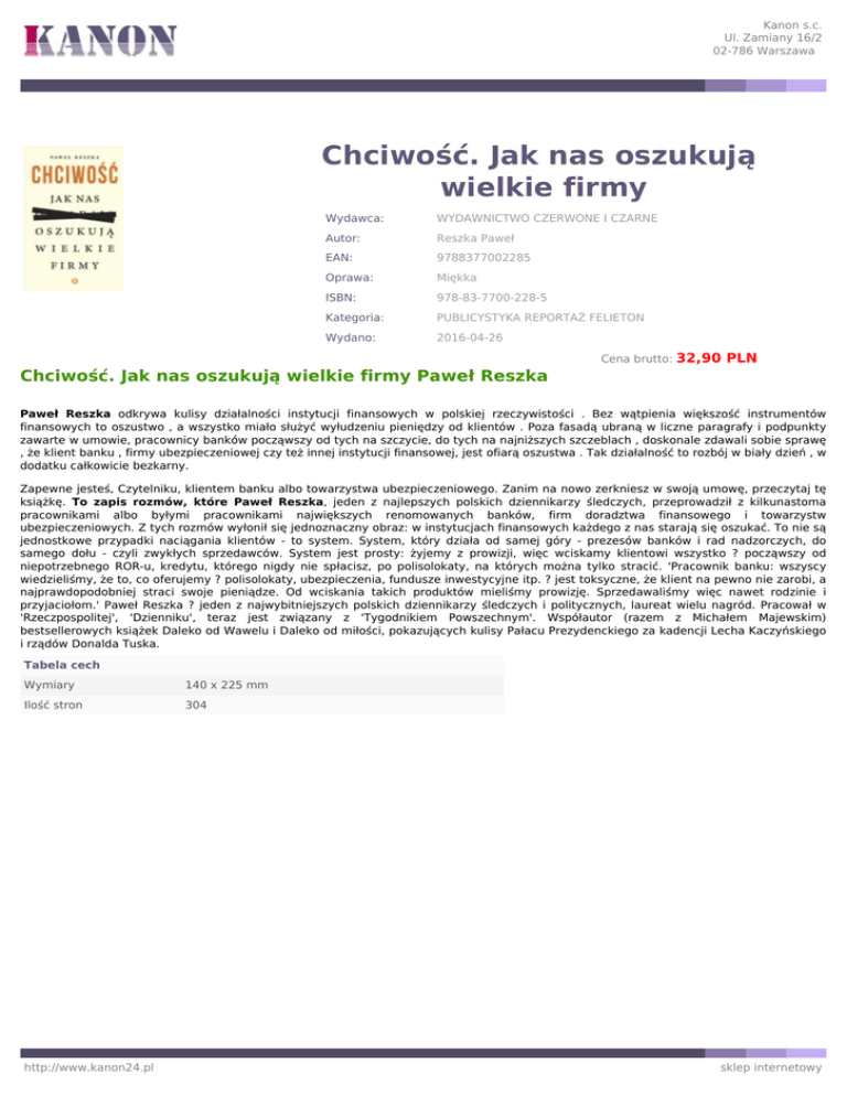 Kanon s.c. Ul. Zamiany 16/2 02-786 Warszawa Chciwość. Jak nas oszukują wielkie firmy Wydawca: WYDAWNICTWO CZERWONE I CZARNE Autor: Reszka Paweł EAN: 9788377002285 Oprawa: Miękka ISBN: 978-83-7700-228-5 Kategoria: PUBLICYSTYKA REPORTAŻ FELIETON Wydano: 2016-04-26 Cena brutto: 32,90 PLN Chciwość. Jak nas oszukują wielkie firmy Paweł Reszka Paweł Reszka odkrywa kulisy działalności instytucji finansowych w polskiej rzeczywistości . Bez wątpienia większość instrumentów finansowych to oszustwo , a wszystko miało służyć wyłudzeniu pieniędzy od klientów . Poza fasadą ubraną w liczne paragrafy i podpunkty zawarte w umowie, pracownicy banków począwszy od tych na szczycie, do tych na najniższych szczeblach , doskonale zdawali sobie sprawę , że klient banku , firmy ubezpieczeniowej czy też innej instytucji finansowej, jest ofiarą oszustwa . Tak działalność to rozbój w biały dzień , w dodatku całkowicie bezkarny. Zapewne jesteś, Czytelniku, klientem banku albo towarzystwa ubezpieczeniowego. Zanim na nowo zerkniesz w swoją umowę, przeczytaj tę książkę. To zapis rozmów, które Paweł Reszka, jeden z najlepszych polskich dziennikarzy śledczych, przeprowadził z kilkunastoma pracownikami albo byłymi pracownikami największych renomowanych banków, firm doradztwa finansowego i towarzystw ubezpieczeniowych. Z tych rozmów wyłonił się jednoznaczny obraz: w instytucjach finansowych każdego z nas starają się oszukać. To nie są jednostkowe przypadki naciągania klientów - to system. System, który działa od samej góry - prezesów banków i rad nadzorczych, do samego dołu - czyli zwykłych sprzedawców. System jest prosty: żyjemy z prowizji, więc wciskamy klientowi wszystko ? począwszy od niepotrzebnego ROR-u, kredytu, którego nigdy nie spłacisz, po polisolokaty, na których można tylko stracić. 'Pracownik banku: wszyscy wiedzieliśmy, że to, co oferujemy ? polisolokaty, ubezpieczenia, fundusze inwestycyjne itp. ? jest toksyczne, że klient na pewno nie zarobi, a najprawdopodobniej straci swoje pieniądze. Od wciskania takich produktów mieliśmy prowizję. Sprzedawaliśmy więc nawet rodzinie i przyjaciołom.' Paweł Reszka ? jeden z najwybitniejszych polskich dziennikarzy śledczych i politycznych, laureat wielu nagród. Pracował w 'Rzeczpospolitej', 'Dzienniku', teraz jest związany z 'Tygodnikiem Powszechnym'. Współautor (razem z Michałem Majewskim) bestsellerowych książek Daleko od Wawelu i Daleko od miłości, pokazujących kulisy Pałacu Prezydenckiego za kadencji Lecha Kaczyńskiego i rządów Donalda Tuska. Tabela cech Wymiary 140 x 225 mm Ilość stron 304 http://www.kanon24.pl sklep internetowy