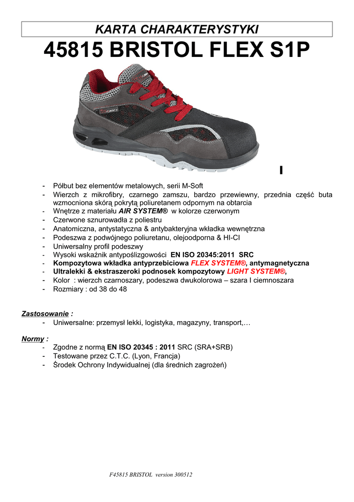 KARTA CHARAKTERYSTYKI 45815 BRISTOL FLEX S1P - - - Półbut bez elementów metalowych, serii M-Soft Wierzch z mikrofibry, czarnego zamszu, bardzo przewiewny, przednia część buta wzmocniona skórą pokrytą poliuretanem odpornym na obtarcia Wnętrze z materiału AIR SYSTEM® w kolorze czerwonym Czerwone sznurowadła z poliestru Anatomiczna, antystatyczna & antybakteryjna wkładka wewnętrzna Podeszwa z podwójnego poliuretanu, olejoodporna & HI-CI Uniwersalny profil podeszwy Wysoki wskaźnik antypoślizgowości EN ISO 20345:2011 SRC Kompozytowa wkładka antyprzebiciowa FLEX SYSTEM®, antymagnetyczna Ultralekki & ekstraszeroki podnosek kompozytowy LIGHT SYSTEM®, Kolor : wierzch czarnoszary, podeszwa dwukolorowa – szara I ciemnoszara Rozmiary : od 38 do 48 Zastosowanie : - Uniwersalne: przemysł lekki, logistyka, magazyny, transport,… Normy : - - Zgodne z normą EN ISO 20345 : 2011 SRC (SRA+SRB) Testowane przez C.T.C. (Lyon, Francja) Środek Ochrony Indywidualnej (dla średnich zagrożeń) F45815 BRISTOL version 300512