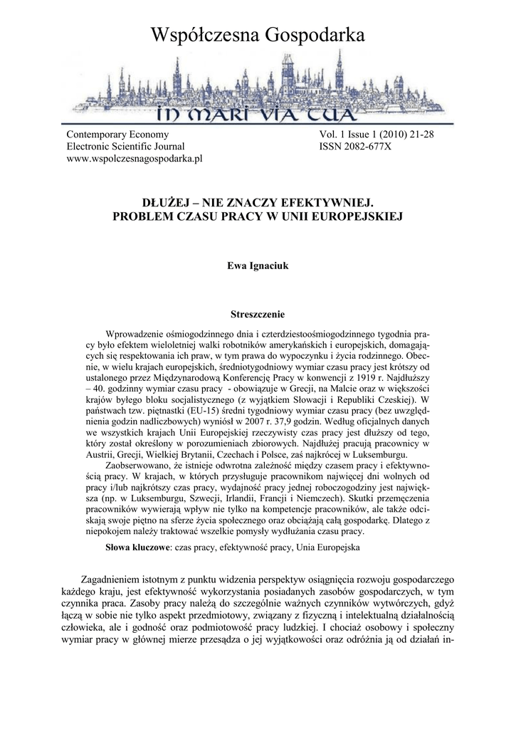 Współczesna Gospodarka Contemporary Economy Electronic Scientific Journal www.wspolczesnagospodarka.pl Vol. 1 Issue 1 (2010) 21-28 ISSN 2082-677X DŁUŻEJ – NIE ZNACZY EFEKTYWNIEJ. PROBLEM CZASU PRACY W UNII EUROPEJSKIEJ Ewa Ignaciuk Streszczenie Wprowadzenie ośmiogodzinnego dnia i czterdziestoośmiogodzinnego tygodnia pracy było efektem wieloletniej walki robotników amerykańskich i europejskich, domagających się respektowania ich praw, w tym prawa do wypoczynku i życia rodzinnego. Obecnie, w wielu krajach europejskich, średniotygodniowy wymiar czasu pracy jest krótszy od ustalonego przez Międzynarodową Konferencję Pracy w konwencji z 1919 r. Najdłuższy – 40. godzinny wymiar czasu pracy - obowiązuje w Grecji, na Malcie oraz w większości krajów byłego bloku socjalistycznego (z wyjątkiem Słowacji i Republiki Czeskiej). W państwach tzw. piętnastki (EU-15) średni tygodniowy wymiar czasu pracy (bez uwzględnienia godzin nadliczbowych) wyniósł w 2007 r. 37,9 godzin. Według oficjalnych danych we wszystkich krajach Unii Europejskiej rzeczywisty czas pracy jest dłuższy od tego, który został określony w porozumieniach zbiorowych. Najdłużej pracują pracownicy w Austrii, Grecji, Wielkiej Brytanii, Czechach i Polsce, zaś najkrócej w Luksemburgu. Zaobserwowano, że istnieje odwrotna zależność między czasem pracy i efektywnością pracy. W krajach, w których przysługuje pracownikom najwięcej dni wolnych od pracy i/lub najkrótszy czas pracy, wydajność pracy jednej roboczogodziny jest największa (np. w Luksemburgu, Szwecji, Irlandii, Francji i Niemczech). Skutki przemęczenia pracowników wywierają wpływ nie tylko na kompetencje pracowników, ale także odciskają swoje piętno na sferze życia społecznego oraz obciążają całą gospodarkę. Dlatego z niepokojem należy traktować wszelkie pomysły wydłużania czasu pracy. Słowa kluczowe: czas pracy, efektywność pracy, Unia Europejska Zagadnieniem istotnym z punktu widzenia perspektyw osiągnięcia rozwoju gospodarczego każdego kraju, jest efektywność wykorzystania posiadanych zasobów gospodarczych, w tym czynnika praca. Zasoby pracy należą do szczególnie ważnych czynników wytwórczych, gdyż łączą w sobie nie tylko aspekt przedmiotowy, związany z fizyczną i intelektualną działalnością człowieka, ale i godność oraz podmiotowość pracy ludzkiej. I chociaż osobowy i społeczny wymiar pracy w głównej mierze przesądza o jej wyjątkowości oraz odróżnia ją od działań in- 22 Ewa Ignaciuk nych czynników produkcji, to bardzo często, w stosunkach pracy, podkreśla się jedynie jej ekonomiczny i techniczny charakter. Pierwotnie pracowano zgodnie z naturalnym rytmem dobowym – od wschodu słońca do jego zachodu. Czas przerwy w pracy był nierozerwalnie związany z uroczystościami i świętami religijnymi oraz ważnymi wydarzeniami społecznymi. Pierwsze próby wprowadzenia regulacji czasu pracy przeprowadzone zostały przez króla Anglii Edwarda III w 1349 r. Zawarte w Statute of Labores regulacje określały czas pracy w okresie od marca do września między godziną piątą rano i siódmą lub ósmą wieczorem1. Rozwój industrializacji przyczynił się do wydłużenia czasu pracy tak, że na początku XIX wieku sięgał on nawet 16 godzin dziennie2. W wyniku nasilających się protestów robotników walczących o poprawę warunków pracy Międzynarodowa Organizacja Pracy, na swojej pierwszej Konwencji zwołanej przez rząd Stanów Zjednoczonych w Waszyngtonie 29 października 1919 r., postanowiła przyjąć wnioski dotyczące stosowania zasady ośmiogodzinnego dnia i czterdziestoośmiogodzinnego tygodnia pracy w przemyśle. Wskazany przez MOP ośmiogodzinny limit czasu pracy nie dotyczył jednak : (1) osób zajmujących stanowiska nadzoru lub kierownicze; (2) pracy zmianowej oraz (3) pracowników, których czas pracy w jednym lub kilku dniach tygodnia był krótszy od ośmiu godzin (jednak z zastrzeżeniem, że w dniu, w którym następuje wyrównanie średniotygodniowego wymiaru czasu pracy do 48 godzin, dzienny limit ośmiu godzin nie może być przekroczony o więcej niż jedną godzinę)3. Współcześnie, w większości krajów Europy Zachodniej, czas pracy regulowany jest przez układy zbiorowe pracy4. Zgodnie z obowiązującymi w Polsce uregulowaniami prawnymi5 czasem pracy jest czas, w którym pracownik pozostaje w dyspozycji pracodawcy w zakładzie pracy lub w innym miejscu wyznaczonym do wykonywania pracy. Czas ten nie może przekraczać 8 godzin na dobę i przeciętnie 40 godzin w przeciętnie pięciodniowym tygodniu pracy w przyjętym okresie rozliczeniowym nieprzekraczającym 4 miesięcy, z zastrzeżeniem art. 129 § 2 oraz art. 135-138, 143 i 144 Kodeksu pracy6. Podobnie jak w Polsce, 40 godzinny tydzień pracy obowiązuje w części krajów byłego bloku socjalistycznego (Bułgarii, Estonii, Słowenii, Rumunii, Łotwie, Litwie i Węgrzech) oraz w Grecji i na Malcie. Najkrótszy ustawowy czas pracy, pracownika zatrudnionego w pełnym wymiarze godzin, przyjęto w Wielkiej Brytanii (37,3), Danii (37) i Francji (35) (rysunek 1). 1 por. Encyklopedia nauczania społecznego Jana Pawła II, red. A. Zwoliński, Polskie Wydawnictwo Encyklopedyczne, Radom 2003, s.80. 2 tamże. 3 Konwencja nr 1 Międzynarodowej Organizacji Pracy z dnia 29 października 1919 r. http://www.mop.pl/html/miedzynarodowe_standardy/konwencje.html, informacja z dnia 31.10.2010. 4 A. Dziech, Czas pracy, http://mfiles.pl/pl/index.php/Czas_pracy, informacja z dnia 31.10.2010. 5 6 Art. 128 § 1. Kodeksu pracy. Art. 129 Kodeksu pracy. Dłużej – nie znaczy efektywniej. Problem czasu pracy w Unii Europejskiej 23 NMS10 – 10 krajów, które dołączyły do UE w 2004 r. NMS12 – NMS10 + Rumunia i Bułgaria Rysunek. 1. Średni tygodniowy wymiar czasu pracy pracowników zatrudnionych w pełnym wymiarze czasu pracy w krajach Unii Europejskiej i Norwegii, uzgodniony w porozumieniach zbiorowych w