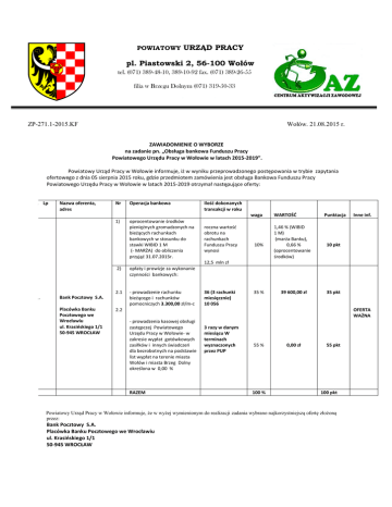 POWIATOWY URZĄD PRACY pl. Piastowski 2, 56-100 Wołów tel. (071) 389-48-10, 389-10-92 fax. (071) 389-26-55 filia w Brzegu Dolnym (071) 319-50-33 [email protected] www.pupwolow.pl Wołów. 21.08.2015 r. ZP-271.1-2015.KF ZAWIADOMIENIE O WYBORZE na zadanie pn. „Obsługa bankowa Funduszu Pracy Powiatowego Urzędu Pracy w Wołowie w latach 2015-2019”. Powiatowy Urząd Pracy w Wołowie informuje, iż w wyniku przeprowadzonego postępowania w trybie zapytania ofertowego z dnia 05 sierpnia 2015 roku, gdzie przedmiotem zamówienia jest obsługa Bankowa Funduszu Pracy Powiatowego Urzędu Pracy w Wołowie w latach 2015-2019 otrzymał następujące oferty: L Lp Nazwa oferenta, adres Nr Operacja bankowa 1) oprocentowanie środków pieniężnych gromadzonych na bieżących rachunkach bankowych w stosunku do stawki WIBID 1 M (- MARŻA) do obliczenia przyjąć 31.07.2015r. Ilość dokonanych transakcji w roku waga roczna wartość obrotu na rachunkach Funduszu Pracy wynosi 10% WARTOŚĆ 1,46 % (WIBID 1 M) (marża Banku), 0,66 % (oprocentowanie środków) Punktacja Inne inf. 10 pkt 12,5 mln zł 1. 2) opłaty i prowizje za wykonanie czynności bankowych: 2.1 - prowadzenie rachunku bieżącego i rachunków pomocniczych 3.300,00 zł/m-c Bank Pocztowy S.A. Placówka Banku Pocztowego we Wrocławiu ul. Krasińskiego 1/1 50-945 WROCŁAW 36 (3 rachunki miesięcznie) 10 056 35 % 39 600,00 zł 35 pkt 2.2 OFERTA WAŻNA - prowadzenia kasowej obsługi zastępczej Powiatowego Urzędu Pracy w Wołowie- w zakresie wypłat gotówkowych zasiłków i innych świadczeń dla bezrobotnych na podstawie list wypłat na terenie miasta Wołów i miasta Brzeg Dolny określona w 0,00 % RAZEM 3 razy w danym miesiącu W terminach wyznaczonych przez PUP 55 % 100 % 0,00 zł 55 pkt 100 pkt Powiatowy Urząd Pracy w Wołowie informuje, że w wyżej wymienionym do realizacji zadania wybrano najkorzystniejszą ofertę złożoną przez: Bank Pocztowy S.A. Placówka Banku Pocztowego we Wrocławiu ul. Krasińskiego 1/1 50-945 WROCŁAW Uzasadnienie wyboru: Oferent uzyskał największą ilość punktów i złożył wymagany komplet dokumentów. Wybrany wykonawca zobowiązany jest skontaktować się z Zamawiającym w sprawie podpisania umowy. p. o Dyrektor PUP Robert Stępień __________________________ Kierownik Zamawiającego do wiadomości: - wszyscy uczestnicy postępowania - a/a (Dział KF)