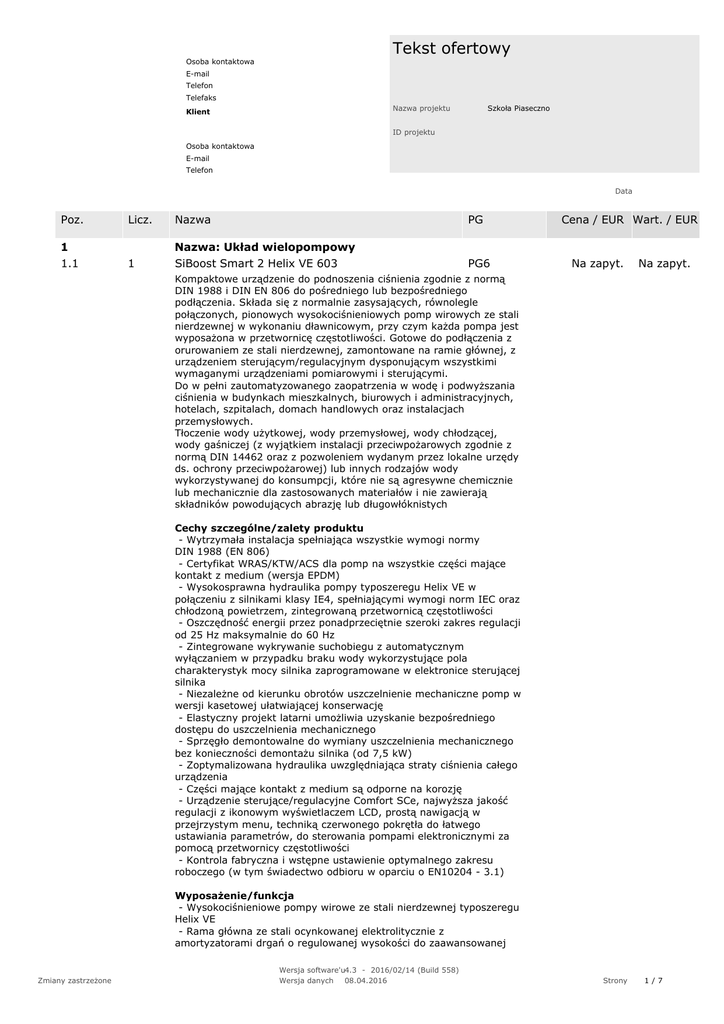 Tekst ofertowy Osoba kontaktowa E-mail Telefon Telefaks Nazwa projektu Klient Szkoła Piaseczno ID projektu Osoba kontaktowa E-mail Telefon Data Poz. 1 1.1 Licz. Nazwa PG 10-06-2016 Cena / EUR Wart. / EUR Nazwa: Układ wielopompowy 1 SiBoost Smart 2 Helix VE 603 PG6 Na zapyt. Na zapyt. Kompaktowe urządzenie do podnoszenia ciśnienia zgodnie z normą DIN 1988 i DIN EN 806 do pośredniego lub bezpośredniego podłączenia. Składa się z normalnie zasysających, równolegle połączonych, pionowych wysokociśnieniowych pomp wirowych ze stali nierdzewnej w wykonaniu dławnicowym, przy czym każda pompa jest wyposażona w przetwornicę częstotliwości. Gotowe do podłączenia z orurowaniem ze stali nierdzewnej, zamontowane na ramie głównej, z urządzeniem sterującym/regulacyjnym dysponującym wszystkimi wymaganymi urządzeniami pomiarowymi i sterującymi. Do w pełni zautomatyzowanego zaopatrzenia w wodę i podwyższania ciśnienia w budynkach mieszkalnych, biurowych i administracyjnych, hotelach, szpitalach, domach handlowych oraz instalacjach przemysłowych. Tłoczenie wody użytkowej, wody przemysłowej, wody chłodzącej, wody gaśniczej (z wyjątkiem instalacji przeciwpożarowych zgodnie z normą DIN 14462 oraz z pozwoleniem wydanym przez lokalne urzędy ds. ochrony przeciwpożarowej) lub innych rodzajów wody wykorzystywanej do konsumpcji, które nie są agresywne chemicznie lub mechanicznie dla zastosowanych materiałów i nie zawierają składników powodujących abrazję lub długowłóknistych Cechy szczególne/zalety produktu - Wytrzymała instalacja spełniająca wszystkie wymogi normy DIN 1988 (EN 806) - Certyfikat WRAS/KTW/ACS dla pomp na wszystkie części mające kontakt z medium (wersja EPDM) - Wysokosprawna hydraulika pompy typoszeregu Helix VE w połączeniu z silnikami klasy IE4, spełniającymi wymogi norm IEC oraz chłodzoną powietrzem, zintegrowaną przetwornicą częstotliwości - Oszczędność energii przez ponadprzeciętnie szeroki zakres regulacji od 25 Hz maksymalnie do 60 Hz - Zintegrowane wykrywanie suchobiegu z automatycznym wyłączaniem w przypadku braku wody wykorzystujące pola charakterystyk mocy silnika zaprogramowane w elektronice sterującej silnika - Niezależne od kierunku obrotów uszczelnienie mechaniczne pomp w wersji kasetowej ułatwiającej konserwację - Elastyczny projekt latarni umożliwia uzyskanie bezpośredniego dostępu do uszczelnienia mechanicznego - Sprzęgło demontowalne do wymiany uszczelnienia mechanicznego bez konieczności demontażu silnika (od 7,5 kW) - Zoptymalizowana hydraulika uwzględniająca straty ciśnienia całego urządzenia - Części mające kontakt z medium są odporne na korozję - Urządzenie sterujące/regulacyjne Comfort SCe, najwyższa jakość regulacji z ikonowym wyświetlaczem LCD, prostą nawigacją w przejrzystym menu, techniką czerwonego pokrętła do łatwego ustawiania parametrów, do sterowania pompami elektronicznymi za pomocą przetwornicy częstotliwości - Kontrola fabryczna i wstępne ustawienie optymalnego zakresu roboczego (w tym świadectwo odbioru w oparciu o EN10204 - 3.1) Wyposażenie/funkcja - Wysokociśnieniowe pompy wirowe ze stali nierdzewnej typoszeregu Helix VE - Rama główna ze stali ocynkowanej elektrolitycznie z amortyzatorami drgań o regulowanej wysokości do zaawansowanej Zmiany zastrzeżone Wersja software'u4.3 - 2016/02/14 (Build 558) Wersja danych 08.04.2016 Strony 1/ 7 Tekst ofertowy Osoba kontaktowa E-mail Telefon Telefaks Klient Nazwa projektu Szkoła Piaseczno ID projektu Osoba kontaktowa E-mail Telefon Data Poz. Licz. Nazwa PG 10-06-2016 Cena / EUR Wart. / EUR izolacji dźwiękochłonnej - Zawór odcinający po stronie ssawnej i tłocznej każdej pompy - Zabezpieczenie przed przepływem zwrotnym po stronie tłocznej każdej pompy - Ciśnieniowe naczynie przeponowe 8 l, PN16 z armaturą przelotową zgodnie z DIN 4807, strona ciśnieniowa - Czujnik ciśnienia (4-20 mA), strona ciśnieniowa - Manometr, po stronie tłocznej - Automatyczne sterowanie pompą za pomocą całkowicie elektronicznego urządzenia Smart-Controller (SCe) w obudowie z blachy stalowej, stopień ochrony IP 54, składa się z wewnętrznego układu zasilania napięciem sterującym, mikroprocesora z Soft PLC, analogowych i cyfrowych modułów wejść i wyjść, do sterowania pompami elektronicznymi za pomocą przetwornicy częstotliwości W celu ułatwienia konserwacji, zalecany obszar roboczy wokół instalacji powinien wynosić 1 metr. Obsługa/wskaźnik - Wyświetlacz LCD (podświetlany) do wskazywania danych roboczych, parametrów regulatora, stanów roboczych pomp, komunikatów o awarii i danych z pamięci - Opis menu z symbolami i numerami - Diody do wskazywania stanu urządzenia (praca/usterka) - Wstępnie ustawione fabrycznie parametry ułatwiające uruchamianie - Ustawienie parametrów roboczych i potwierdzanie komunikatów o awarii z wykorzystaniem techniki czerwonego pokrętła - Zamykany wyłącznik główny - Praca z/bez pompy rezerwowej do wyboru za pośrednictwem obsługi Klienta - Licznik godzin pracy dla każdej pompy i całej instalacji - Licznik cykli przełączania dla każdej pompy i całej instalacji - Pamięć ostatnich 16 usterek Regulacja - W pełni automatyczna regulacja od 1 do 4 regulowanych częstotliwością pomp poprzez porównanie wartości zadanej/rzeczywistej - Przełączanie wartości zadanej, 2. wartość zadana włączana za pomocą styku - Zewnętrzna zdalna regulacja wartości zadanej za pośrednictwem sygnału 4-20 mA - Automatyczne, zależne od obciążenia dołączenie od 1 do n pomp(y) obciążenia szczytowego w zależności od wielkości regulowanej ciśnienia – constant, p-c - 2 zestawy parametrów do wyboru, menu Easy, (wartość zadana i rodzaj regulacji) lub menu Expert (parametry robocze i regulatora) - Dowolny wybór trybu pracy pomp (ręczy, wył., automatyczny) - Automatyczna, ustawiana zamiana pomp - Standardowe ustawienie: Impuls Za każdym raz
