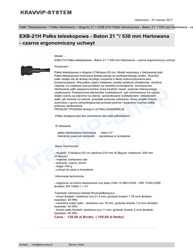 Utworzono : 07 marzec 2017 Pałki Teleskopowe > Pałka Hartowana > długość 21 > EXB-21H Pałka teleskopowa - Baton 21 "/ 530 mm Hartowana - cz EXB-21H Pałka teleskopowa - Baton 21 "/ 530 mm Hartowana - czarna ergonomiczny uchwyt Model : EXB-21H Pałka teleskopowa - Baton 21 "/ 530 mm Hartowana - czarna ergonomiczny uchwyt Producent : Pałka teleskopowa o długości 21”/53 cm. Model wykonany z hartowanej stali. Pałka teleskopowa hartowana wersja do profesjonalnego użytku. Rozmiar pałki nadaje się do ukrytego noszenia a także wykorzystywania jako kubaton/yawara. Wszystkie części metalowe zostały poddane dodatkowej obróbce cieplnej, co zwiększa wytrzymałość na wszelkie przeciążenia mechaniczne. Hartowanie pałki zapewnia bardzo dużą trwałość nawet podczas intensywnego użytkowania. Powierzchnia elementów rozkładanych jest chromowana na czarno, dzięki czemu są odporne na otarcia spowodowane rozkładaniem i składaniem pałki, jak również na otarcia powstałe podczas uderzania. Nowy projekt chwytu wykonany z gumy (antyalergicznej) pozwala pewnie i wygodnie trzymać pałkę podczas użytkowania. PRODUKT POSIADA 2 LETNIĄ GWARANCJĘ h S P Pałka dostępna jest bez zezwolenia dla osób pełnoletnich. I V v W Zestawie: pałka teleskopowa hartowana futerał do pasa lub kamizelki a r p o baton 21'' sprzętowej w komplecie. Dane Techniczne: K - długość: 21”/53 cm (złożona:210 mm /8,3" rozłożona: 530 mm /21") - materiał: hartowana stal - pokrycie: czarny chrom - waga: 440 g - uchwyt do pasa w komplecie Informacje techniczne: - ciągnione na zimno bezszwowe rury klasy CSN 12 060=CK55 - DIN 17200,C55E – EN 10083-1 + A1 Twardość mierzona metoda Rockwell’a - chwyt – (średnica rury 21,4 mm, grubość ścianki 1,75 mm) – twardość: 40 HRc - centralna część pałki - (średnica rury 16 mm, grubość ścianki 1,5 mm) – twardość: 44 HRc - koniec pałki – (średnica rury 11 mm, grubość ścianki 2 mm) – twardość: 50 HRc Cena : 130,00 zł Brutto ( 105,69 zł Netto) kontakt : - [email protected] Strona 1/{nb} Utworzono : 07 marzec 2017 Pałki Teleskopowe > Pałka Hartowana > długość 21 > EXB-21H Pałka teleskopowa - Baton 21 "/ 530 mm Hartowana - cz EXB-21H Pałka teleskopowa - Baton 21 "/ 530 mm Hartowana - czarna ergonomiczny uchwyt Dostępność: Produkt dostępny w naszym sklepie od 19 listopad 2010 K h S P I V v a r kontakt : - [email protected] Strona 2/{nb} p o