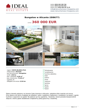 telefon 0034 603 390 766 telefon 0034 616 954 502 telefon biuro 0034 865 68 79 45 [email protected] www.nieruchomosci-hiszpania.com Bungalow w Alicante (ID8677) cena: region: COSTA BLANCA PLD. miejscowość: Alicante typ nieruchomości: Bungalow rynek: wtórny pow. użytkowa: 0.00 m2 pow. konstrukcji: 75.00 m2 sypialnie: 4 odległość od morza: 0.50 km 360 000 EUR klimatyzacja umeblowanie kuchnia oddzielna AGD balkon taras solarium parking garaz ogród basen Piękny domek położony na terenie Cabo Huertas w Alicante, zaledwie kilka metrów od morza. Przy wejsciu do domu znajduje sie składzik, salon z jadalnią z balkonem z widokiem na basen i ogród, kuchnia z wyjsciem na ogród. Na piętrze są trzy sypialnie, i łazienka. Garaż posiada bezposrednie wejscie z domu gdzie dodatkowo znajdziemy pokoj goscinny z łazienką. Side 1 / 2 To bardzo ekskluzywne osiedle na zamknietym terenie gdzie znajdziemy piękne ogrody i prywatny basen. www.nieruchomosci-hiszpania.com Side 2 / 2 Powered by TCPDF (www.tcpdf.org)