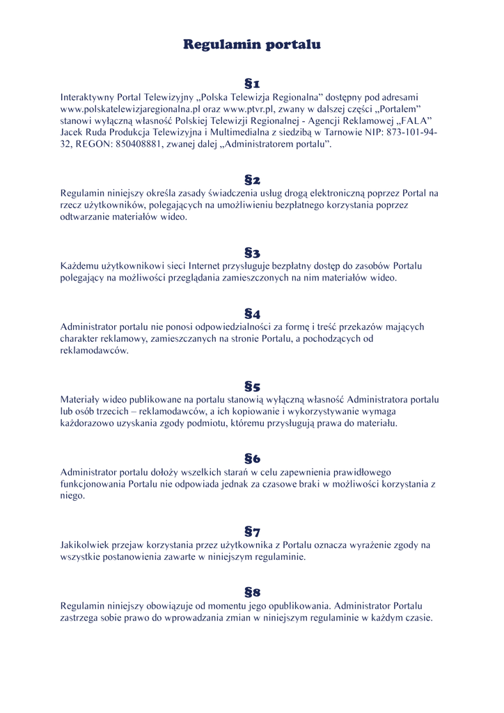 Regulamin portalu §1 Interaktywny Portal Telewizyjny „Polska Telewizja Regionalna” dostępny pod adresami www.polskatelewizjaregionalna.pl oraz www.ptvr.pl, zwany w dalszej części „Portalem” stanowi wyłączną własność Polskiej Telewizji Regionalnej - Agencji Reklamowej „FALA” Jacek Ruda Produkcja Telewizyjna i Multimedialna z siedzibą w Tarnowie NIP: 873-101-9432, REGON: 850408881, zwanej dalej „Administratorem portalu”. §2 Regulamin niniejszy określa zasady świadczenia usług drogą elektroniczną poprzez Portal na rzecz użytkowników, polegających na umożliwieniu bezpłatnego korzystania poprzez odtwarzanie materiałów wideo. §3 Każdemu użytkownikowi sieci Internet przysługuje bezpłatny dostęp do zasobów Portalu polegający na możliwości przeglądania zamieszczonych na nim materiałów wideo. §4 Administrator portalu nie ponosi odpowiedzialności za formę i treść przekazów mających charakter reklamowy, zamieszczanych na stronie Portalu, a pochodzących od reklamodawców. §5 Materiały wideo publikowane na portalu stanowią wyłączną własność Administratora portalu lub osób trzecich – reklamodawców, a ich kopiowanie i wykorzystywanie wymaga każdorazowo uzyskania zgody podmiotu, któremu przysługują prawa do materiału. §6 Administrator portalu dołoży wszelkich starań w celu zapewnienia prawidłowego funkcjonowania Portalu nie odpowiada jednak za czasowe braki w możliwości korzystania z niego. §7 Jakikolwiek przejaw korzystania przez użytkownika z Portalu oznacza wyrażenie zgody na wszystkie postanowienia zawarte w niniejszym regulaminie. §8 Regulamin niniejszy obowiązuje od momentu jego opublikowania. Administrator Portalu zastrzega sobie prawo do wprowadzania zmian w niniejszym regulaminie w każdym czasie.