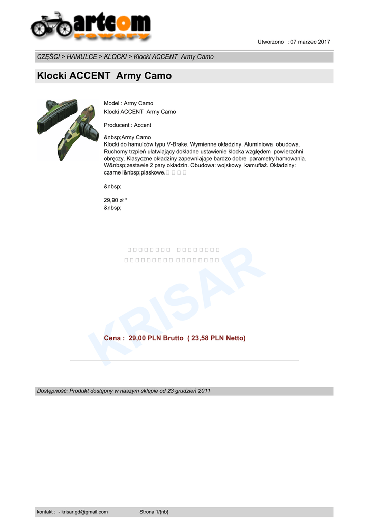 Utworzono : 07 marzec 2017 CZĘŚCI > HAMULCE > KLOCKI > Klocki ACCENT Army Camo Klocki ACCENT Army Camo Model : Army Camo Klocki ACCENT Army Camo Producent : Accent Army Camo Klocki do hamulców typu V-Brake. Wymienne okładziny. Aluminiowa obudowa. Ruchomy trzpień ułatwiający dokładne ustawienie klocka względem powierzchni obręczy. Klasyczne okładziny zapewniające bardzo dobre parametry hamowania. W zestawie 2 pary okładzin. Obudowa: wojskowy kamuflaż. Okładziny: czarne i piaskowe. 29,90 zł * R A K S I R Cena : 29,00 PLN Brutto ( 23,58 PLN Netto) Dostępność: Produkt dostępny w naszym sklepie od 23 grudzień 2011 kontakt : - [email protected] Strona 1/{nb}