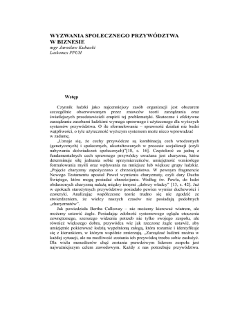 WYZWANIA SPOŁECZNEGO PRZYWÓDZTWA W BIZNESIE mgr Jarosław Kubacki Laskomex PPUH Wstęp Czynnik ludzki jako najcenniejszy zasób organizacji jest obszarem szczególnie obserwowanym przez znawców teorii zarządzania oraz światlejszych przedstawicieli empirii tej problematyki. Skuteczne i efektywne zarządzanie zasobami ludzkimi wymaga sprawnego i użytecznego dla wyższych systemów przywództwa. O ile sformułowanie – sprawność działań nie budzi wątpliwości, o tyle użyteczność wyższym systemom może nieco wprowadzać w zadumę. „Uznaje się, że cechy przywódcze są kombinacją cech wrodzonych (genetycznych) i społecznych, ukształtowanych w procesie socjalizacji (czyli nabywania doświadczeń społecznych)”[18, s. 16]. Częstokroć za jedną z fundamentalnych cech sprawnego przywódcy uważana jest charyzma, która determinuje siłę jednania sobie sprzymierzeńców, umiejętność wzniosłego formułowania myśli oraz wpływania na mniejsze lub większe grupy ludzkie. „Pojęcie charyzmy zapożyczono z chrześcijaństwa. W pewnym fragmencie Nowego Testamentu apostoł Paweł wymienia charyzmaty, czyli dary Ducha Świętego, które mogą posiadać chrześcijanie. Według św. Pawła, do ludzi obdarzonych charyzmą należą między innymi „dobrzy władcy” [13, s. 42]. Już w epokach starożytnych przywództwo posiadało pewien wymiar duchowości i ezoteryki. Analizując współczesne teorie trudno się nie zgodzić ze stwierdzeniem, że wielcy naszych czasów nie posiadają podobnych „charyzmatów”. Jak powiedziała Bertha Calloway – nie możemy kierować wiatrem, ale możemy ustawić żagle. Posiadając zdolność systemowego oglądu otoczenia zewnętrznego, szerszego widzenia potrzeb nie tylko swojego zespołu, ale również większego dobra, przywódca wie jak rzeczone żagle ustawić, aby umiejętnie pokierować łodzią wypełnioną załogą, która rozumie i identyfikuje się z kierunkiem, w którym wspólnie zmierzają. „Zarządzać ludźmi można w każdej sytuacji, ale na możliwość zostania ich przywódcą trzeba sobie zasłużyć. Dla wielu menedżerów chęć zostania prawdziwym liderem zespołu jest najważniejszym celem zawodowym. Każdy z nas potrzebuje przywództwa. Jeżeli nie znajdujemy go w swoim najbliższym otoczeniu, zaczynamy szukać na zewnątrz. To przywódcy (a nie przełożeni) potrafią wzbudzić w nas zapał, zaangażować, pociągnąć za sobą i przekonać do jakiejś sprawy. Doprowadzają do zmian” [19, s. 85-86]. Przedstawiona orientacja jest elementarnym czynnikiem ewolucji każdej organizacji, który determinuje jej przetrwanie. Według Karola Darwina tym, który przetrwa, nie jest gatunek najsilniejszy ani najbardziej inteligentny, lecz najlepiej reagujący na zmianę. Turbulentne otoczenie „zaakceptuje” tylko tych, którzy potrafią się dostosować do jego wymagań. Kształtowanie świadomości zespołów w zakresie szybkozmiennych warunków, a co najważniejsze akceptacji takiego stanu rzeczy, leży oczywiście po stronie przywódców, którzy w pierwszej kolejności sami muszą zrozumieć tę ciągłość zmian. Trendem wydaje się być konieczność przeformułowania istniejącego do tej pory systemu społeczno-ekonomicznego, a tym również modelu przywództwa. Celem referatu jest wskazanie nowatorskiego oglądu zagadnienia przywództwa, jako działanie w służbie systemom wyższej hierarchii. Podejście takie jest przyczynkiem do postawienia hipotezy, że obok kompetencji profesjonalnych i emocjonalnych przywódcę cechować musi nie tylko umiejętność realizacji celów swojej organizacji, ale również celów struktur wyższego rzędu np.: społeczności lokalnej, branży, państwa czy wreszcie celów działalności w skali globalnej. Przedmiotem opracowania jest uniwersalny system kierowania, zaś obiektem – przywództwo społeczne. Niniejsze opracowanie prezentuje aspekt empiryczny użyteczności przywództwa, zdiagnozowany w łódzkim przedsiębiorstwie Laskomex. Przedstawia się w nim systemowe podejście do procesu kształtowania liderów przyszłości w kontekście zmian zachodzących w otoczeniu. 1. Kryzys przywództwa Przedstawiona teza znajduje zastosowanie w organizacjach, które posiadają jasno zdefiniowane misję, wizję oraz świadomość wybiegającą poza najniższe poziomy związane tylko z generowaniem przychodu. W sytuacji, gdy celem nadrzędnym przedsiębiorstwa jest zwrot z zainwestowanego kapitału nie możemy mówić o modelu przywództwa społecznego. Taka forma rozwoju jest domeną organizacji osiągających już pewien poziom świadomości, który nota bene przekłada się na wzrost ich efektywności. W dzisiejszych czasach problem kryzysu przywództwa stał się wręcz modny. Większość polemik z tego obszaru dotyka skuteczności działania przywódców na poziomie taktycznym, traktując o narzędziach edukacyjnych i relacyjnych mających ukształtować współczesnego lidera, a cały system służy wygenerowaniu większego przychodu dla przedsiębiorstwa. Podchodząc do tematu z nieco innej strony można zaryzykować stwierdzenie, że organizacja biznesowa funkcjonuje w celu edukacji liderów o profilu służebności społecznej, gromadzeniu przez nich doświadczeń i zagwarantowaniu ich firmom zrównoważonego rozwoju a zysk z przychodu jest tylko dodatkowym efektem jej działalności. Rozwój tego rodzaju przywództwa wpisany jest w katalog celów firmy Laskomex, które precyzuje Plan Strategiczny tego przedsiębiorstwa. Kryzys w opisywanym obszarze to przejaw niskiej świadomości społecznej w zakresie definiowania przywództwa, wyzwań jakie przed nim stoją, braku modelu wdrażania idei oraz strategii kolektywnej, a częstokroć również niewytworzenia właściwego systemu kształcenia sukcesorów. Jeżeli już uczy się podwładnych jak zostać prawdziwym liderem, to rozważyć należy jakie przykłady im się wskazuje. W firmie Laskomex w Systemie Sukcesji Przy