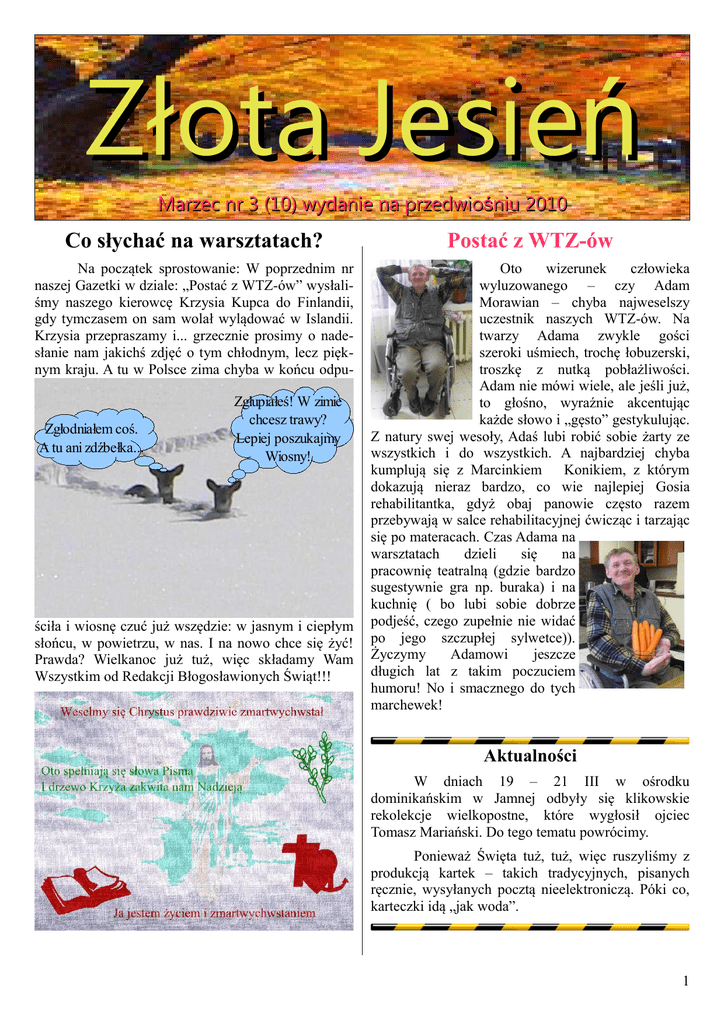 Złota Jesień Marzec nr 3 (10) wydanie na przedwiośniu 2010 Co słychać na warsztatach? Postać z WTZ-ów Na początek sprostowanie: W poprzednim nr naszej Gazetki w dziale: „Postać z WTZ-ów” wysłaliśmy naszego kierowcę Krzysia Kupca do Finlandii, gdy tymczasem on sam wolał wylądować w Islandii. Krzysia przepraszamy i... grzecznie prosimy o nadesłanie nam jakichś zdjęć o tym chłodnym, lecz pięknym kraju. A tu w Polsce zima chyba w końcu odpu- Oto wizerunek człowieka wyluzowanego – czy Adam Morawian – chyba najweselszy uczestnik naszych WTZ-ów. Na twarzy Adama zwykle gości szeroki uśmiech, trochę łobuzerski, troszkę z nutką pobłażliwości. Adam nie mówi wiele, ale jeśli już, to głośno, wyraźnie akcentując każde słowo i „gęsto” gestykulując. Z natury swej wesoły, Adaś lubi robić sobie żarty ze wszystkich i do wszystkich. A najbardziej chyba kumplują się z Marcinkiem Konikiem, z którym dokazują nieraz bardzo, co wie najlepiej Gosia rehabilitantka, gdyż obaj panowie często razem przebywają w salce rehabilitacyjnej ćwicząc i tarzając się po materacach. Czas Adama na warsztatach dzieli się na pracownię teatralną (gdzie bardzo sugestywnie gra np. buraka) i na kuchnię ( bo lubi sobie dobrze podjeść, czego zupełnie nie widać po jego szczupłej sylwetce)). Życzymy Adamowi jeszcze długich lat z takim poczuciem humoru! No i smacznego do tych marchewek! Zgłodniałem coś. A tu ani zdźbełka... Zgłupiałeś! W zimie chcesz trawy? Lepiej poszukajmy Wiosny! ściła i wiosnę czuć już wszędzie: w jasnym i ciepłym słońcu, w powietrzu, w nas. I na nowo chce się żyć! Prawda? Wielkanoc już tuż, więc składamy Wam Wszystkim od Redakcji Błogosławionych Świąt!!! Aktualności W dniach 19 – 21 III w ośrodku dominikańskim w Jamnej odbyły się klikowskie rekolekcje wielkopostne, które wygłosił ojciec Tomasz Mariański. Do tego tematu powrócimy. Ponieważ Święta tuż, tuż, więc ruszyliśmy z produkcją kartek – takich tradycyjnych, pisanych ręcznie, wysyłanych pocztą nieelektroniczą. Póki co, karteczki idą „jak woda”. 1 Nawracajcie się i wierzcie w Ewangelię! Środa Popielcowa rozpoczyna okres czterdziestodniowego przygotowania do największej chrześcijańskiej uroczystości - Świąt Paschalnych. Dwanaście uderzeń zegara oznacza, że oto nadeszła Środa Popielcowa, a wraz z nią — trwający czterdzieści dni — czas wyciszenia i refleksji. Okres ten służyć winien nie tylko wspominaniu wydarzeń opisanych przez ewangelistów. Jest on swego rodzaju zaproszeniem do podjęcia osobistego wysiłku, pokonywania własnych wad, zwrócenia baczniejszej uwagi na potrzeby otaczających nas ludzi, wreszcie — do duchowego wzrostu, który pomoże bardziej świadomie przeżyć Święta Wielkanocne. Przypominają o tym słowa jednego z tekstów mszalnych — prefacji, wykorzystywanej w czasie poprzedzającym święta Zmartwychwstania: „Albowiem pozwalasz Twoim wiernym, co roku z oczyszczoną duszą radośnie oczekiwać Świąt Wielkanocnych, Wielki Post, bo tak nazywa się ten okres, trwa do początku liturgii Mszy Wieczerzy Pańskiej sprawowanej w Wielki Czwartek. Już w II wieku, dla lepszego przygotowania do przeżycia Świąt Paschalnych, dodano dwa dni postu przed tym świętem. Zwyczaj ten istniał również w Galii: ku czci 40-dniowego postu Pana Jezusa był nakazany post 40-godzinny (obowiązywał zatem w Wielki Piątek i w Wielką Sobotę). W wieku III poszczono już cały tydzień. Wreszcie na początku wieku IV wprowadzono post 40-dniowy na pamiątkę postu Jezusa Chrystusa. jednak, a to dlatego, że soboty i niedziele były wolne od postu. W wieku VI w Rzymie post rozpoczynał się 6 tygodni przed Wielkanocą. Jednak po odliczeniu niedzieli, w które nigdy nie poszczono, post trwał właściwie tylko 36 dni. Dlatego w wieku VII dodano brakujące dni i wyznaczono, jako początek Wielkiego Postu Środę Popielcową. Liczba 40 stanowi w Piśmie świętym wyraz pewnej dłuższej całości, czasu przeznaczonego na jakieś konkretne zadanie człowieka lub zbawcze działanie Boga. W Wielkim Poście Kościół odczytuje i przeżywa nie tylko czterdzieści dni spędzonych przez Jezusa na pustyni na modlitwie i poście przed rozpoczęciem Jego publicznej misji, ale i trzy inne wielkie wydarzenia biblijne: czterdzieści dni powszechnego potopu, po których Bóg zawarł przymierze z Noem; czterdzieści lat pielgrzymowania Izraela po pustyni ku ziemi obiecanej; czterdzieści dni przebywania Mojżesza na Górze Synaj, gdzie otrzymał on od Jahwe Tablice Prawa. Sam zwyczaj posypywania głów popiołem na znak żałoby i pokuty, celebrowany w Środę Popielcową, znany jest w wielu kulturach i tradycjach, m. in. w starożytnym Egipcie, u Arabów i w Grecji. W 1091 r. papież Urban II wprowadził ten zwyczaj, jako obowiązujący w całym Kościele. W tym też czasie ustalono, że popiół do posypywania głów wiernych ma pochodzić z palm poświęconych w Niedzielę Palmową poprzedniego roku. „Pamiętaj, człowiecze, że prochem jesteś i w proch się obrócisz". Słowa te nawiązują do biblijnej Księgi Rodzaju, a dokładniej do fragmentu opisującego wygnanie z raju Adama i Ewy (Rdz 3,19). Przyjęcie popiołu oznacza pokorne 2 uznanie słabości ludzkiej wewnętrznego odrodzenia. oraz gotowość W okresie Wielkiego Postu, który jest czasem pokuty i nawrócenia, Kościół, przypominając słowa Jezusa, proponuje trzy drogi przybliżania się do Boga: post, jałmużnę i modlitwę. Liturgia tego okresu jest dość wyciszona. Dominującym kolorem szat liturgicznych jest fiolet. Z obrzędów Mszy świętej znika uroczysty hymn "Chwała na wysokości Bogu" (śpiewany jedynie w czasie uroczystości, np. św. Józefa - 19 marca, czy Zwiastowania Pańskiego - 25 marca). A radosne „Alleluja” śpiewana przed Ewangelią zastępuje aklamacja „Chwała Tobie, Królu wieków" albo „Chwała Tobie, Sło